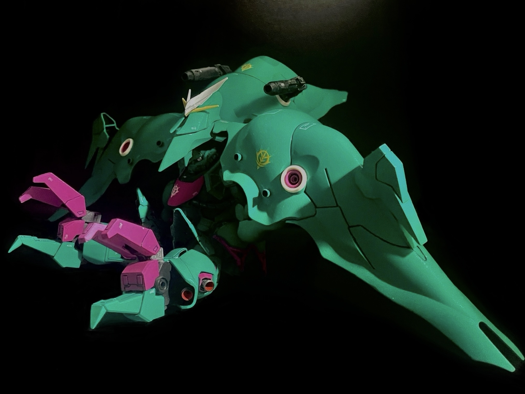 「光学センサーなんてなんでもいい」という割り切りと「ジオンの魂」としてのビジュアルから最先端機体の頭部がまさかのザクという原点回帰?原理主義?とどのつまりはザクへの愛を設定に捩じ込んだ作品へのリスペクト