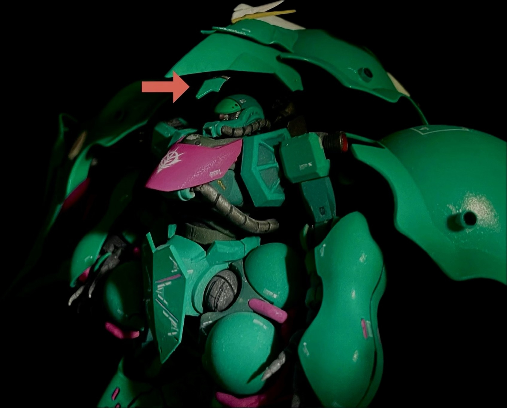 MSモード移行の際にはコアユニットであるザク頭部に大型テールバインダー内のサイコミュ送受信器を直結するコネクタとしてフェイスマスクパーツ(赤矢印)が折り畳み格納されていた状態から展開
