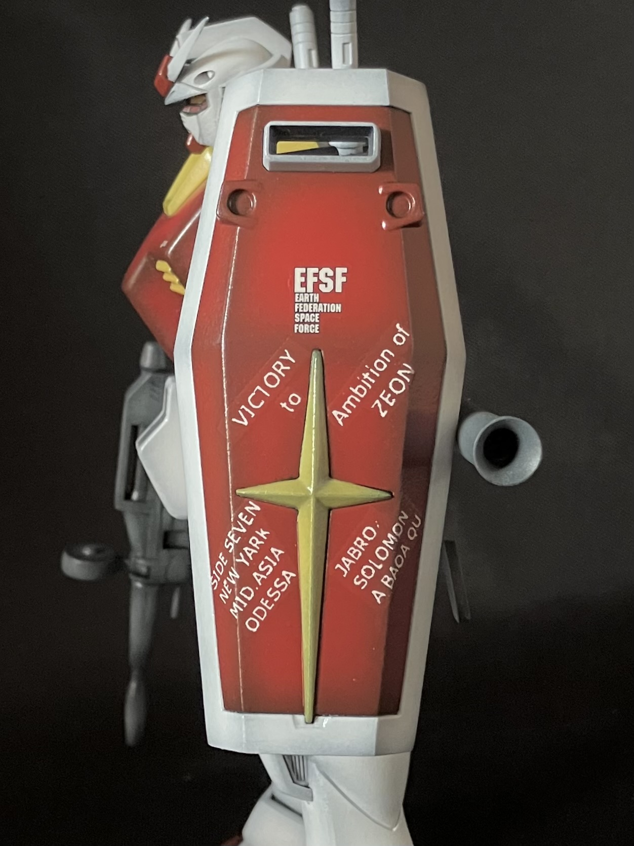 ガンダムが戦った戦場を列挙した特徴的なデカールはYouTubeを見ながら一から自作しました。