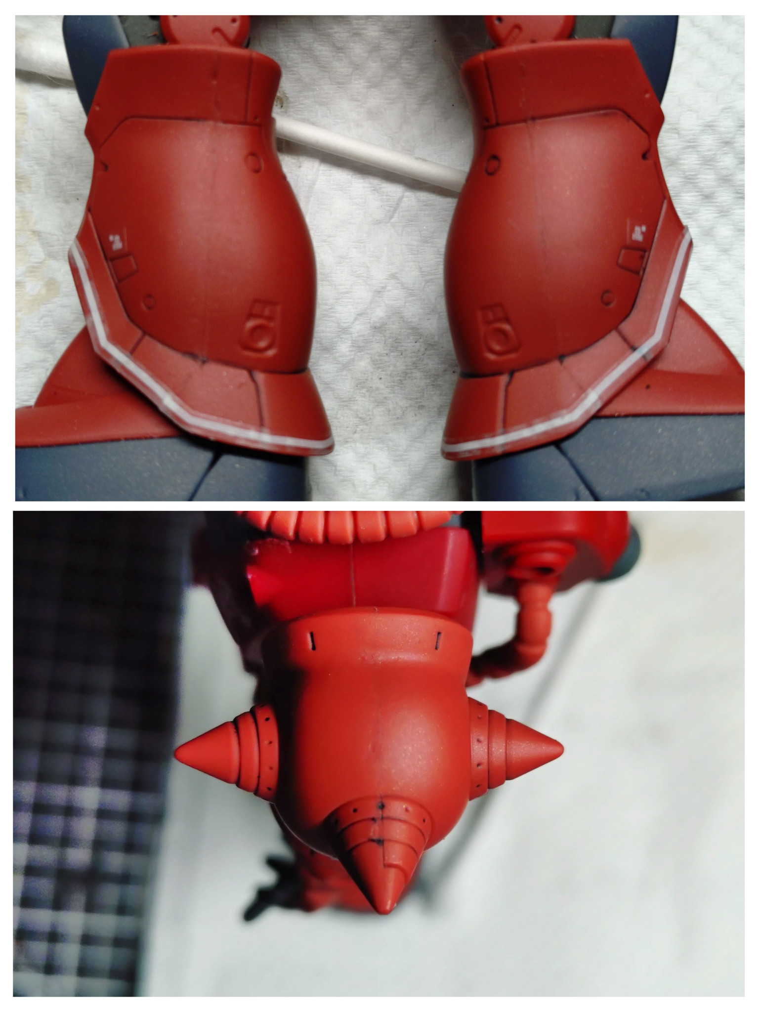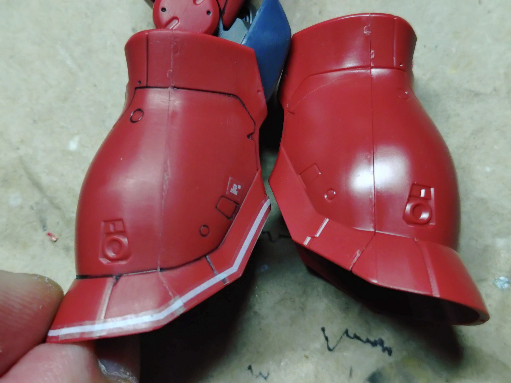 組んでる途中経過は無いんですが、一番合わせ目の出やすい脚部。右がそのまま組んだもの、左はタミヤセメントで接着しはみ出た部分をヤスリ掛けしました。