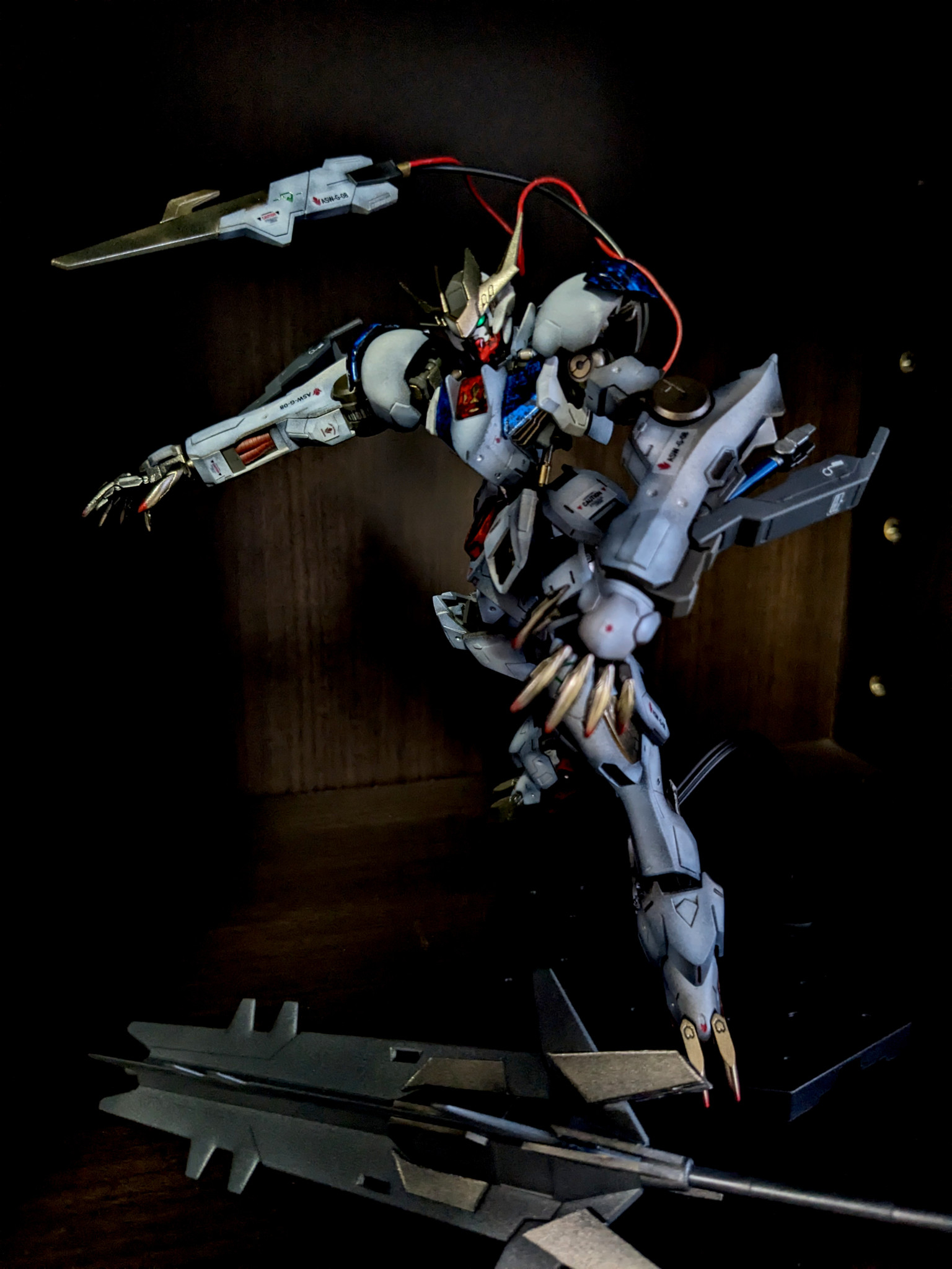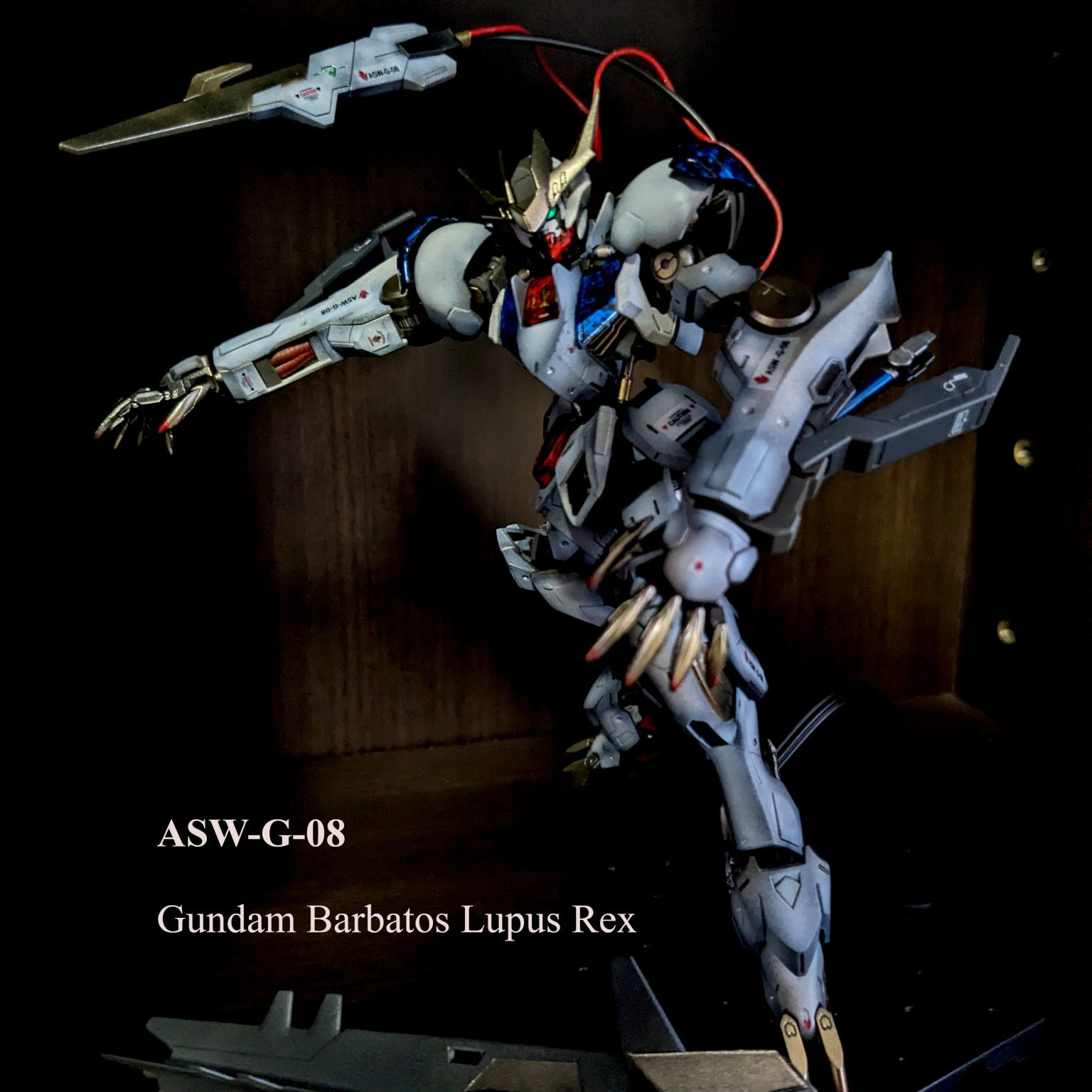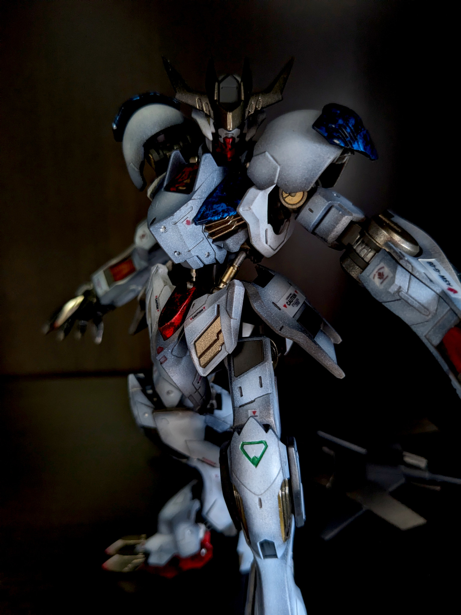 バルバトスルプスレクスはラテン語で「オオカミの王」という意味なのですが、まさにその名にふさわしいスタイルです。全体的に暗めに仕上げましたが、それ明けでは沈んでしまうので、カラーパーツはラップ塗装でギラギラにして、メリハリをつけました。