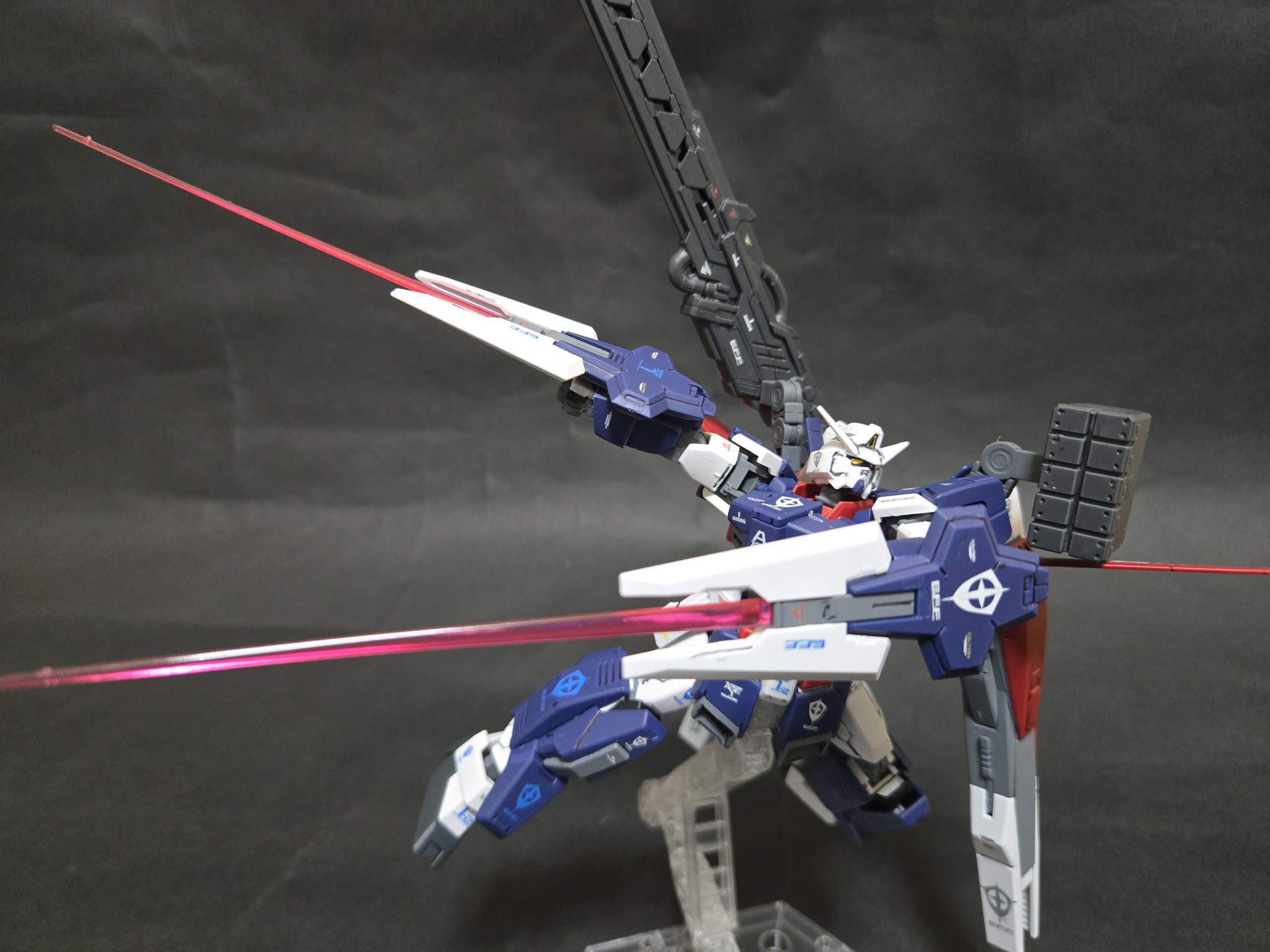 ・ハイプラズマレールガン…背部ユニットの右翼に増設されたサブアームと連結された大型レールガン。ドッズライフルの技術を転用した武装であり、『螺旋状に回転・圧縮させた荷電粒子を砲弾に纏わせる』ことで、実弾としての質量にドッズライフルの貫通力を乗算させており、着弾部位の深部に砲弾を到達させ、内側から炸裂させる。