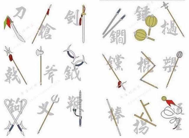 刀、槍、剣、戟、棍、棒、槊、鎲、斧、鉞、鏟、耙、鞭、鐧、錘、叉、戈、矛