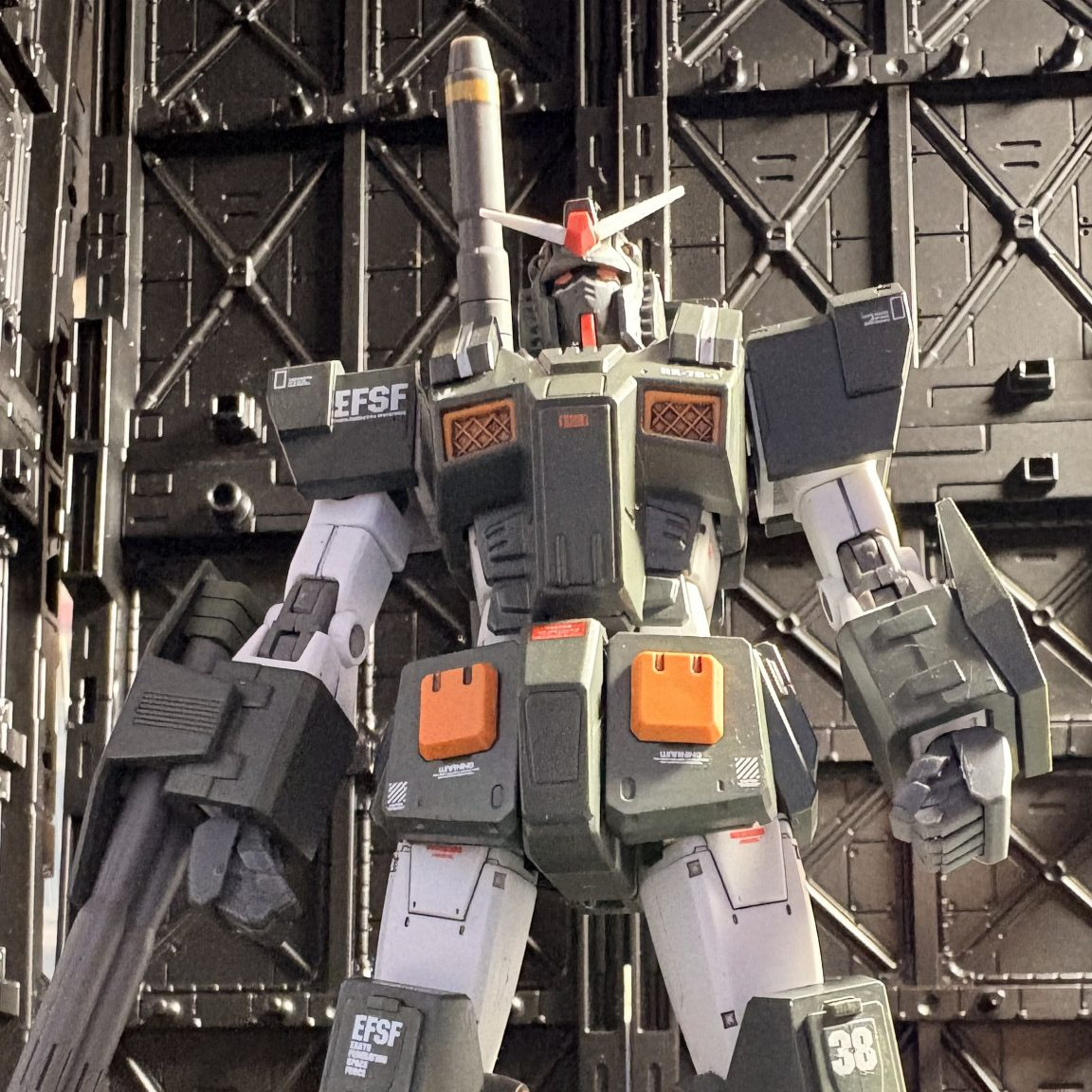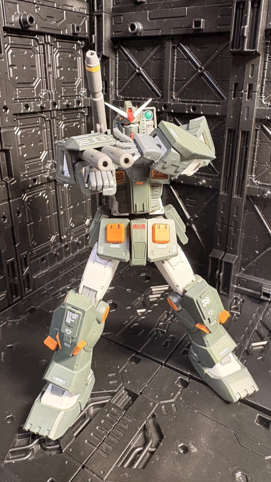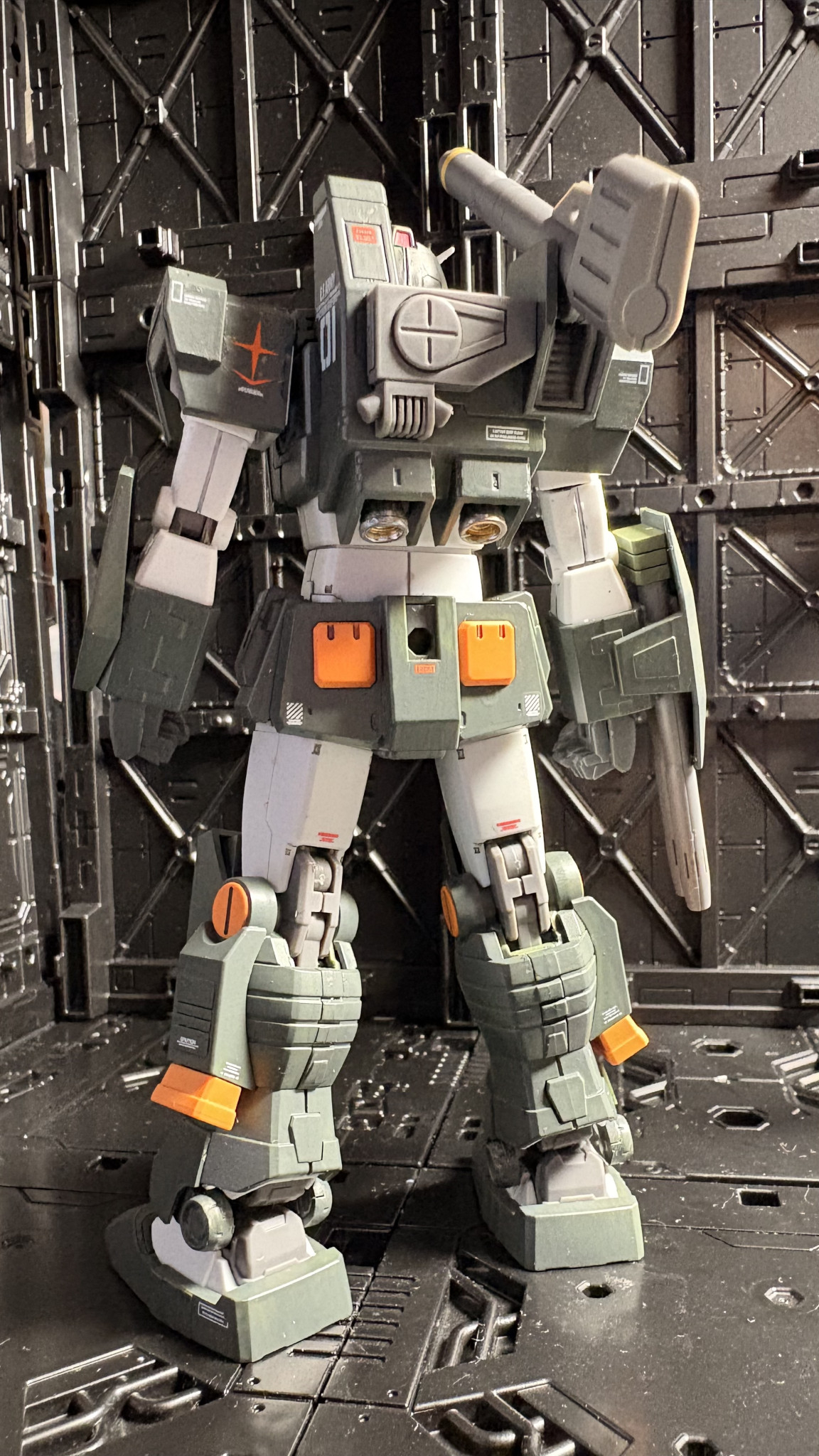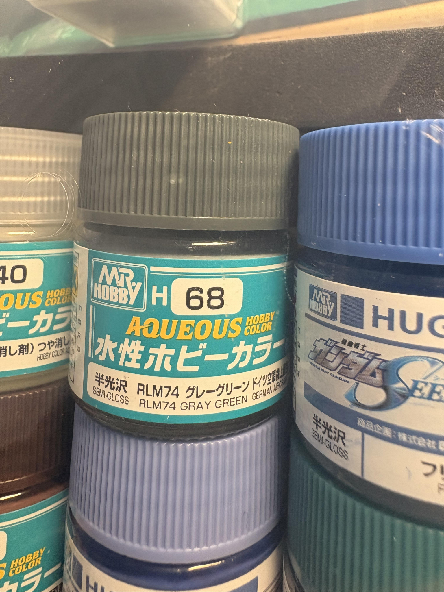 今回アーマーの緑はクレオスのRLM74グレーグリーンで塗装。フルアーマーのカラーを踏襲しながら落ち着きのあるグレーを強めに塗り替えてみました。因みに塗料は全てクレオスの水性ホビーカラーを使っています。筆塗り専門ですが…😅