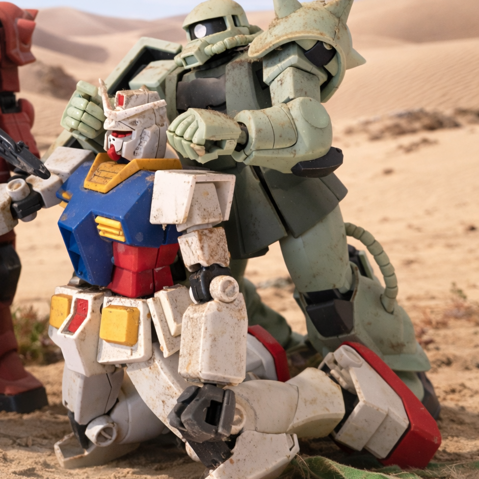 ザクIIが増えたので、ポーズはそちらに任せて以前作ったザクIIとガンダムを使って『セイラ出撃』の名シーンに近いものを再現しました。
