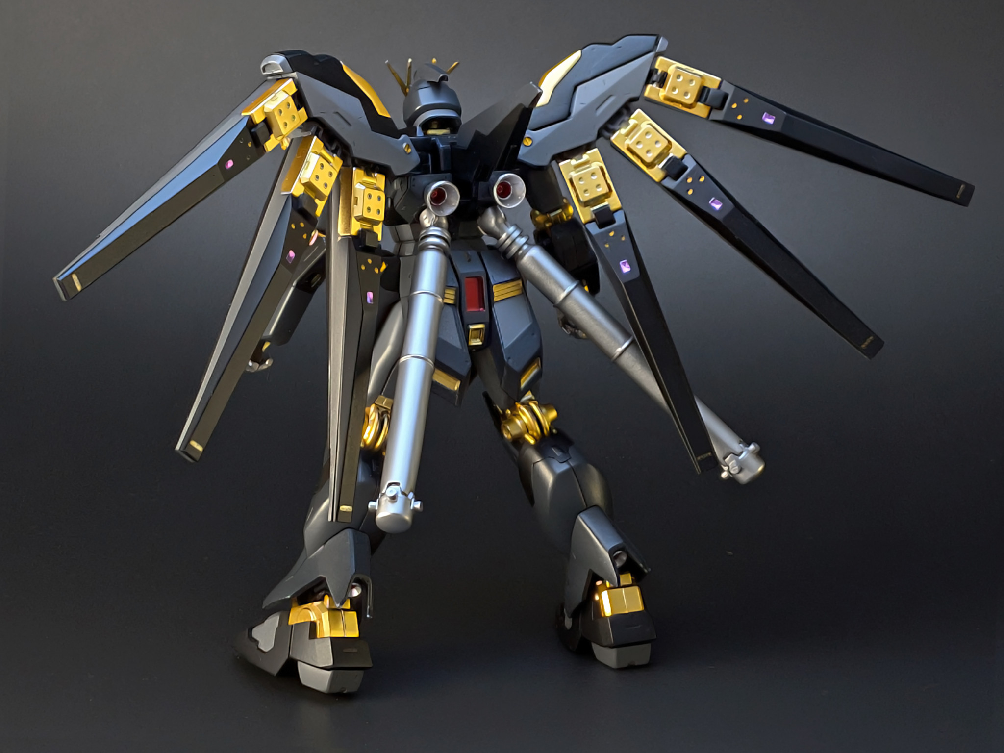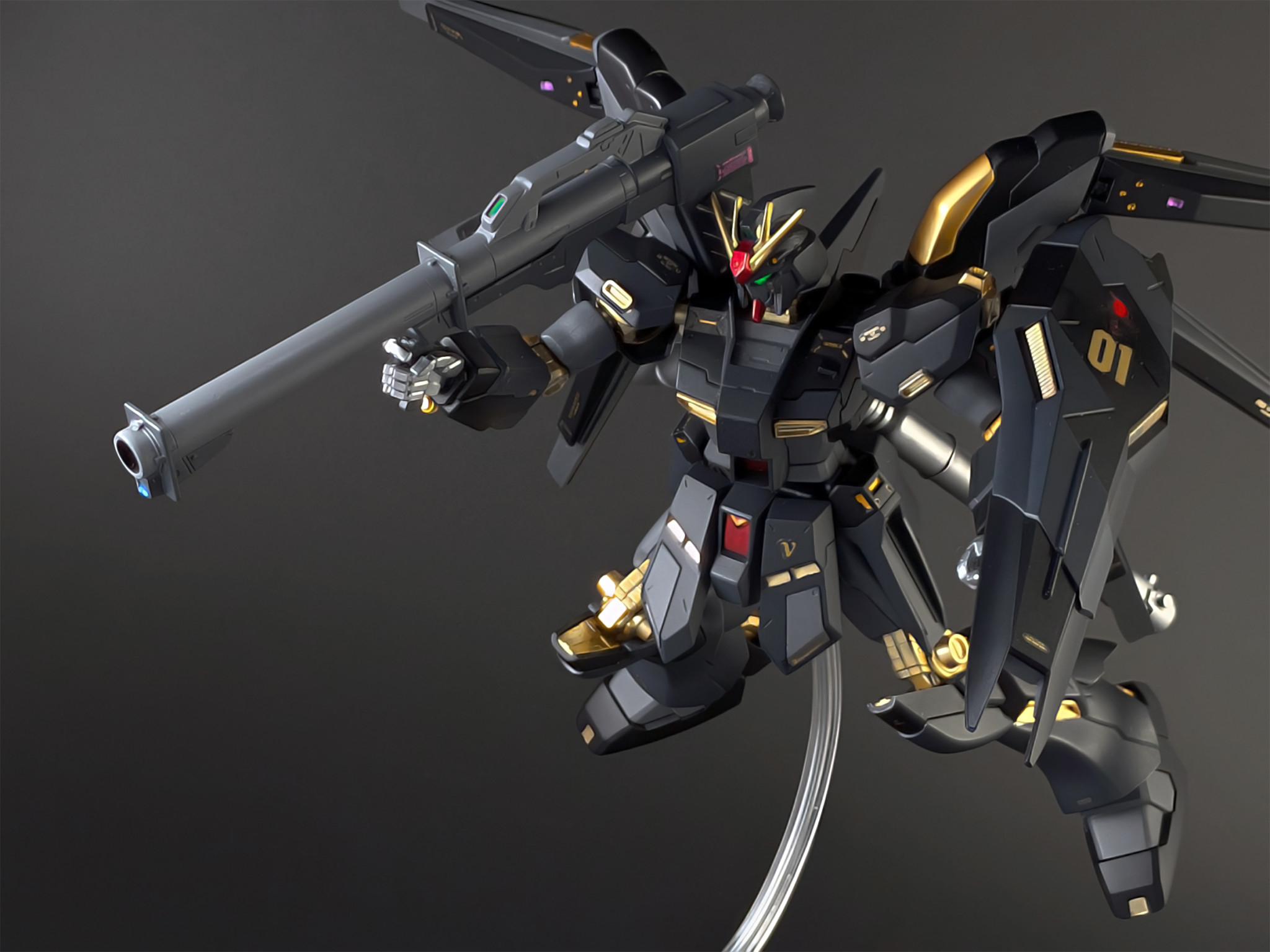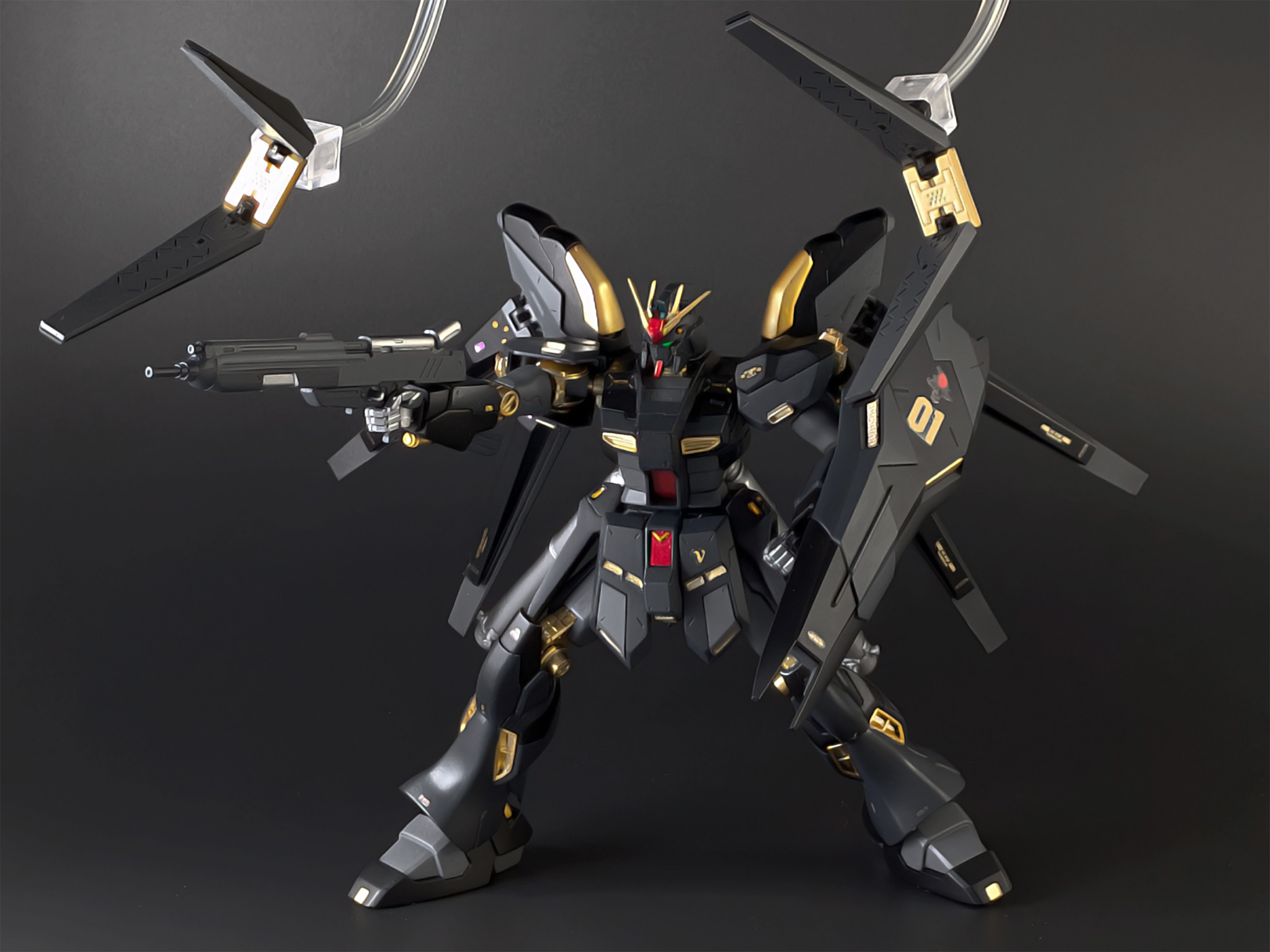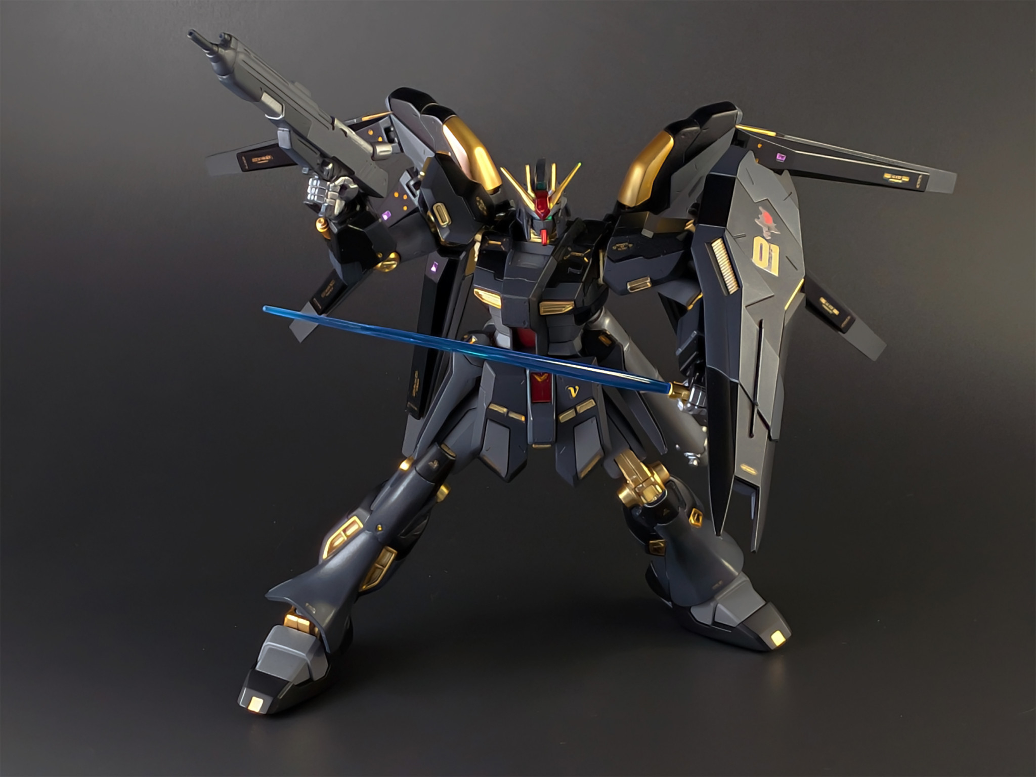 Hi-νガンダムは本来白と青(青紫)がメインカラーですが、今回はそれを黒と金というオリジナルの補色的なカラーリングにしてみました。結果として、禍々しくも強そうなダークヒーロー風の機体に仕上がったと思います。
