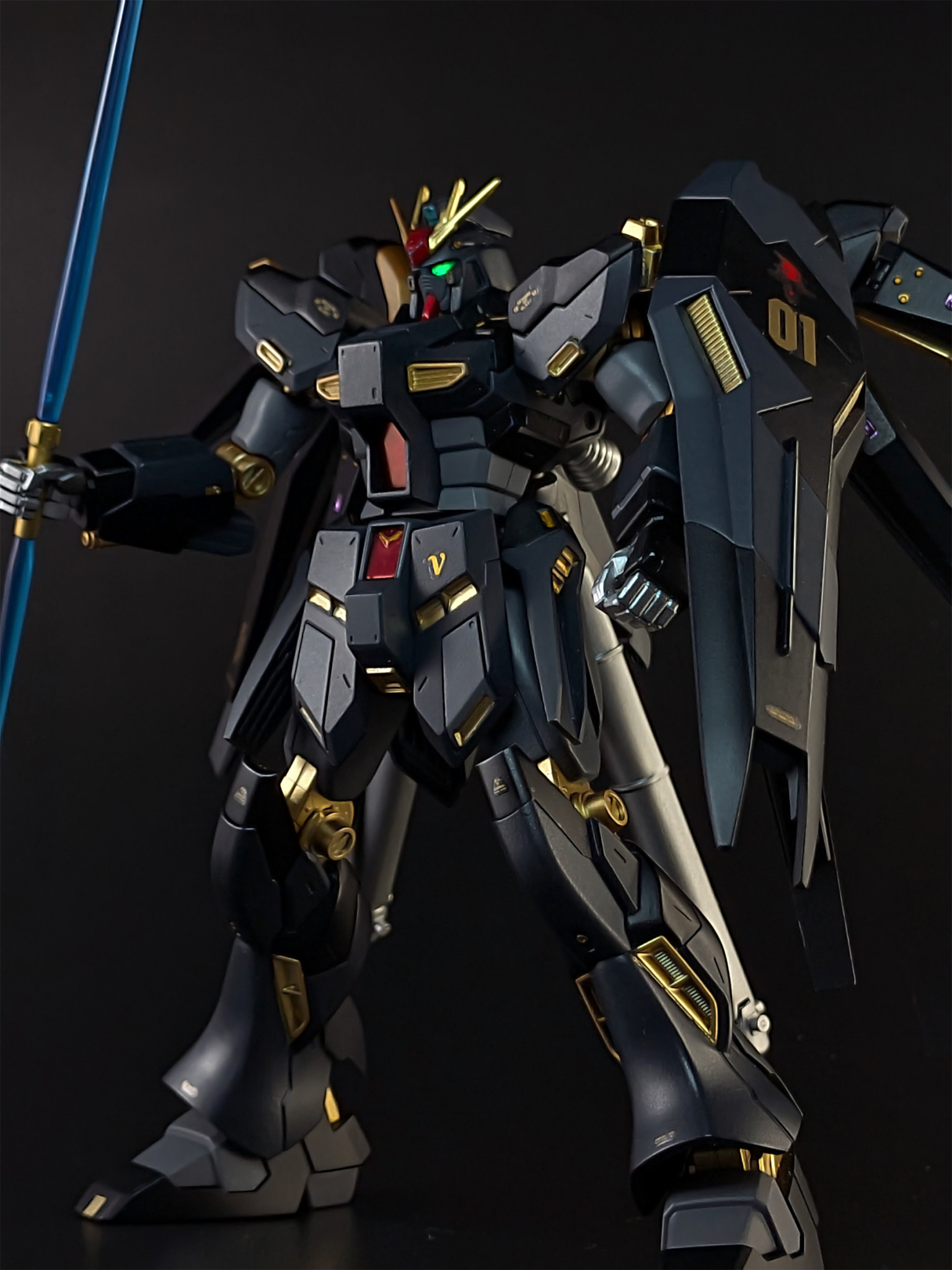 金部分の塗装は、いつも通りガンダムマーカーのイエローゴールドです。黒ベースに金の差し色は、本当にカッコイイ組み合わせだと思います。なお、サーベルはクリアパーツなので未塗装ですが、金の補色的なカラーである青が入る事で、より目を引く画像になった気がします。