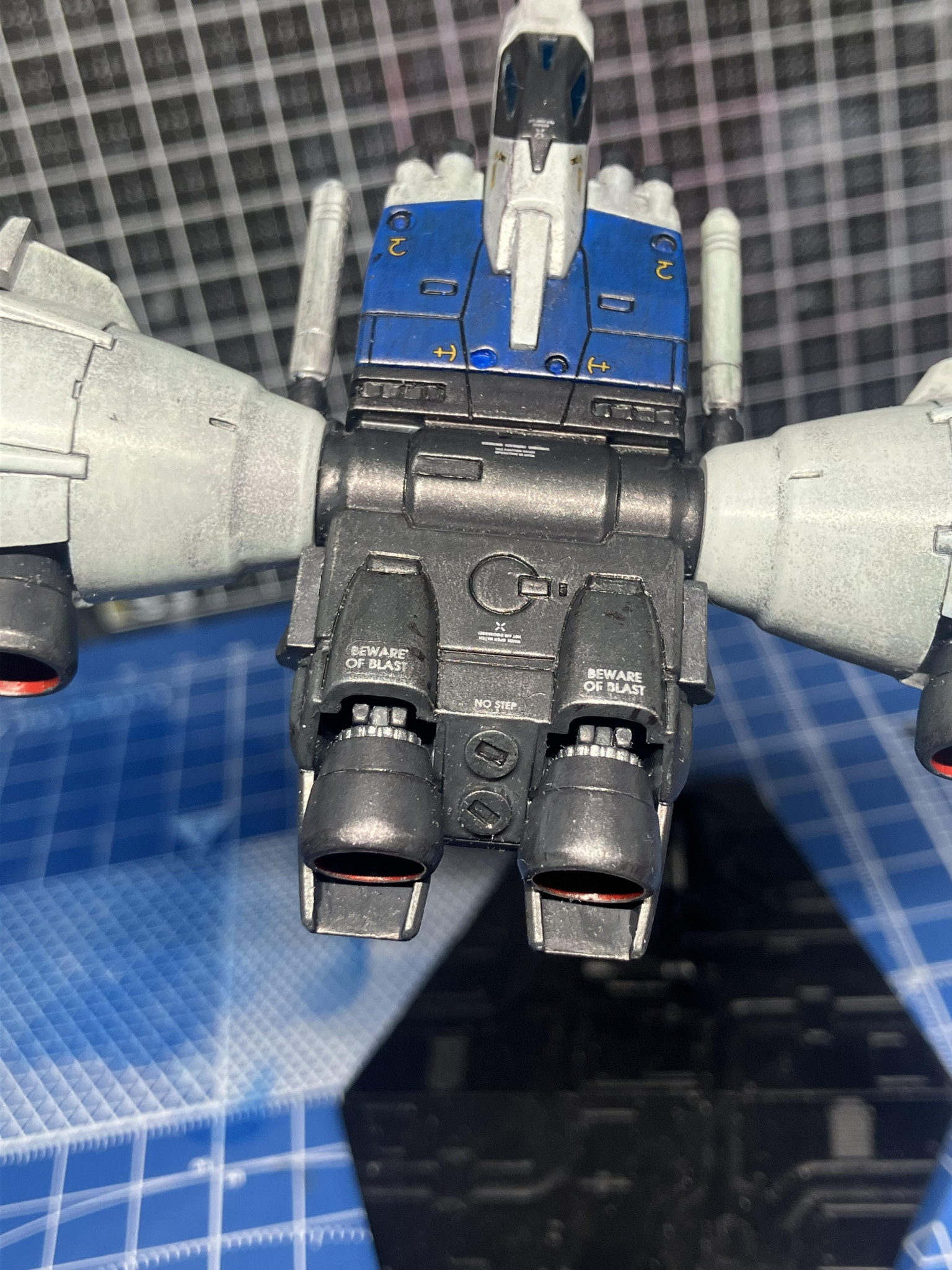 白部分はグランプリホワイト、グレー部分はグレーとブラックを2:1で調色。胴体の青はブルー、バーニア内部の赤はレッド。