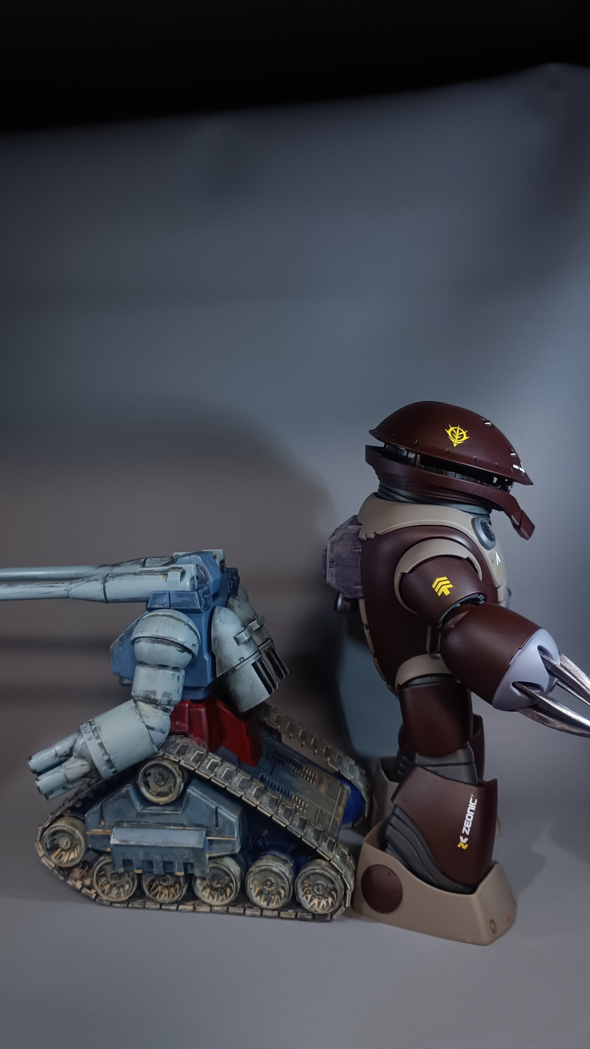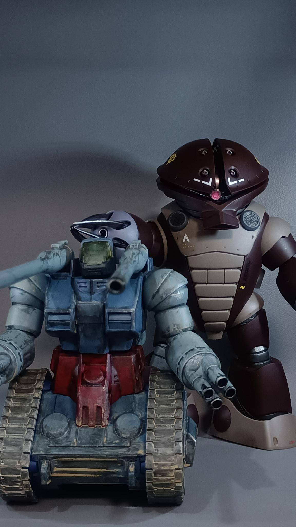 照明の影響なのかマットキャンディっぽい仕上がりがいいですね。ウェザリングを抑えて正解だったと思います。ガンタンクと比較してもこんなに大きいとは、アッガイ持ってるんですけど比べたことなかったので意外でした。せめてアッガイはゴッグよりは小さくあってほしいですよね。