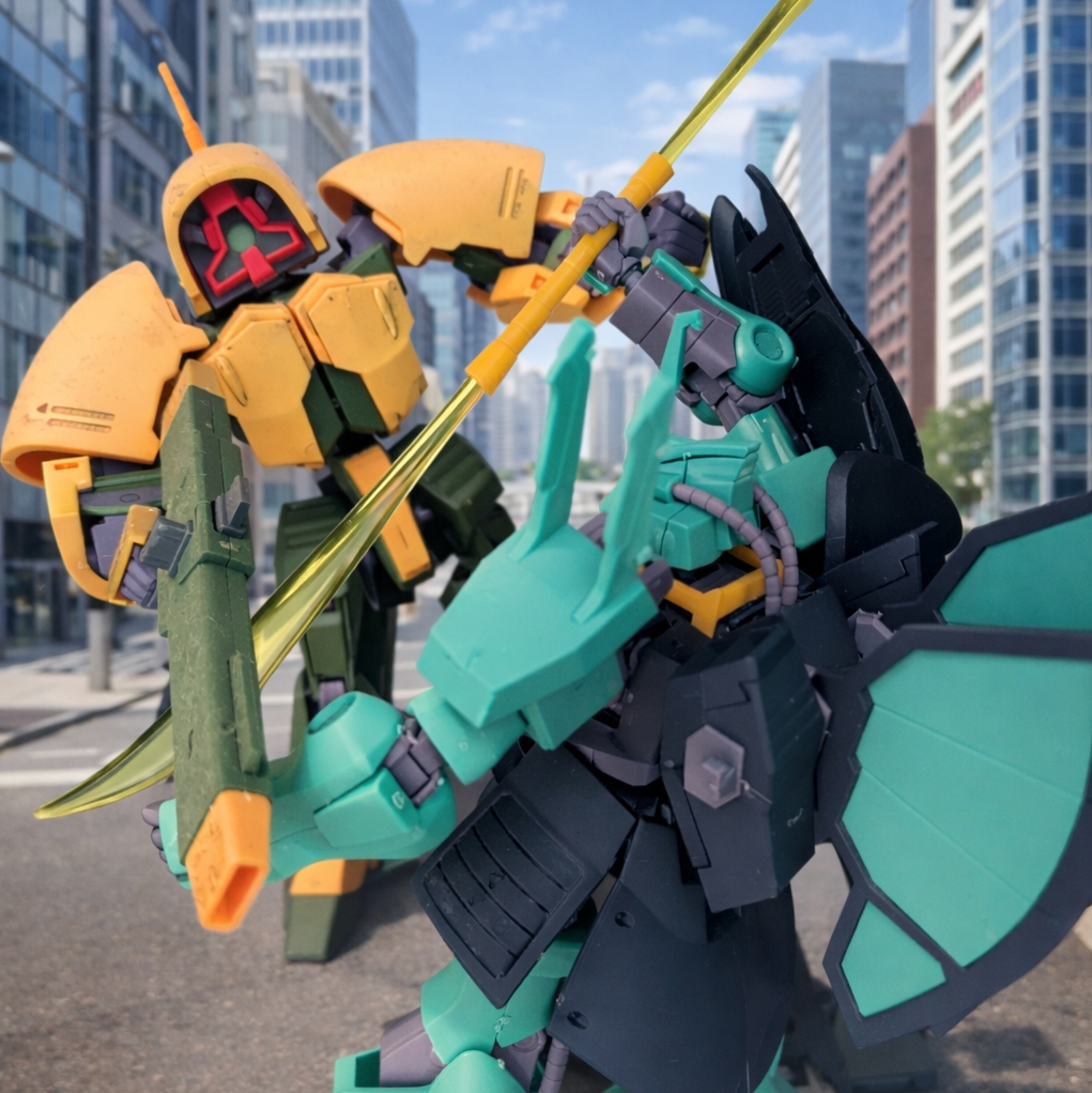 ずっと、箱積みだったディジェ。やっとの思いで作って、アッシマーと戦わせてみました。背景は、もちろん市街地で気分はホンコンシティ!