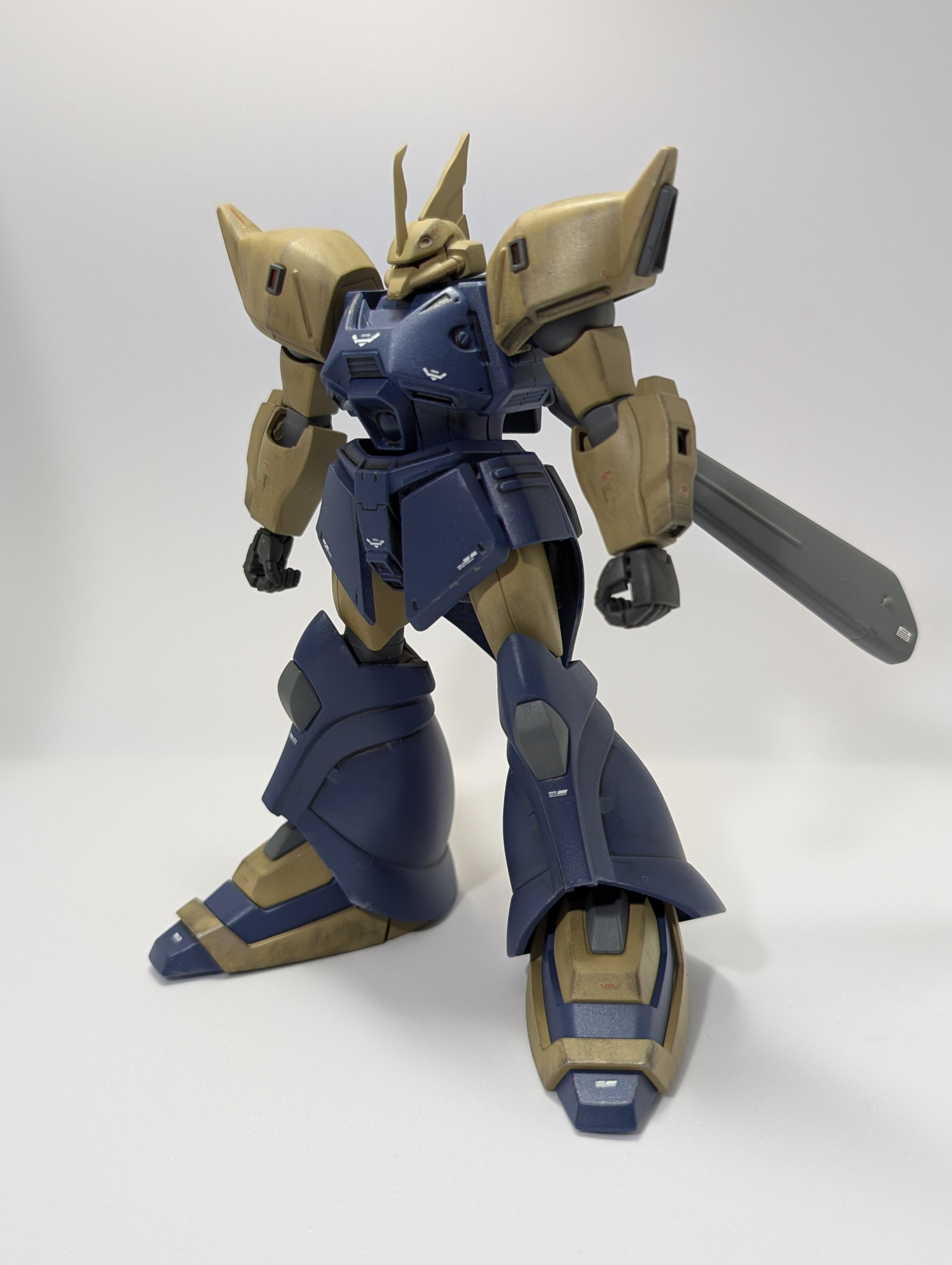 胴体以外の合わせ目消しとアンテナシャープ化を行い、上半身と両腕はゲルググM指揮官機とミキシング加工、ゲルググJの上半身は細身なので、上半身がパンプアップされたようになり長身ムキムキ感がアップ?しました😊