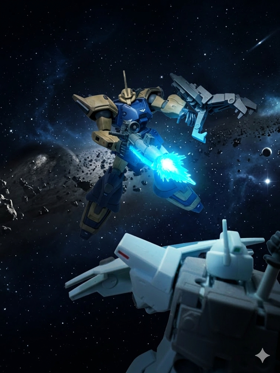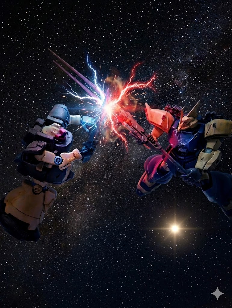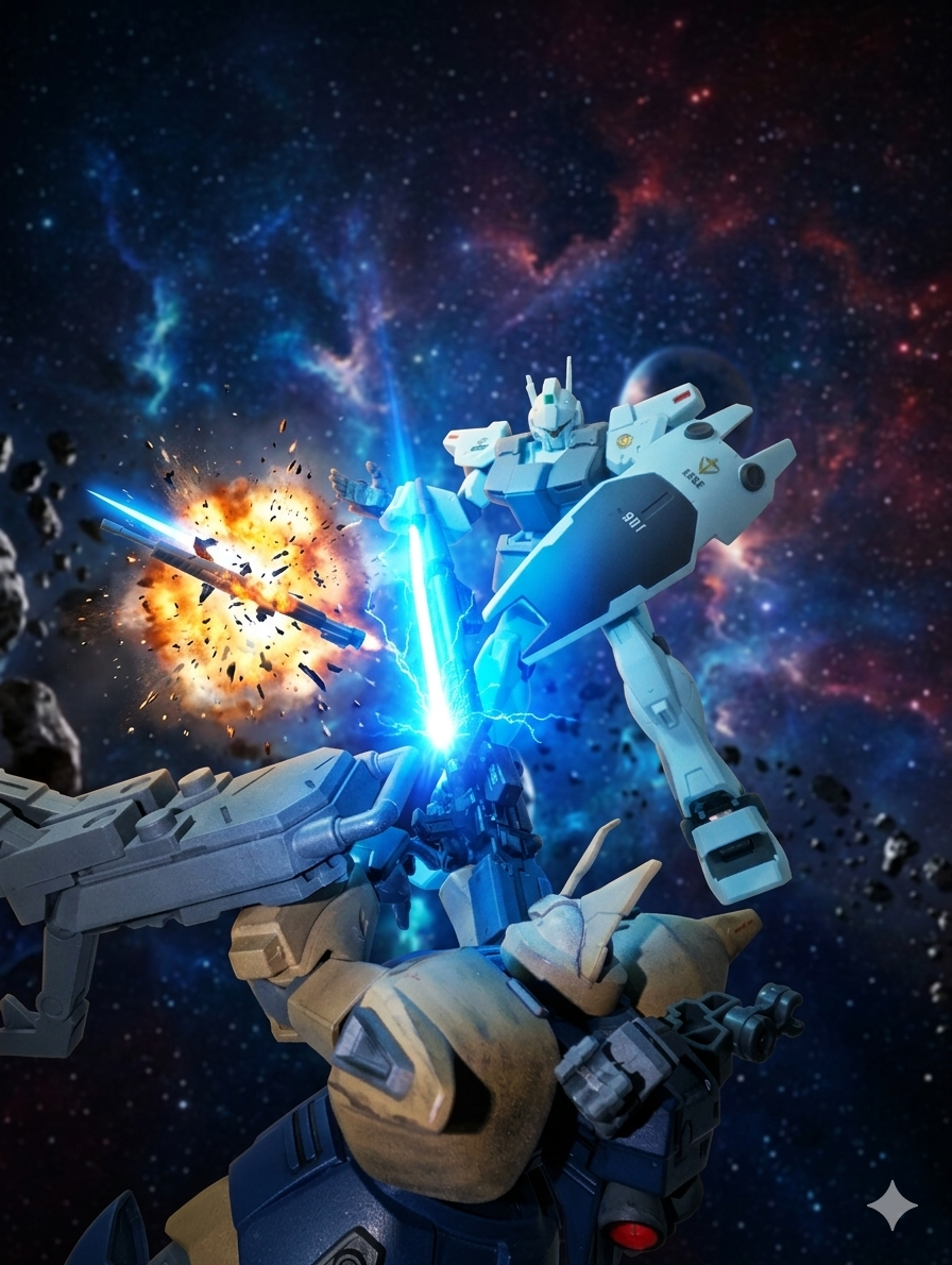 ジム・カスタムとゲルググJ改は、1対1で睨み合い、接近する。