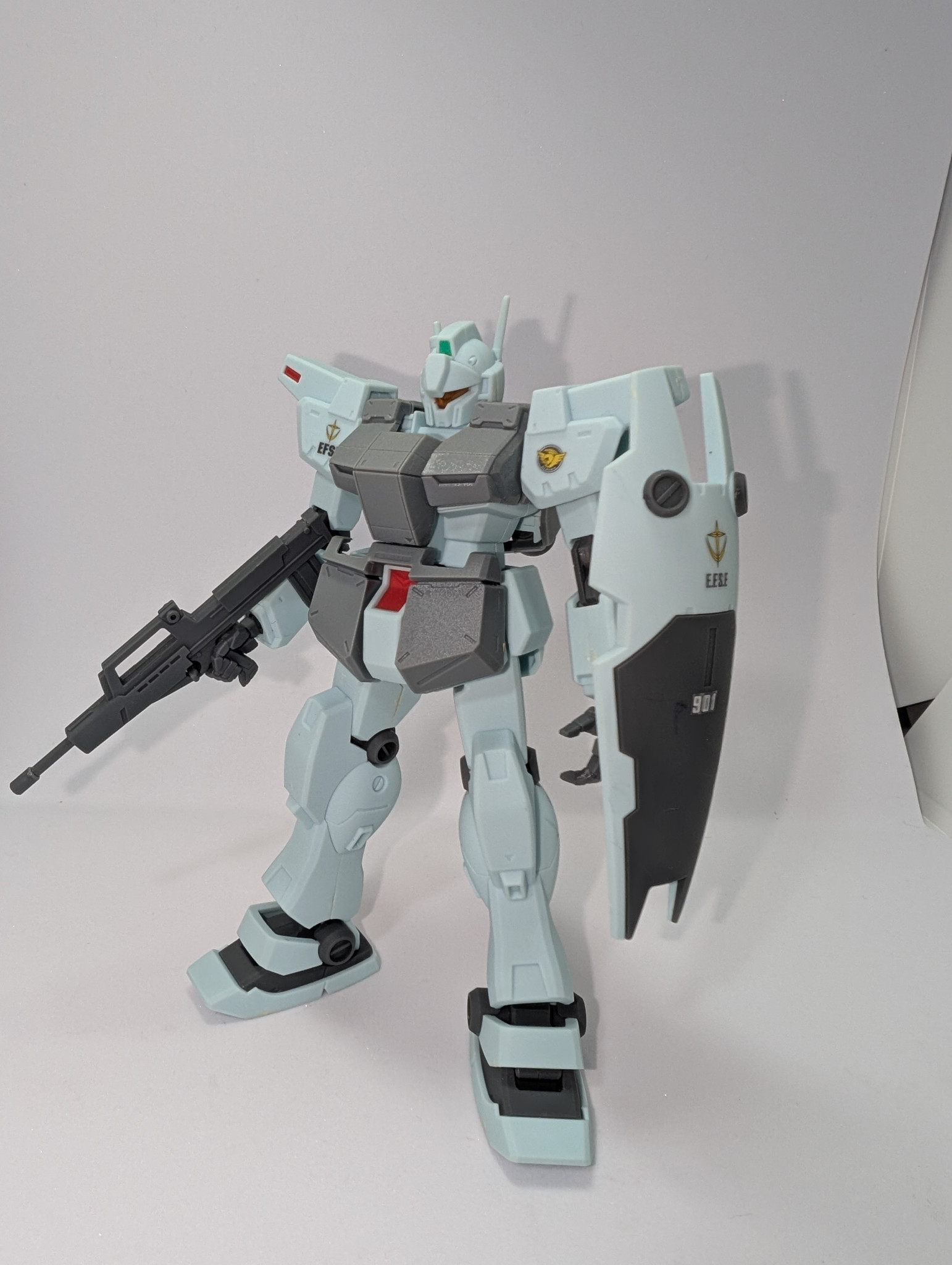 ライフルはシステムウェポンのGPライフルを組み合わせ加工して長銃身に、銃身横に追加のエネルギーパックを接着してジュッテ用の専用パックに。ジュッテはクリアカラーランナーを切り出した物をはめ込んだだけです💦