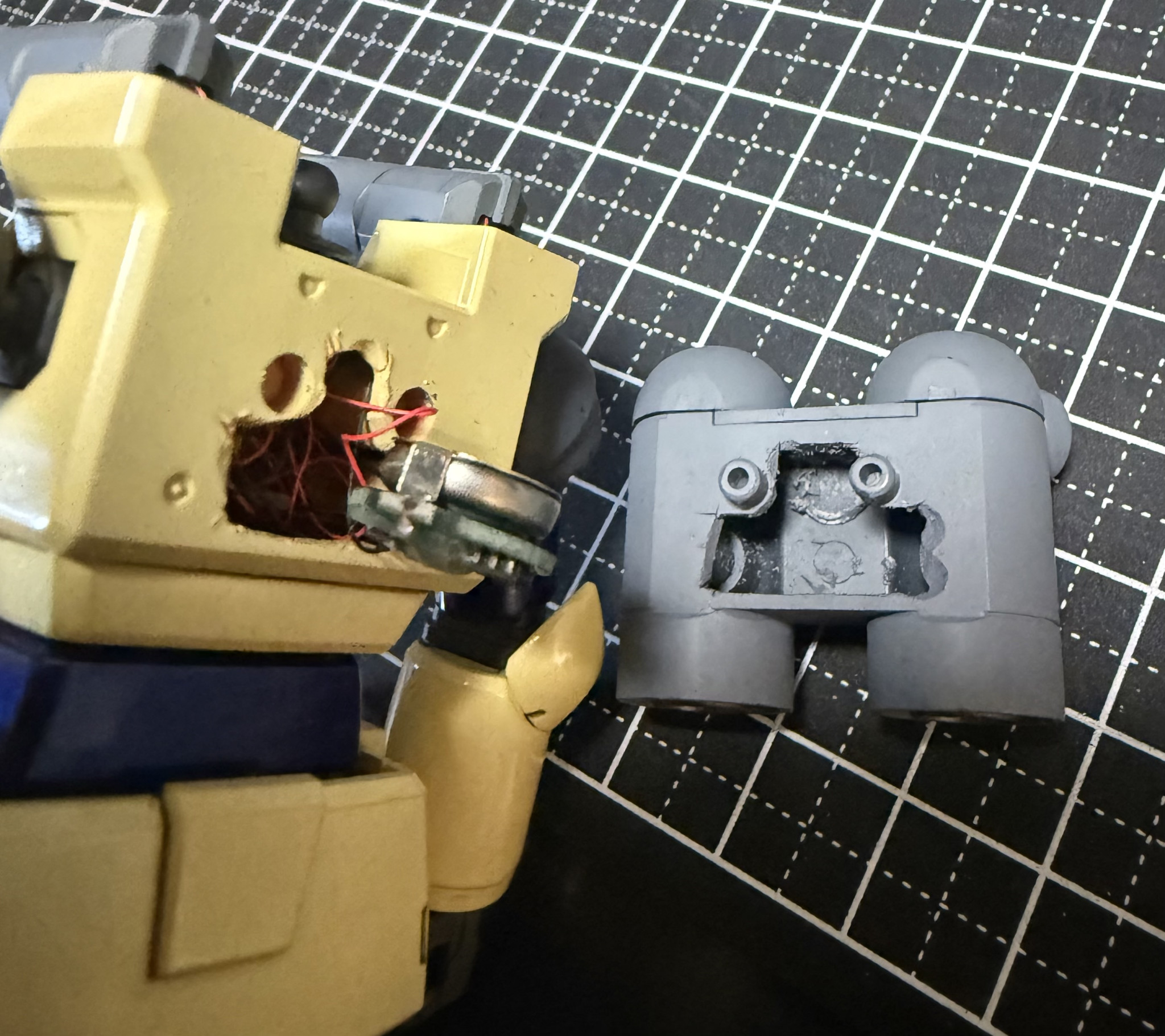 細切りプラ板でアームを作り、耳の部分を丸く彫ってからマイナスモールドを段落ちで取り付けました。