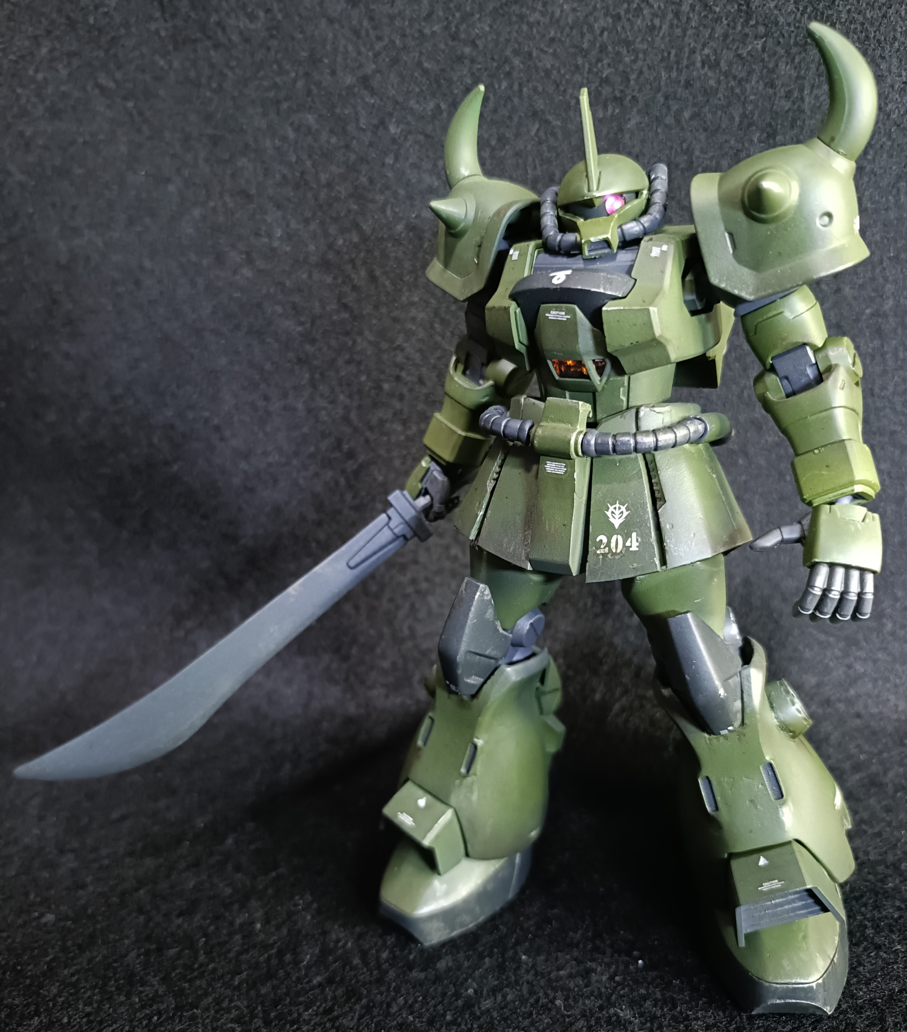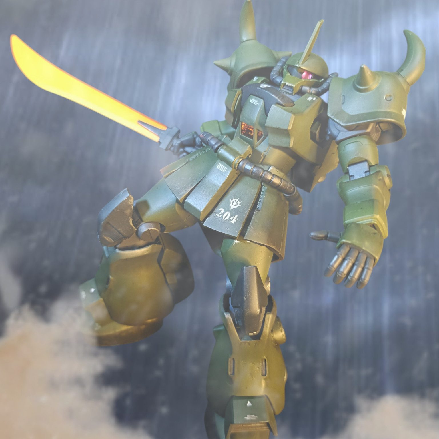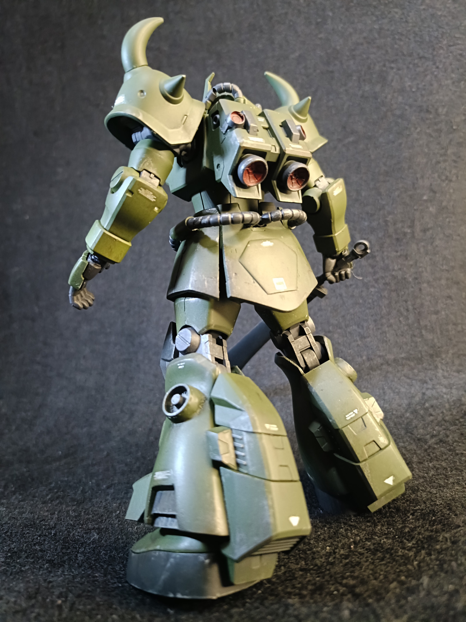 ガンダムベースで仕入れたグフ飛行試験型を魔改造。本パーツはあまり使えないという勿体なさ。そのままだと太すぎる脚パーツも使用せず、余剰パーツにパテ盛して作成。腰パーツはジャンクパーツの他ザク系統からミキシングしてスカート延長しながら仕上げてます。
