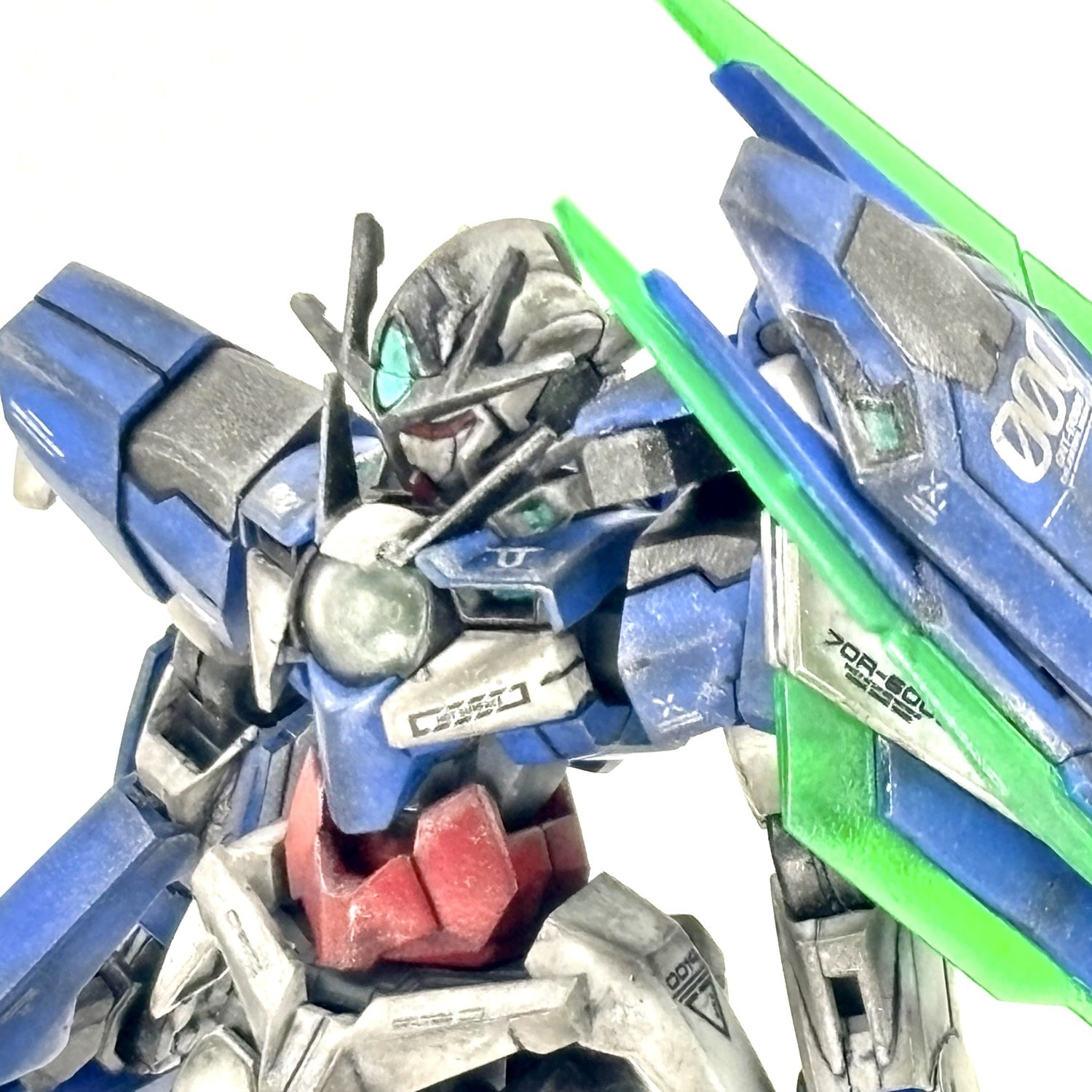 しっかりウェザリングして、彩度を落としてらっしゃるので、クリアパーツの緑が映えますね(gundam-kao6)