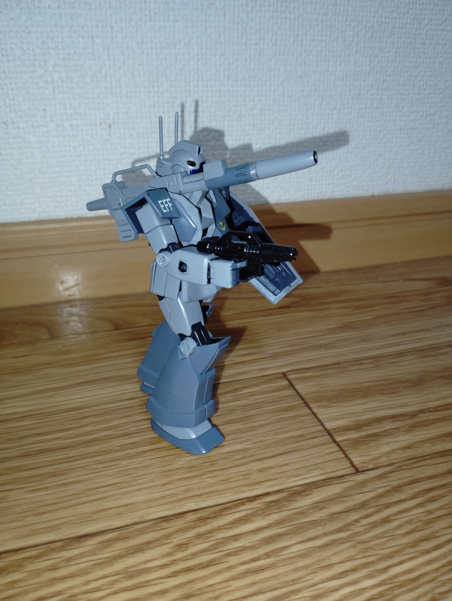 バックパックは旧キットMSVのジムキャノンのモノを加工し、バーニア基部をプラ板で追加してから、HGUCジムのバーニアを取り付けてあります。