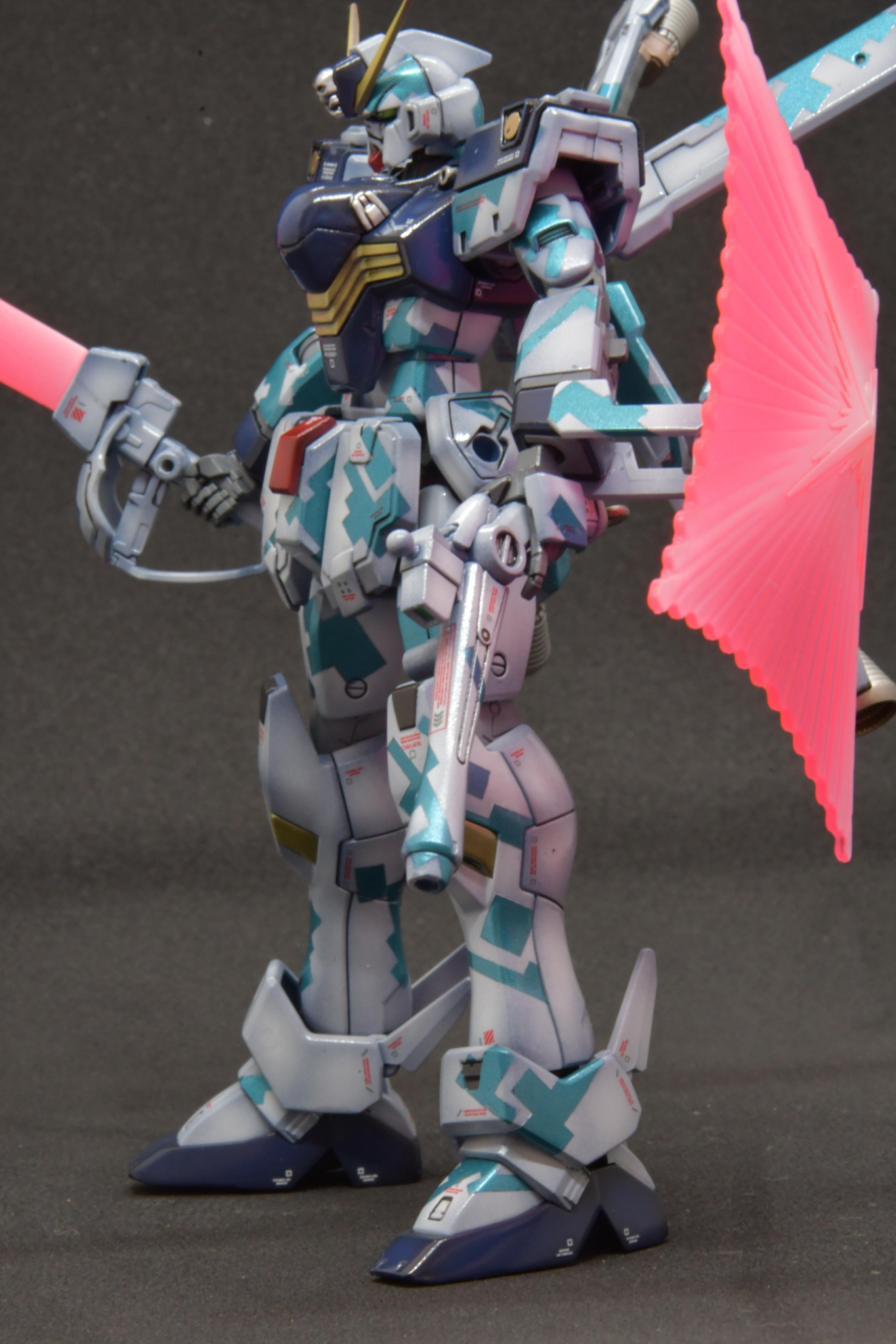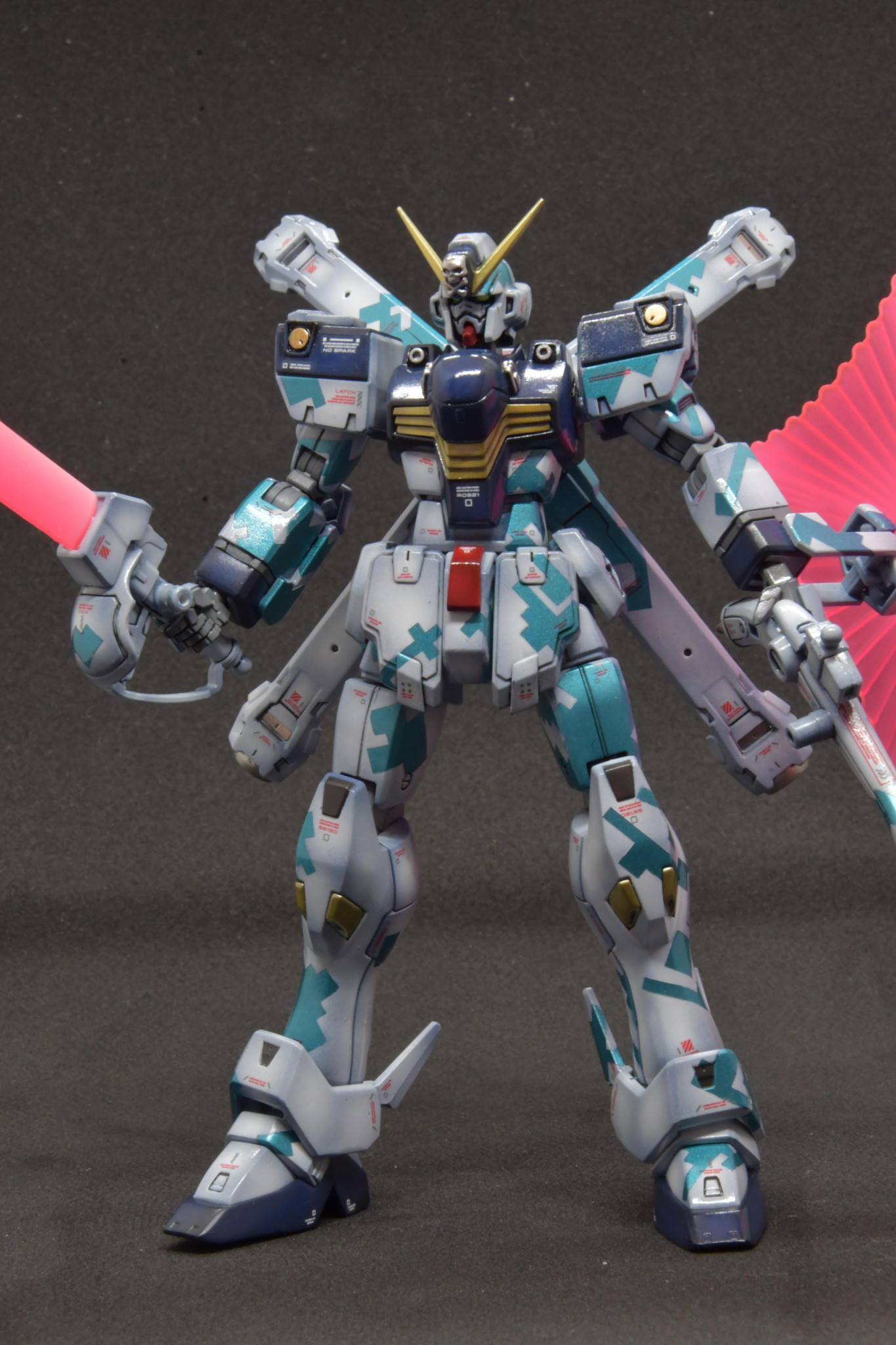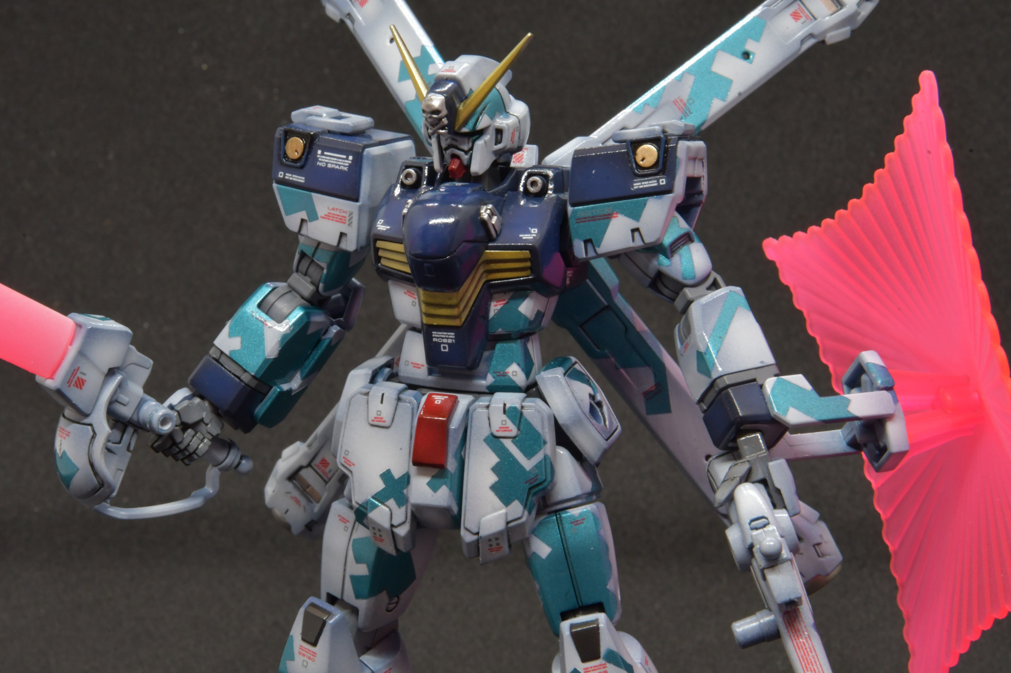 HGクロスボーンガンダムをドット迷彩交えて塗装しました。最後は艶消しコートするつもりでしたが、塗膜安定にクリア吹いたのが超合金ぽくて面白いのでそのままにしました。