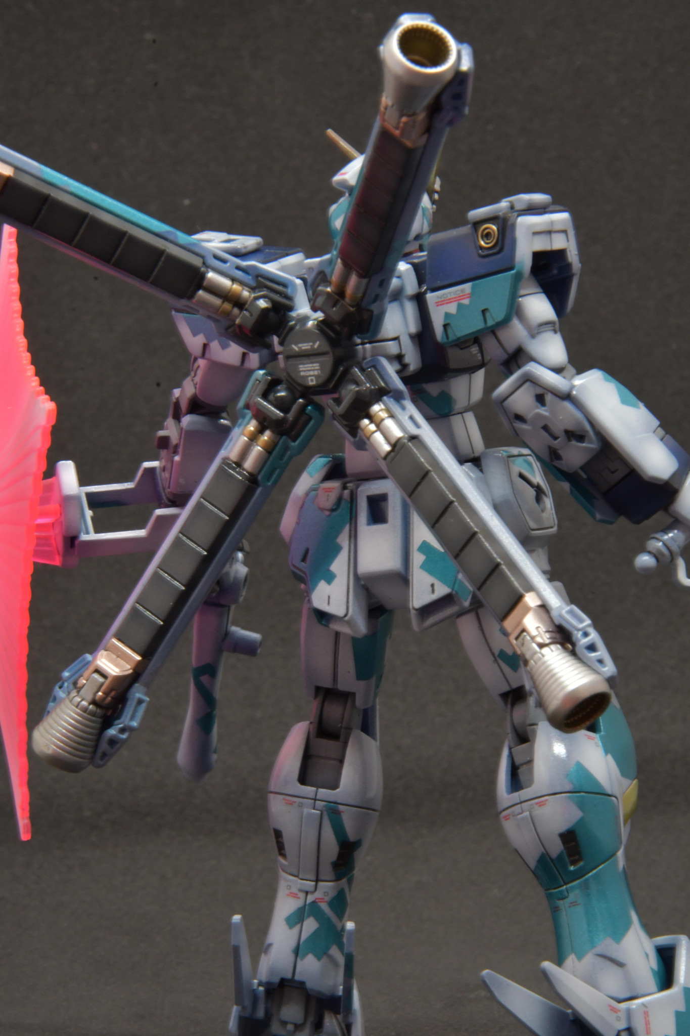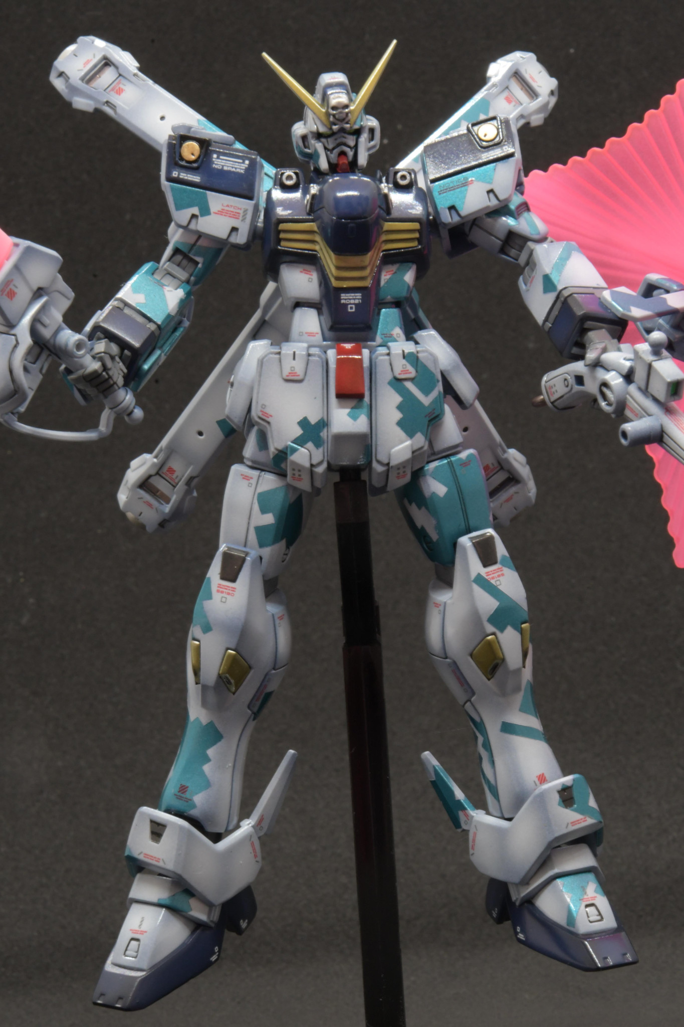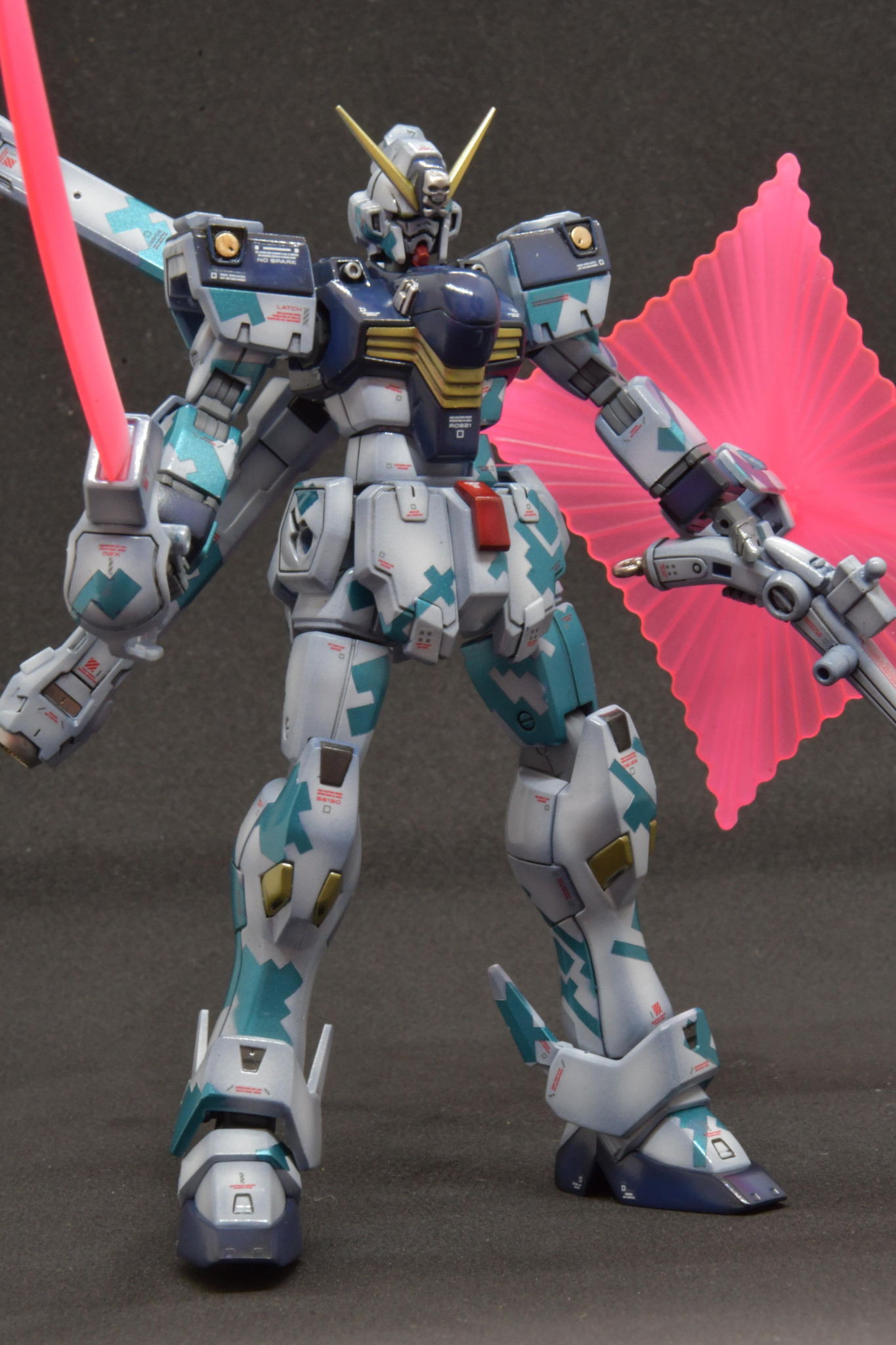 HGクロスボーンガンダムをドット迷彩交えて塗装しました。最後は艶消しコートするつもりでしたが、塗膜安定にクリア吹いたのが超合金ぽくて面白いのでそのままにしました。