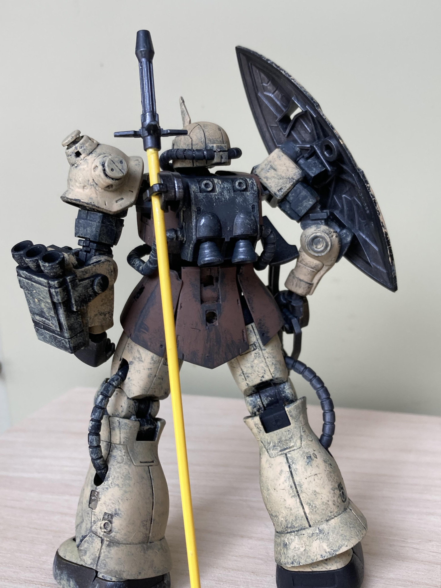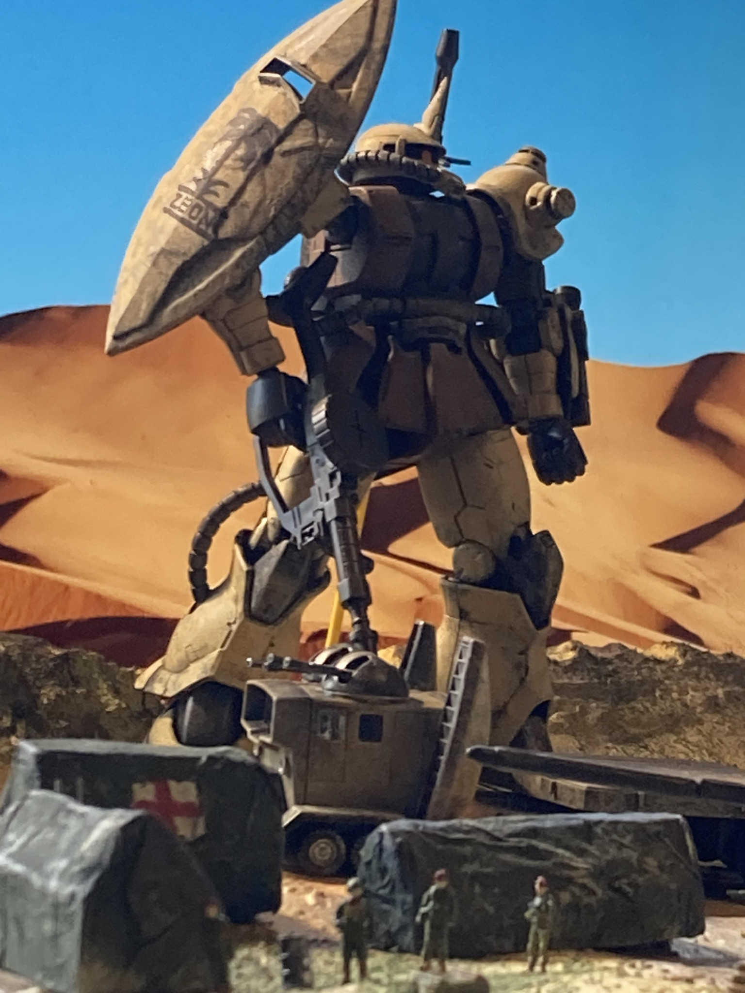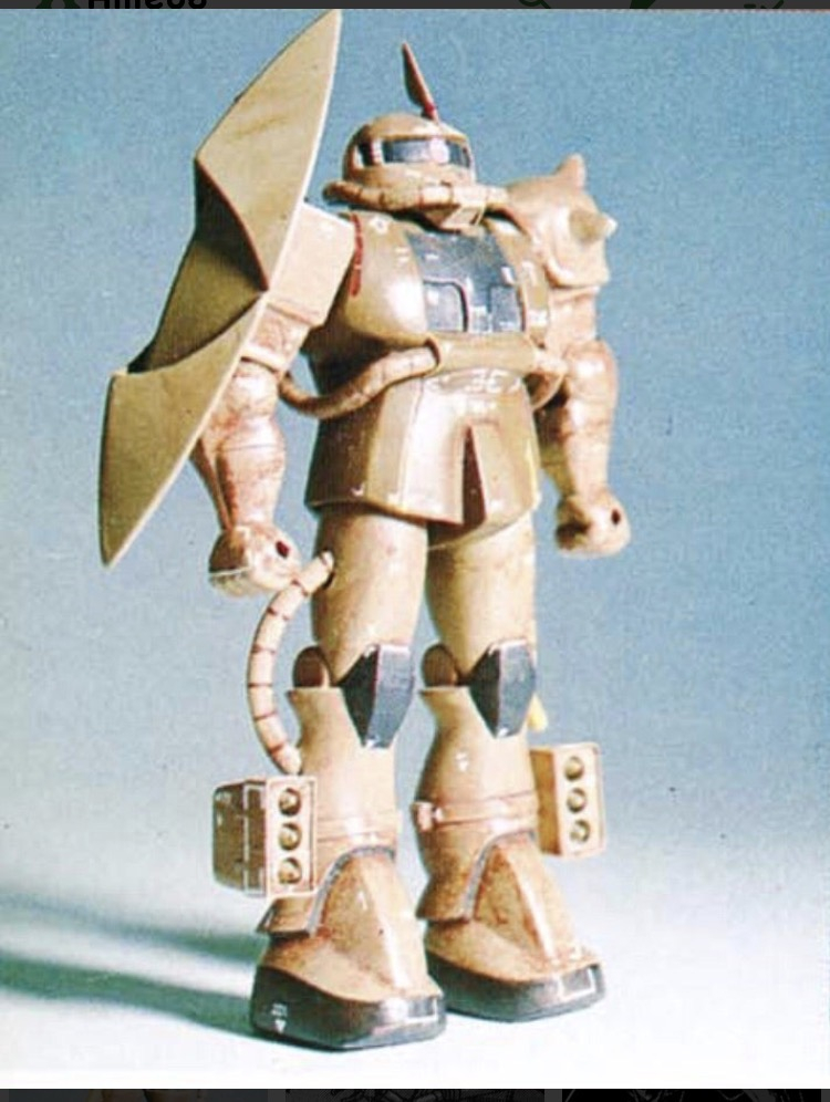 むかし、HOWTO BUILD GUNDAMという本に、ザク2砂漠仕様という、ゲルググ 風なシールドをつけたザク2が掲載られていたようで‥