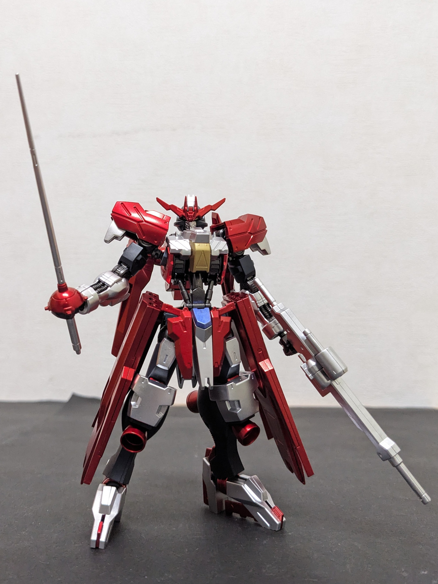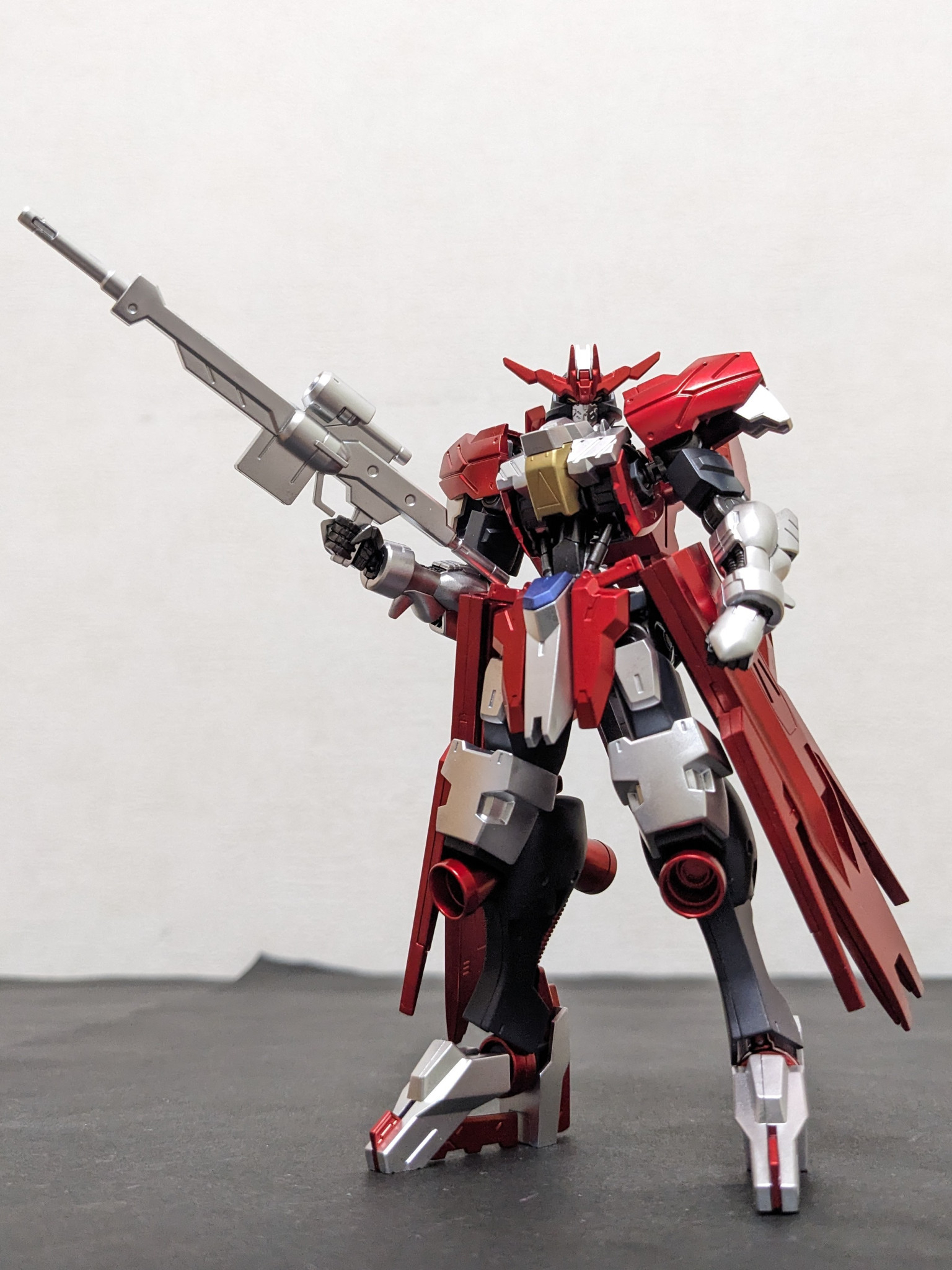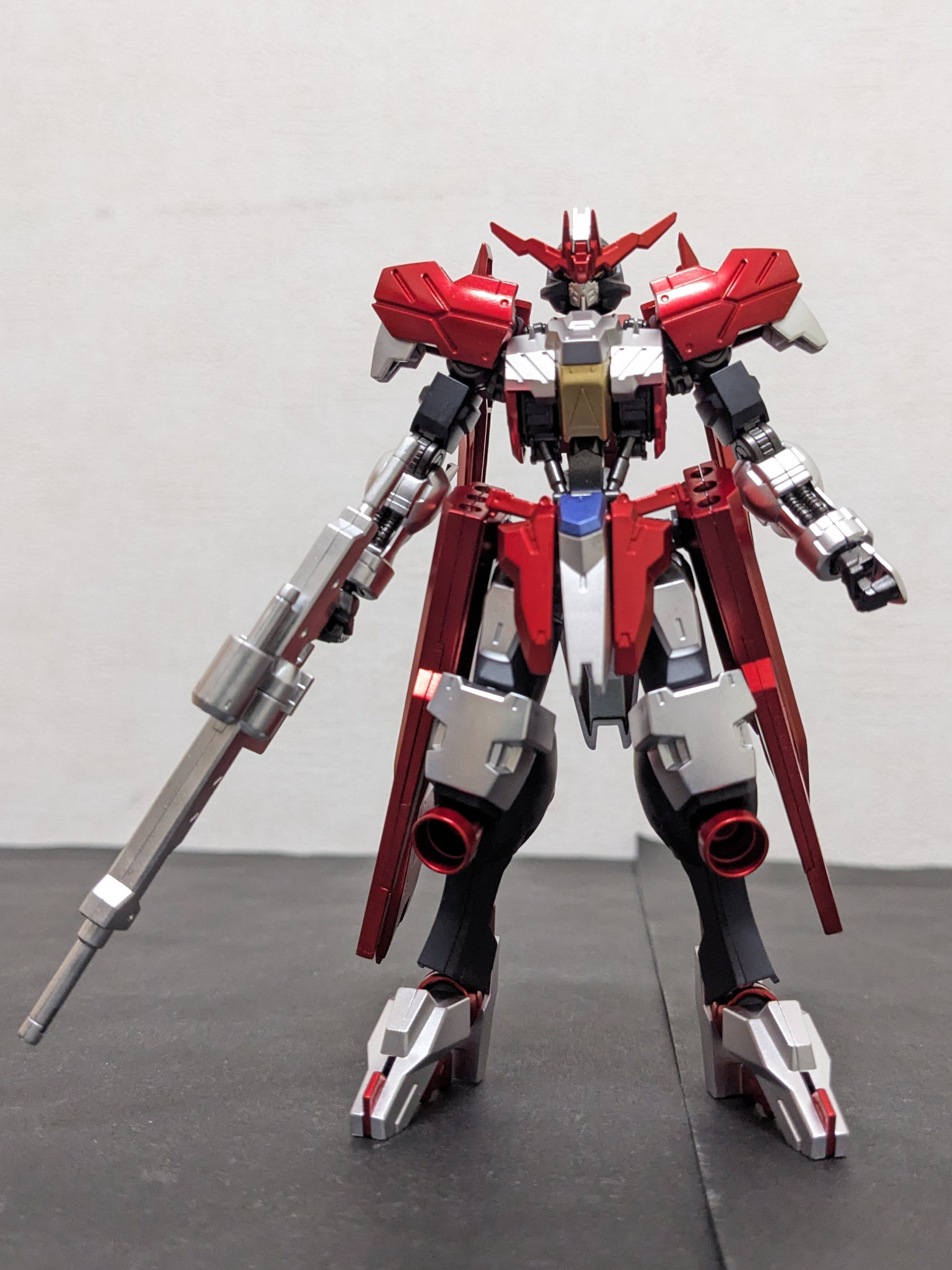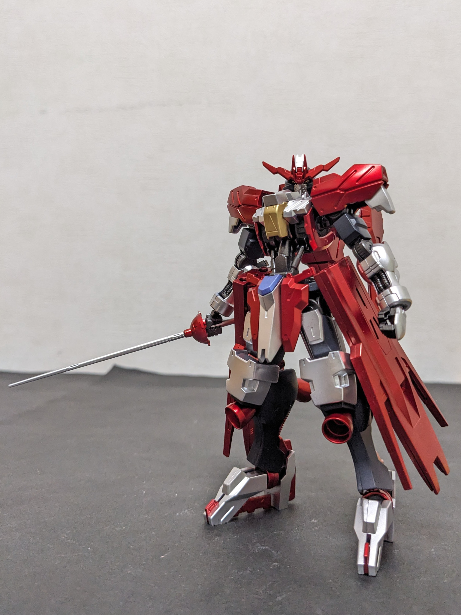 おっと😝‼️ここはGUNSTAなのでアギトのことばっかじゃなく、キットの話しないと😅。鉄血は未見ですが、たまたま店頭で見かけて「悪役なんだろうけど、主役風に仕上げたら、かなりカッコ良くなりそう‼️」と思って衝動買い。「さて、どんな感じにすっかな🤔❓」と考えた挙句、機体に漂う「ツワモノ感、達人感」が「何か、アギトに通じるものがあるな💡」と思いつき、「どーせなら、最強形態で行っとけ😆‼️」ってことで、シャイニングフォームをモチーフに仕上げることと相成りました😉‼️
