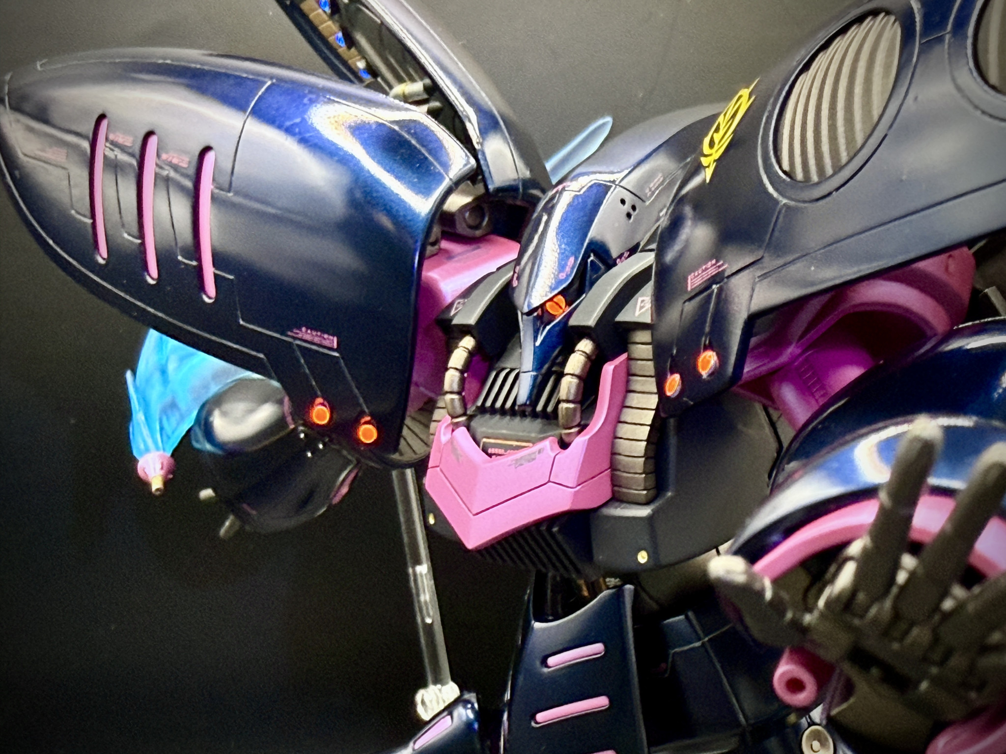キュベレイの最大の特徴である左右のバインダーには、スジボリを加え、内側メカの3つのバーニアには、蛍光ブルーのルミドームを埋め込んだ、コトブキヤのミニサイズのバーニアノズルを貼り付けてあります