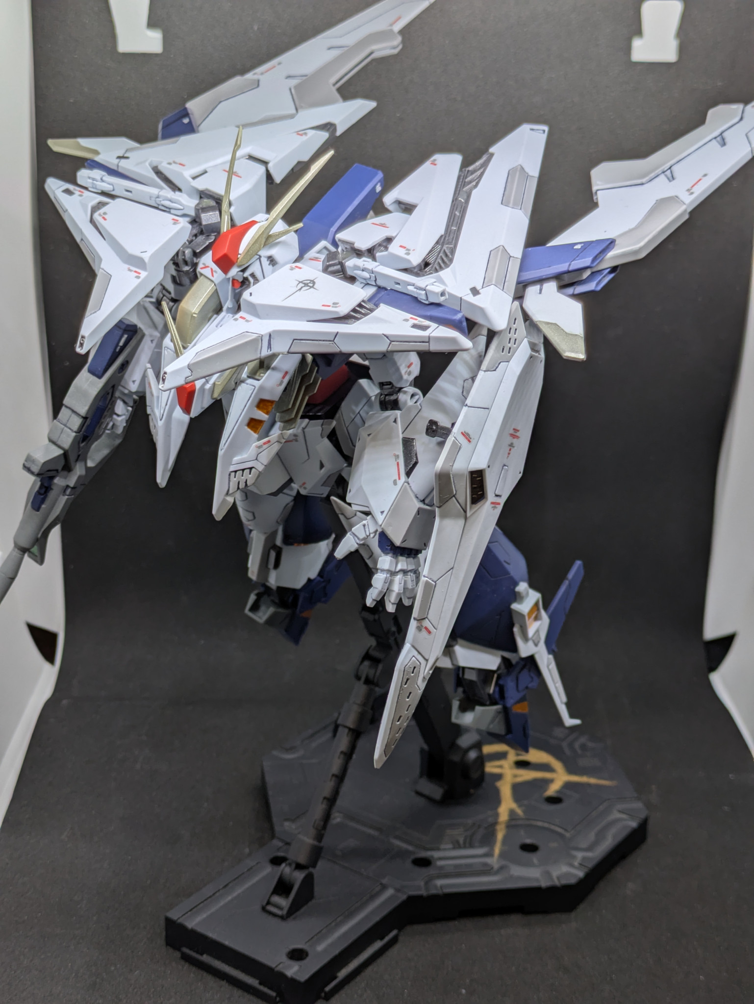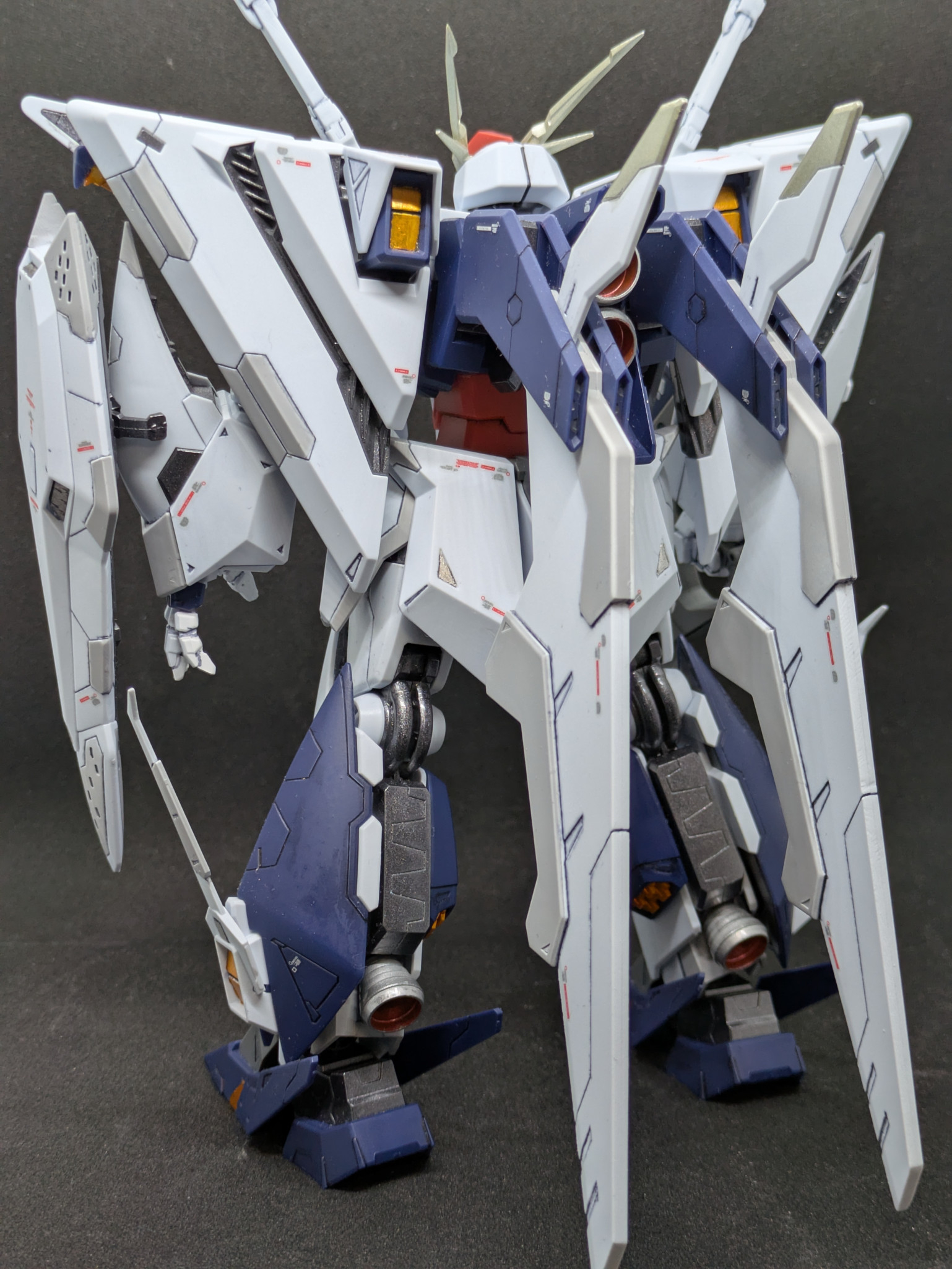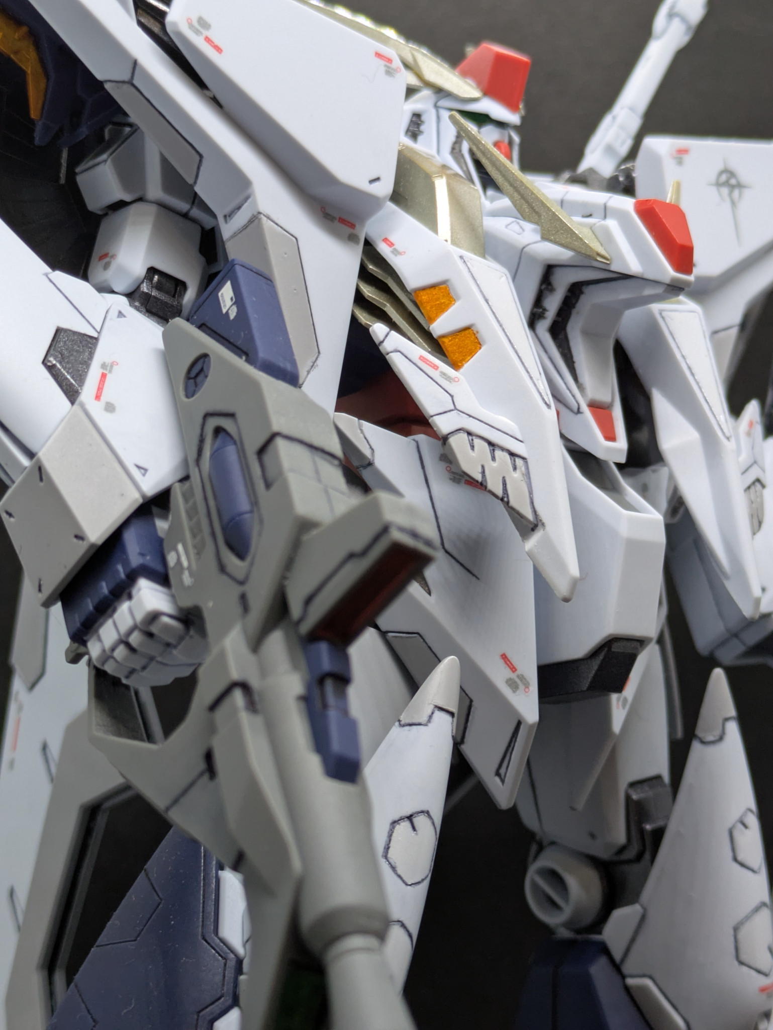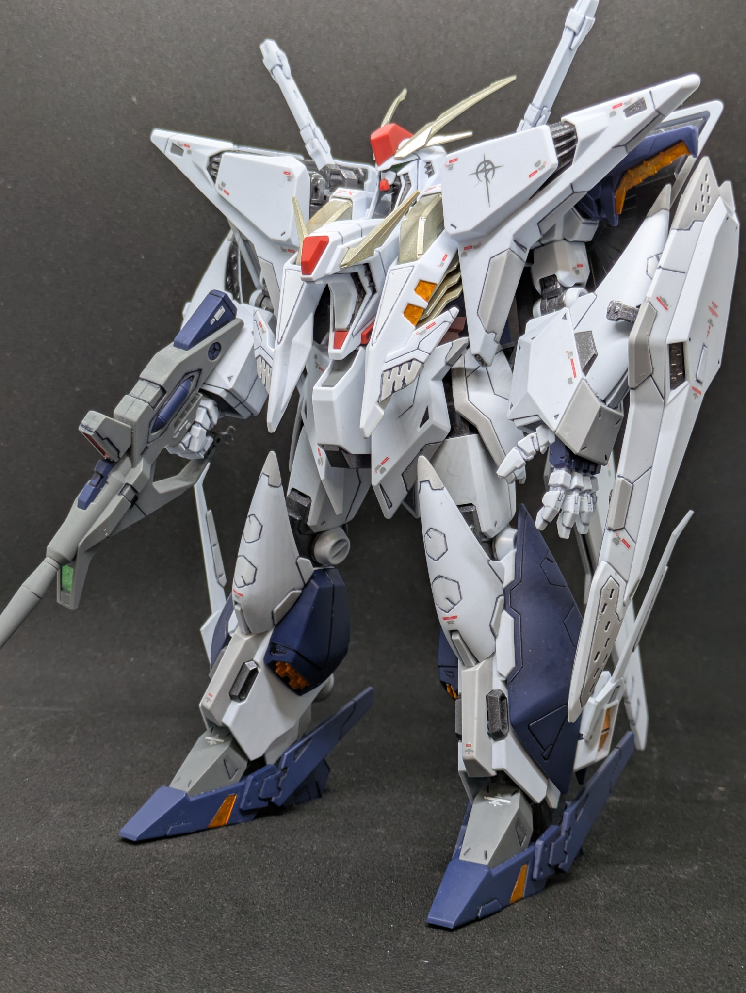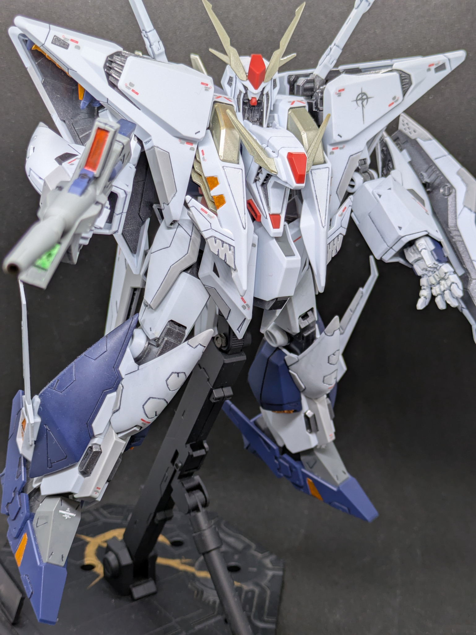部分塗装ですが、関節部分をガンメタル、黄色部分をシャンパンゴールドで塗装しています。白い部分の多い機体なので、白部分をつや消し吹いただけ、ライトグレーつや消し、パールホワイトに光沢トップコート吹いたものの3種類で塗り分けました。写真だとパールホワイトはほとんど分かりませんが。