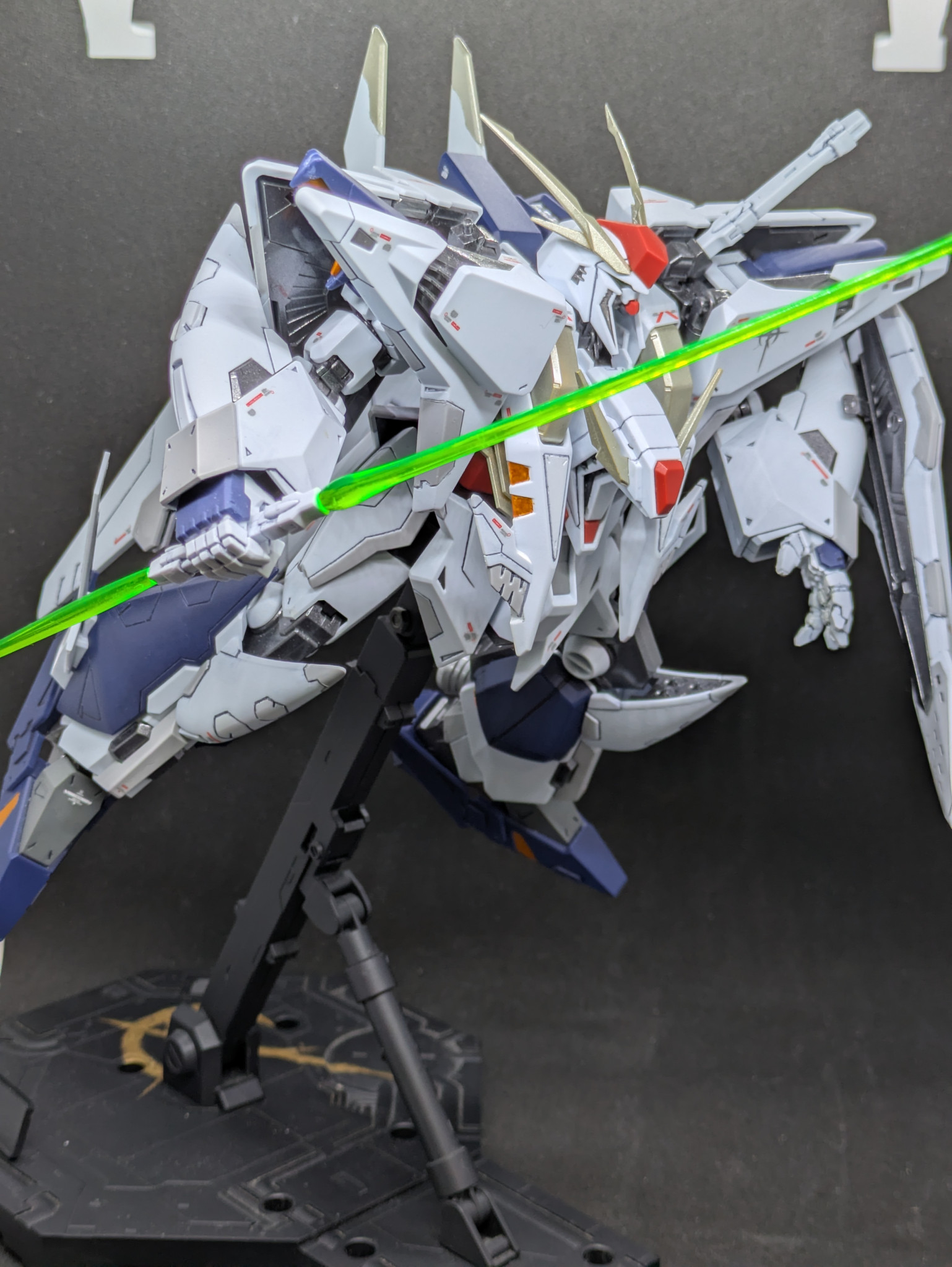 ビームライフルを構えた状態。センサー部分はメタリックレッドとメタリックイエローグリーンで塗装しました。ここのメタリックレッドがきれいに色が乗らず、何回か重ね塗りしています。