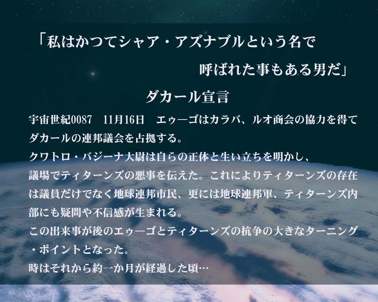 彼は一方的に殴られ冷たい手錠で両手を塞がれると、今まで敵だった筈のジオン軍残党ではなく同胞であるティターンズを憎んだ。