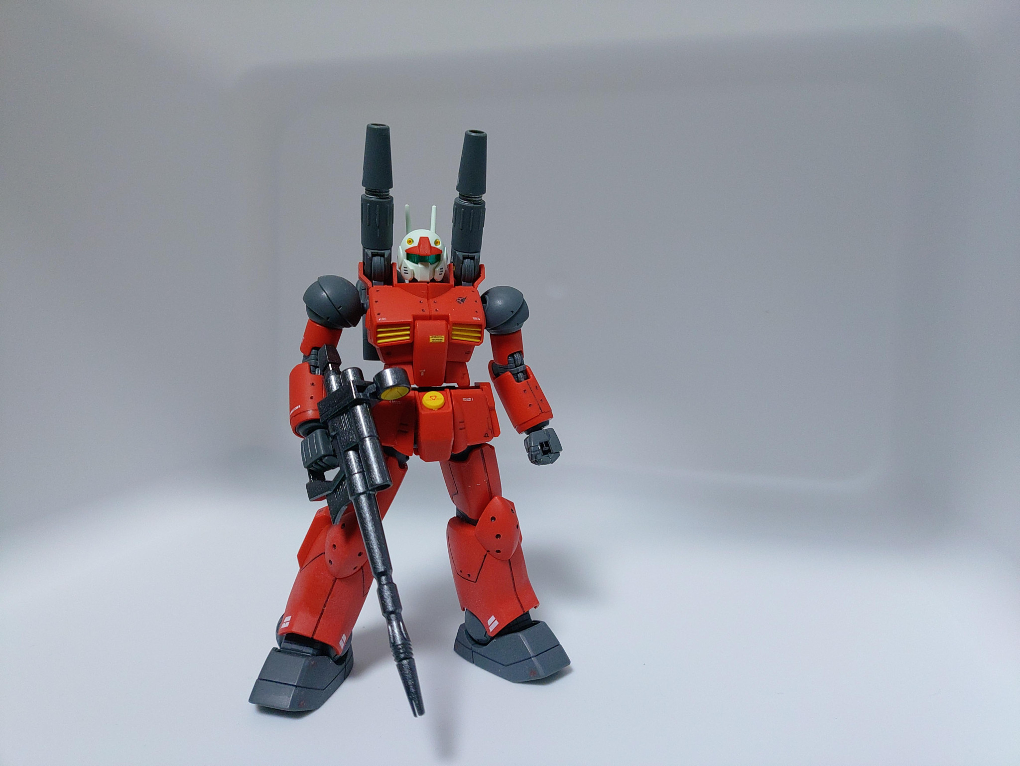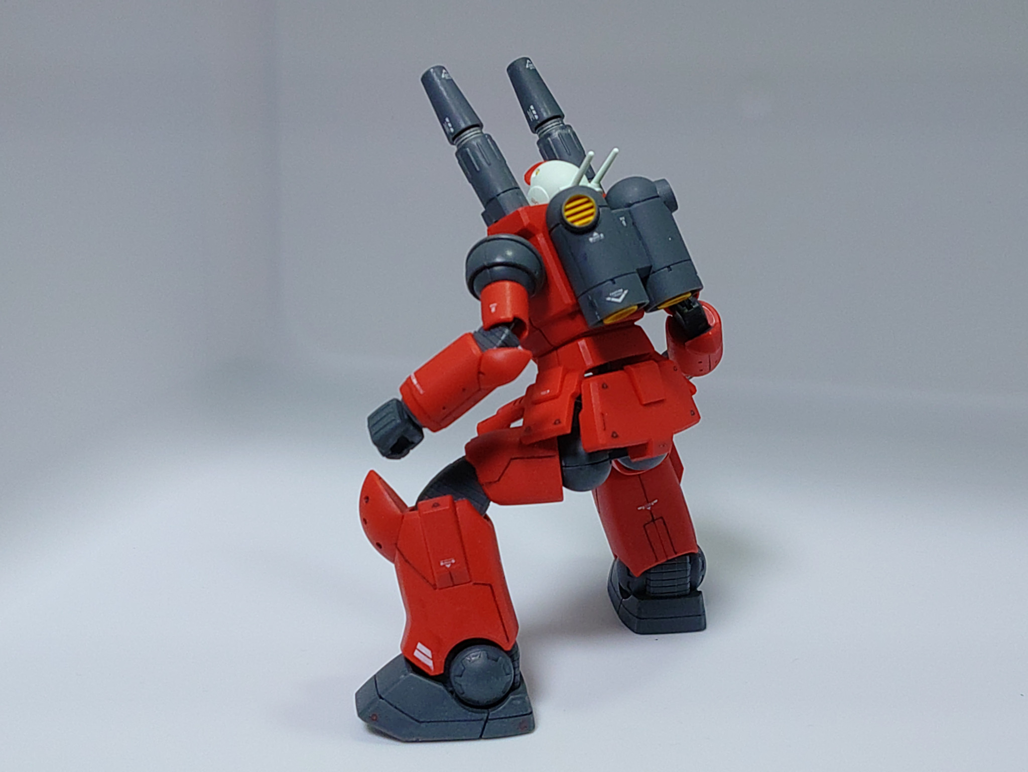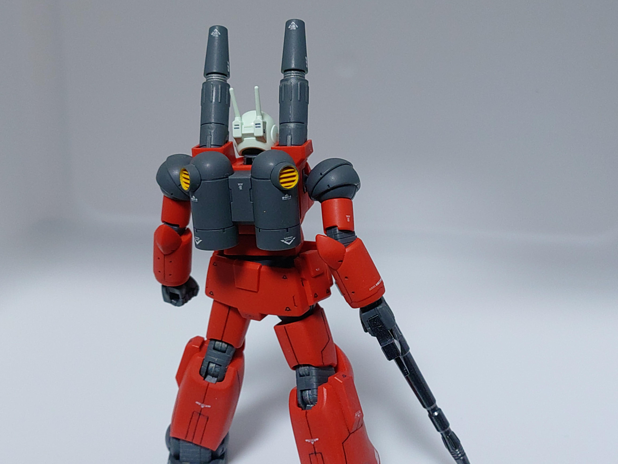 面が広めなのでスジボリの練習をしました。力を入れすぎるとうまくいきませんね。リベットモールドを100均のハンドドリルで入れたのですがまぁ機体のデザインに合ったものが入れれたと思います。引き続き合わせ目消しをしましたがうまくいきませんでした。なぜだ。塗装は武器のスプレー塗りとキャノンの一部のガンダムマーカースプレーです。ガンダムマーカーの墨入れ、水転デカールとトップコートの仕上げですが、トップコートによりデカールの浮き、墨入れの滲みがありました。吹きすぎたのか、湿度が高かったのか、反省するところです。