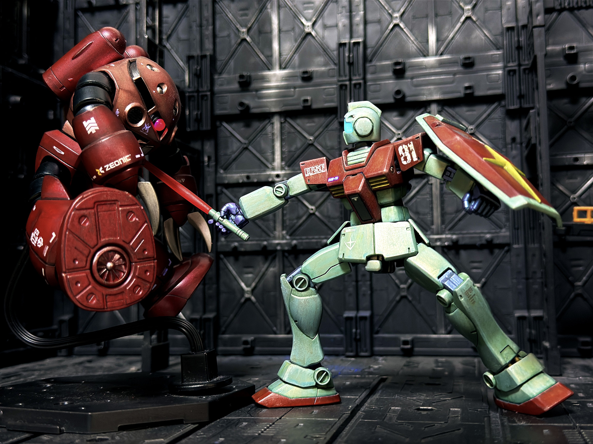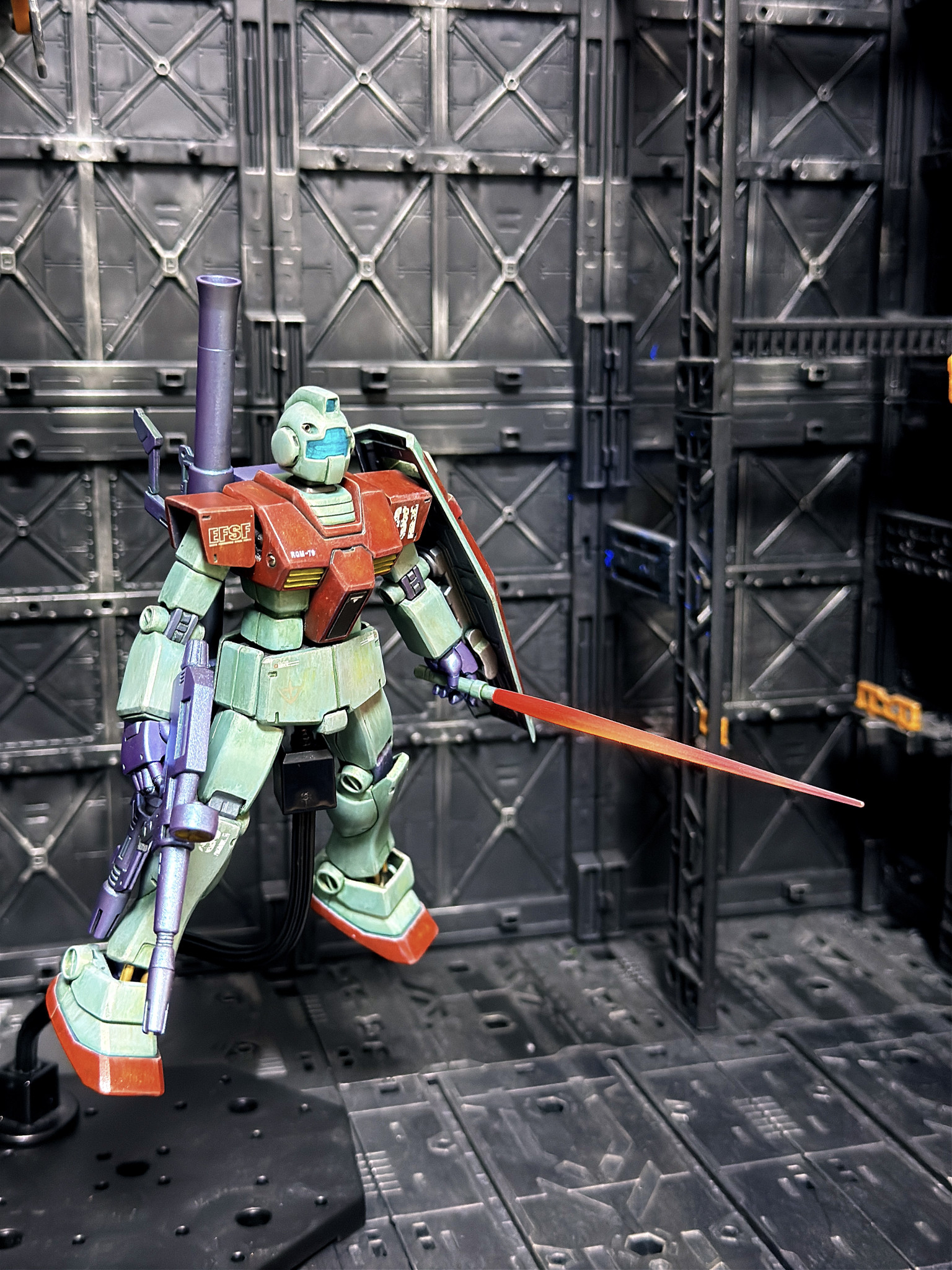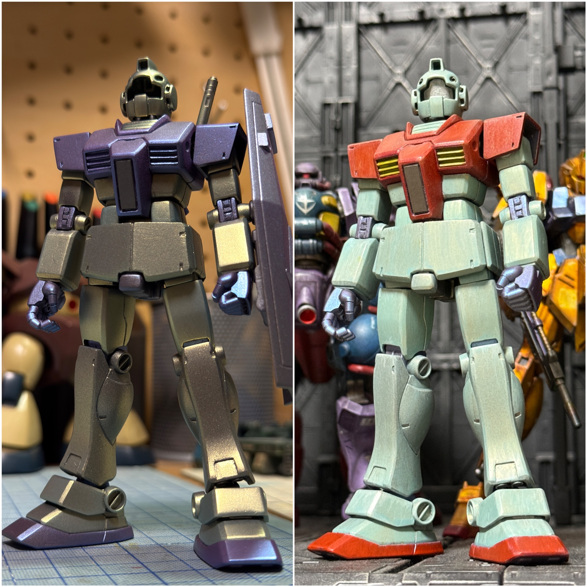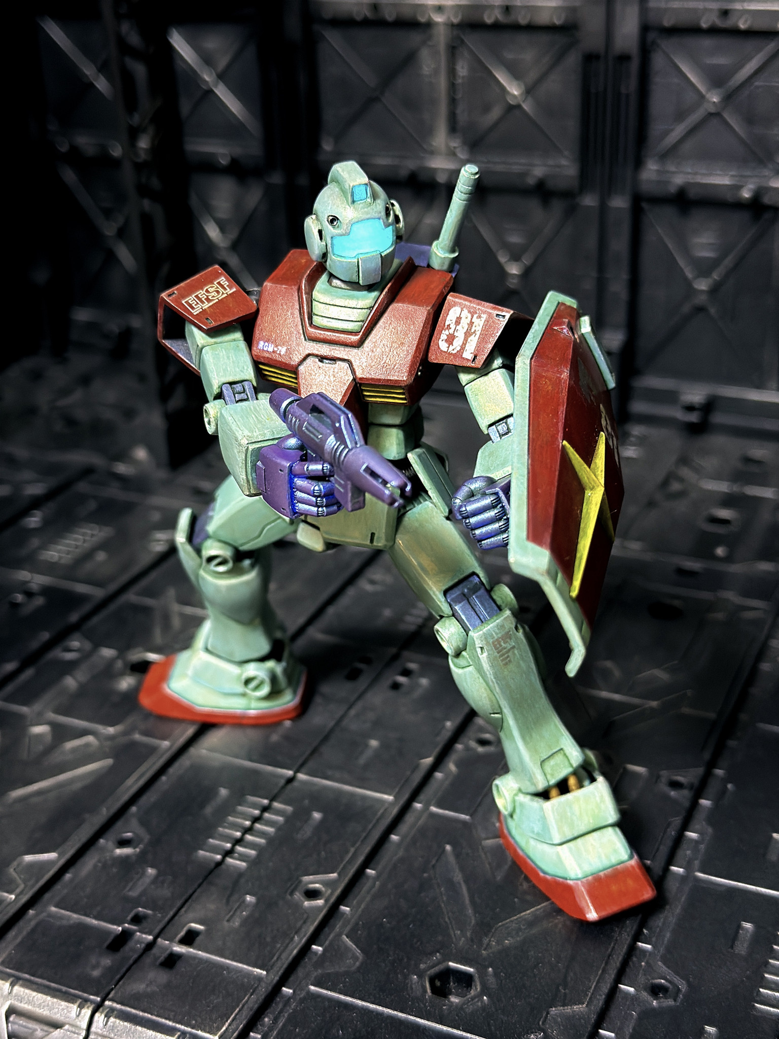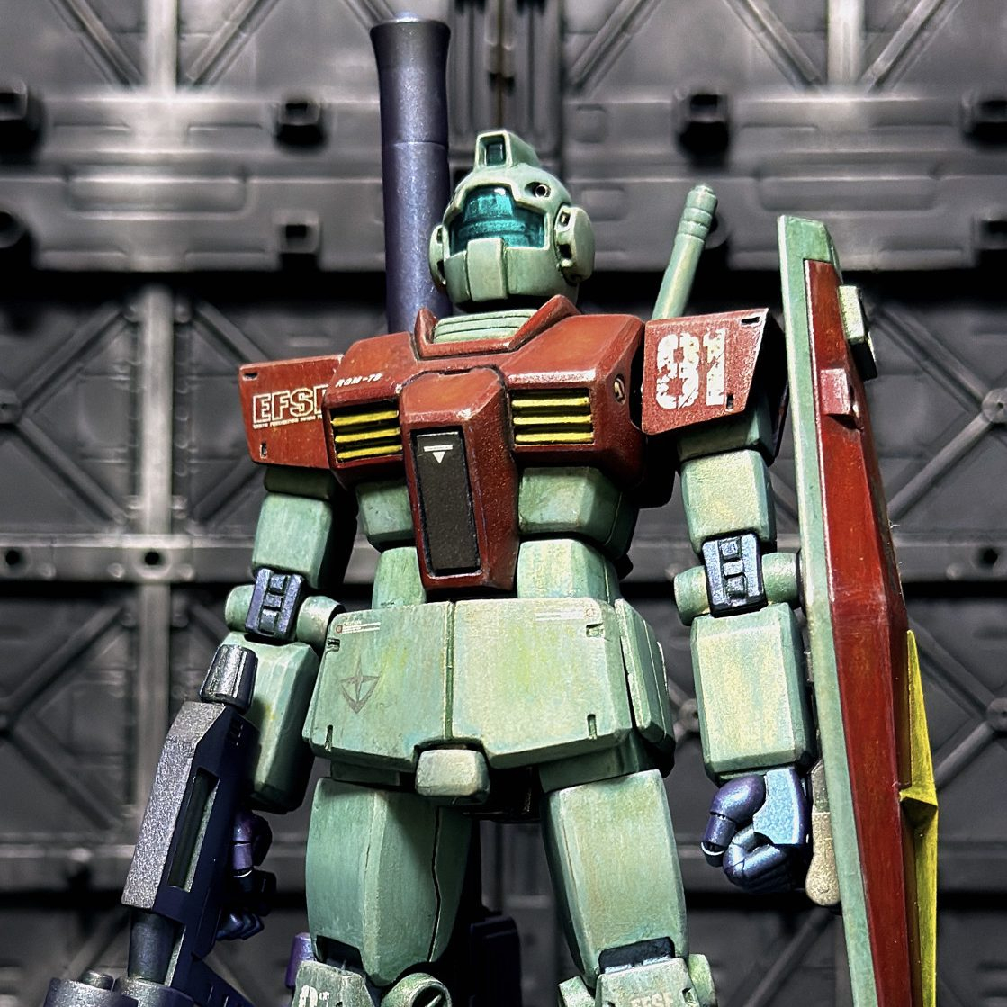 HGジムを関節等徹底改修&シタデル筆塗りで仕上げました。ガンプラ改造の基礎を徹底的に叩き込むために、ある意味練習教材として徹底的にいじくり回したため、完成まで5ヶ月くらいかかりました。なんとか4月6日ジムの日に間に合って良かった💦