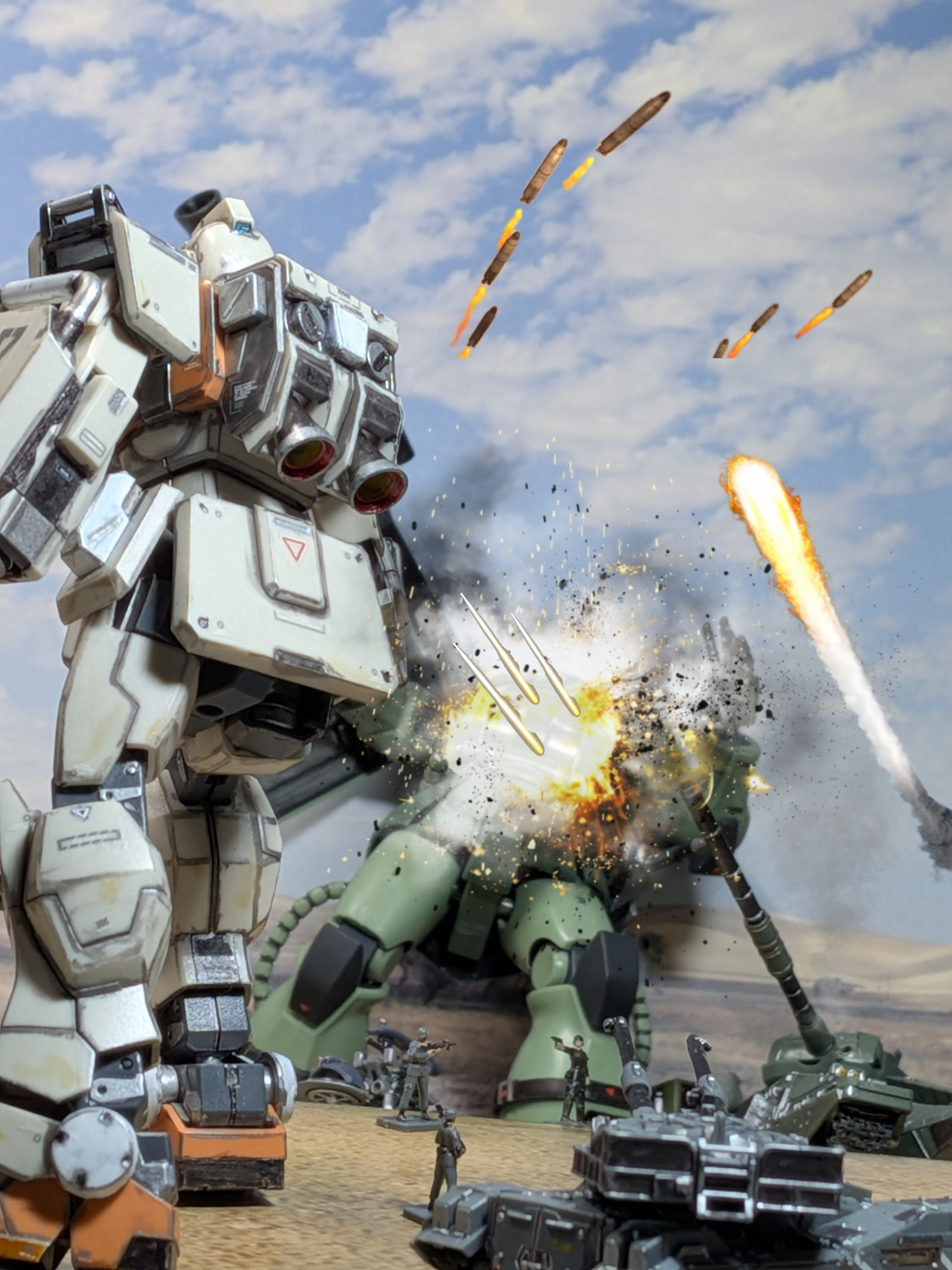 ジムの日、陸戦型ジムをメインにしたジオラマの戦闘シーン、とてもかっこいいですね😆