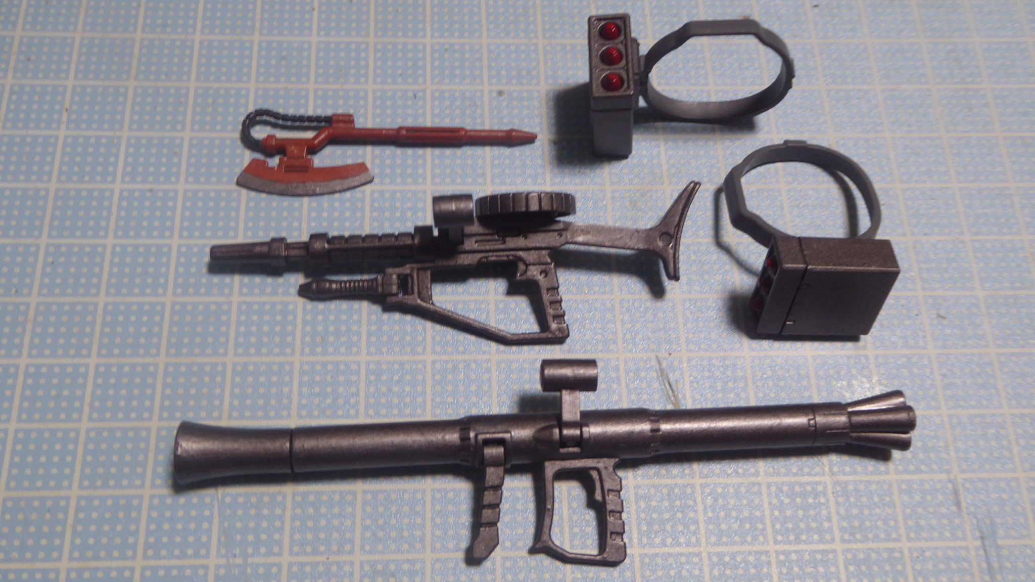 ヒートホーク本体の色は画像上段にある、ガイアカラー「焔朱」と同「パープルヴァイオレット」の調色による試みです。