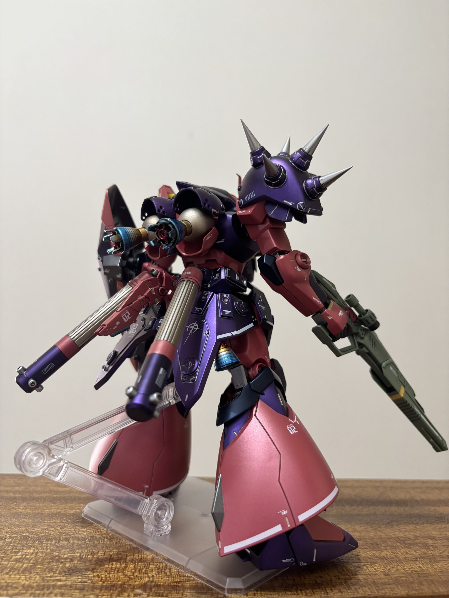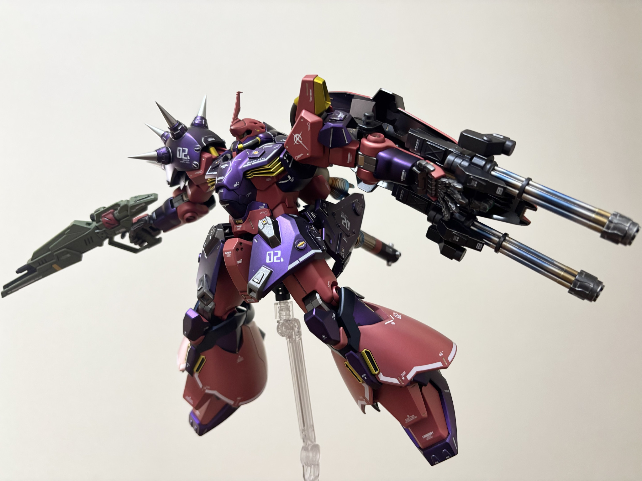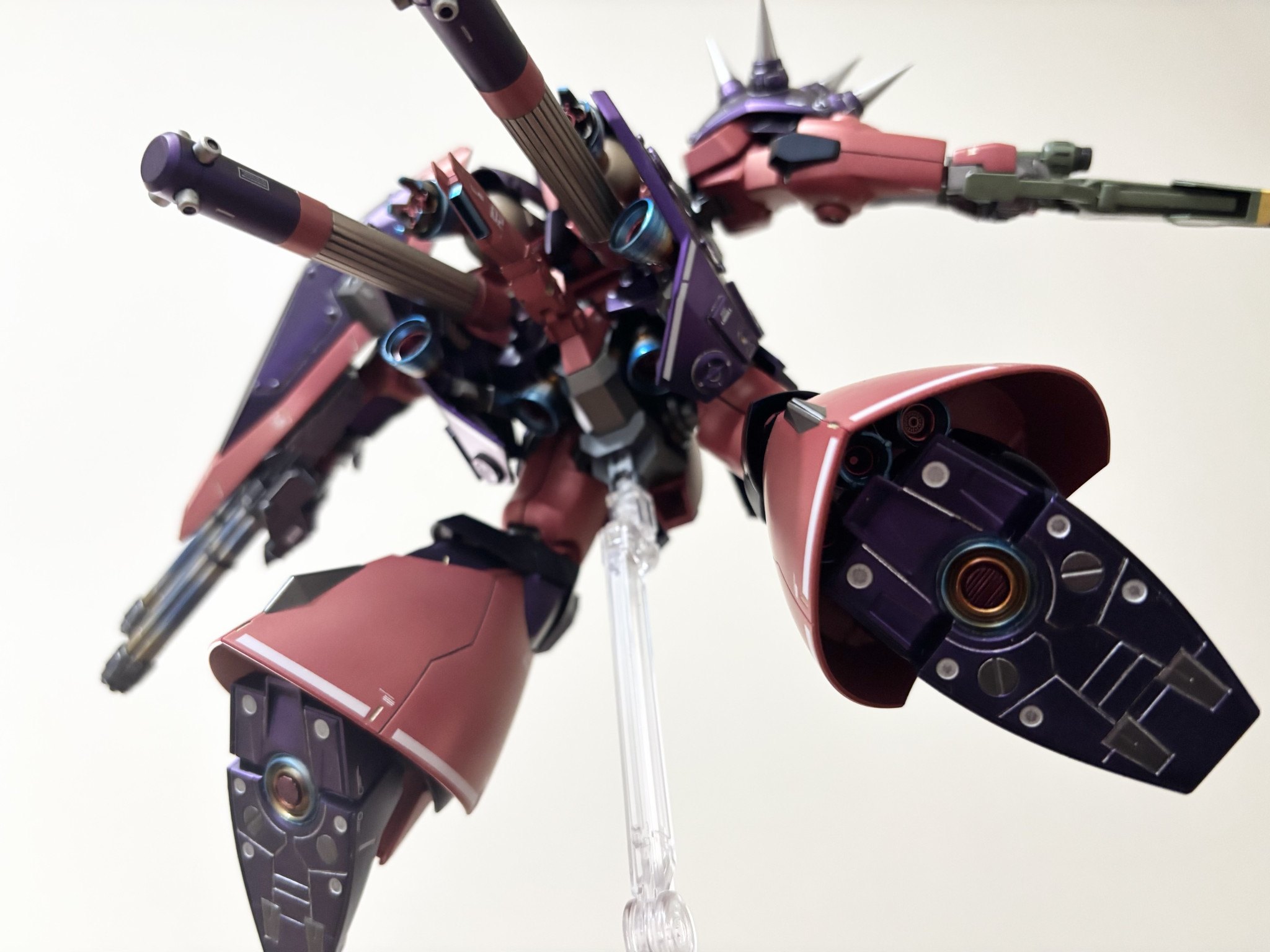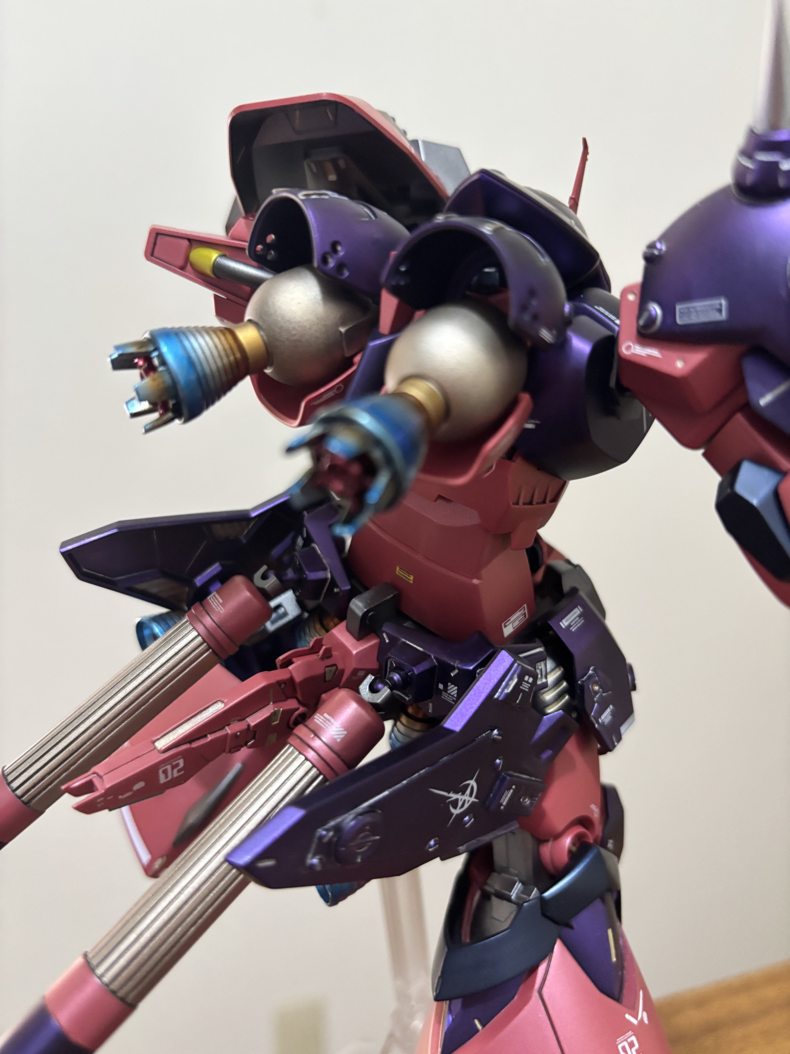 塗装。紫は黒下地にアメジストパープル。赤に近いピンクは自家製ピンクサフの上からルビーレッド。黒はプリズムブルーブラック。間接は全てスターブライトアイアン。バーニア、スパイクのシルバーはスーパージュラルミン。エンジン、タンクのゴールドはシャンパンゴールド。ライフルの緑はエアクラフトグレーグリーン。黄色はスターブライトブラスです。