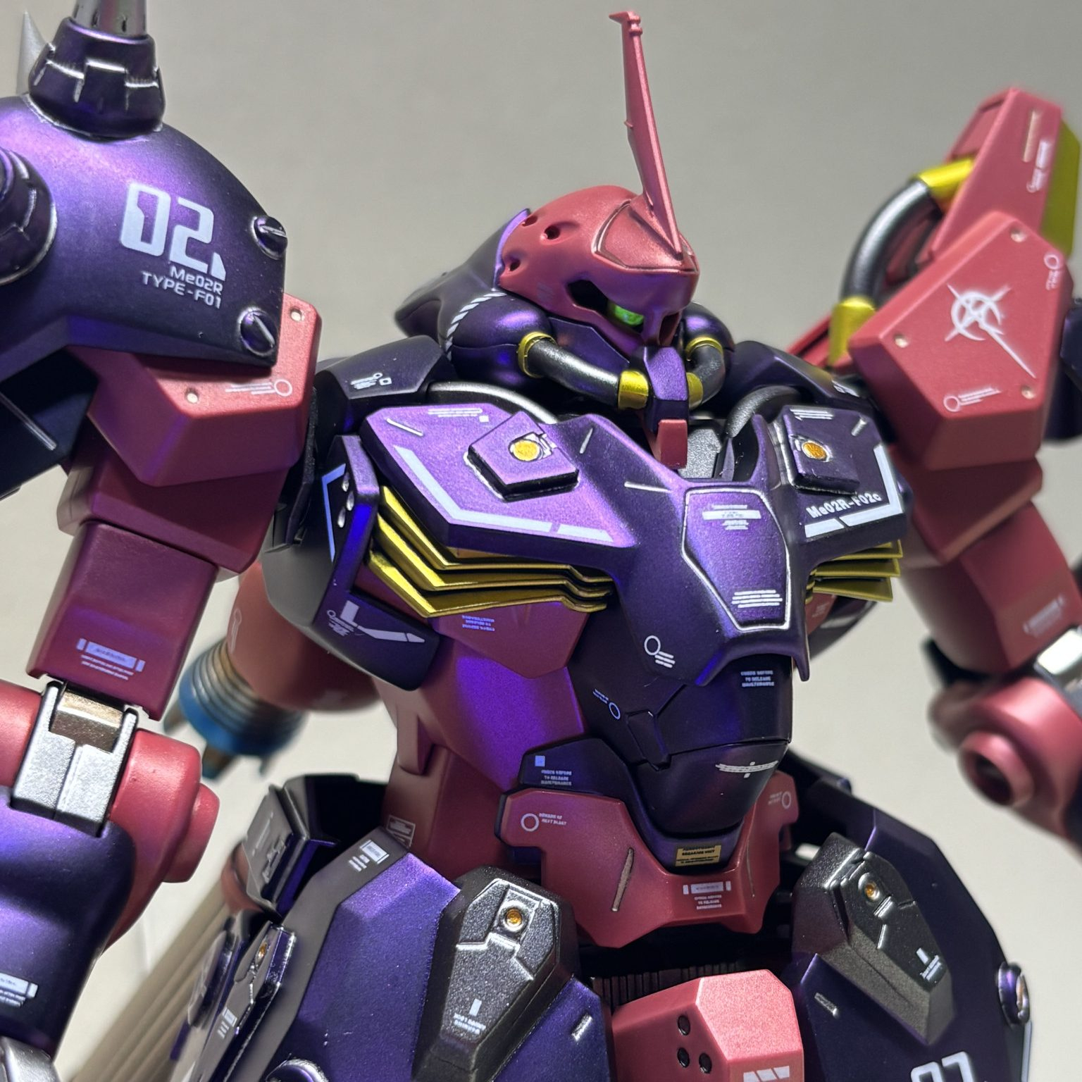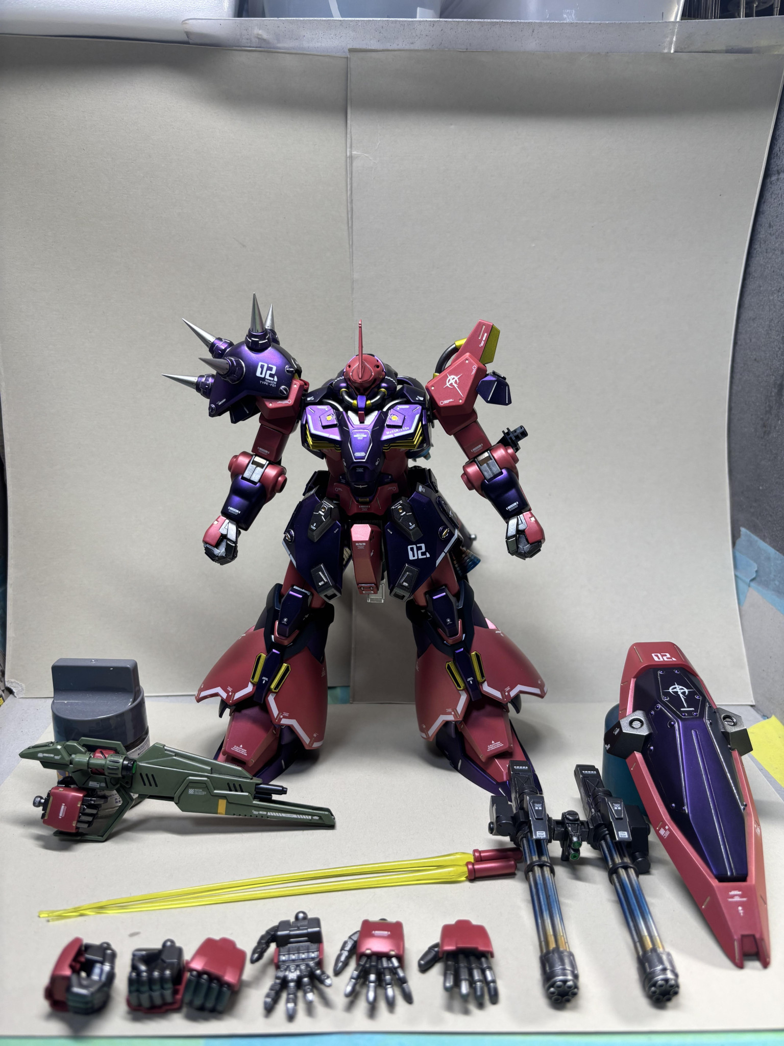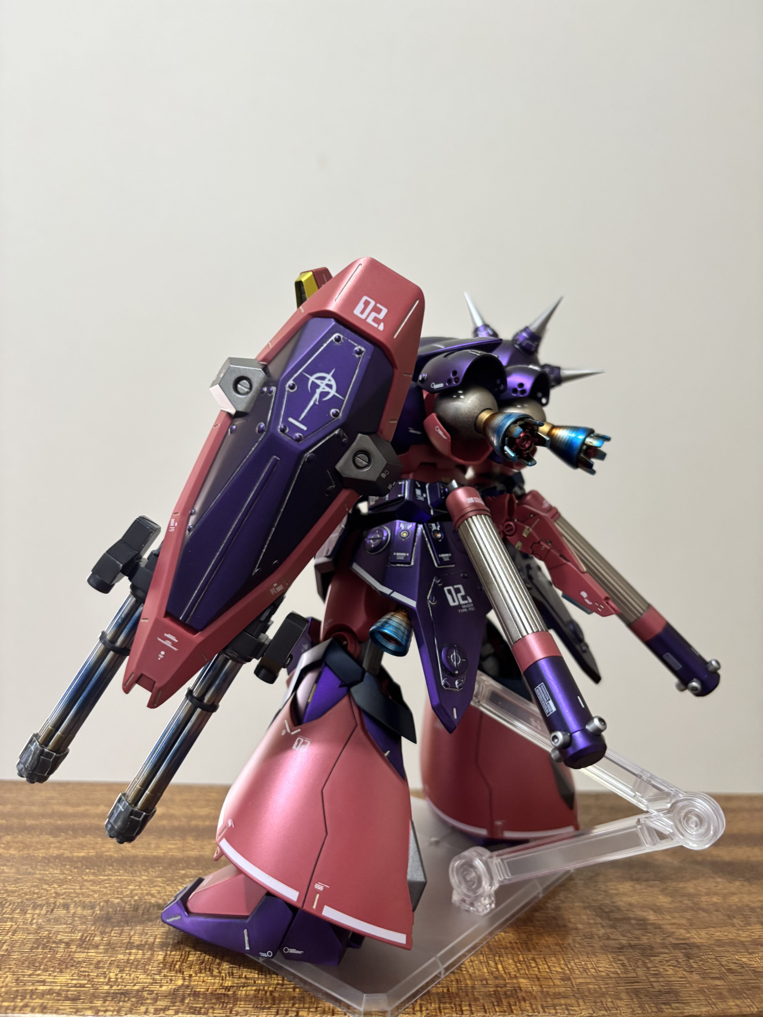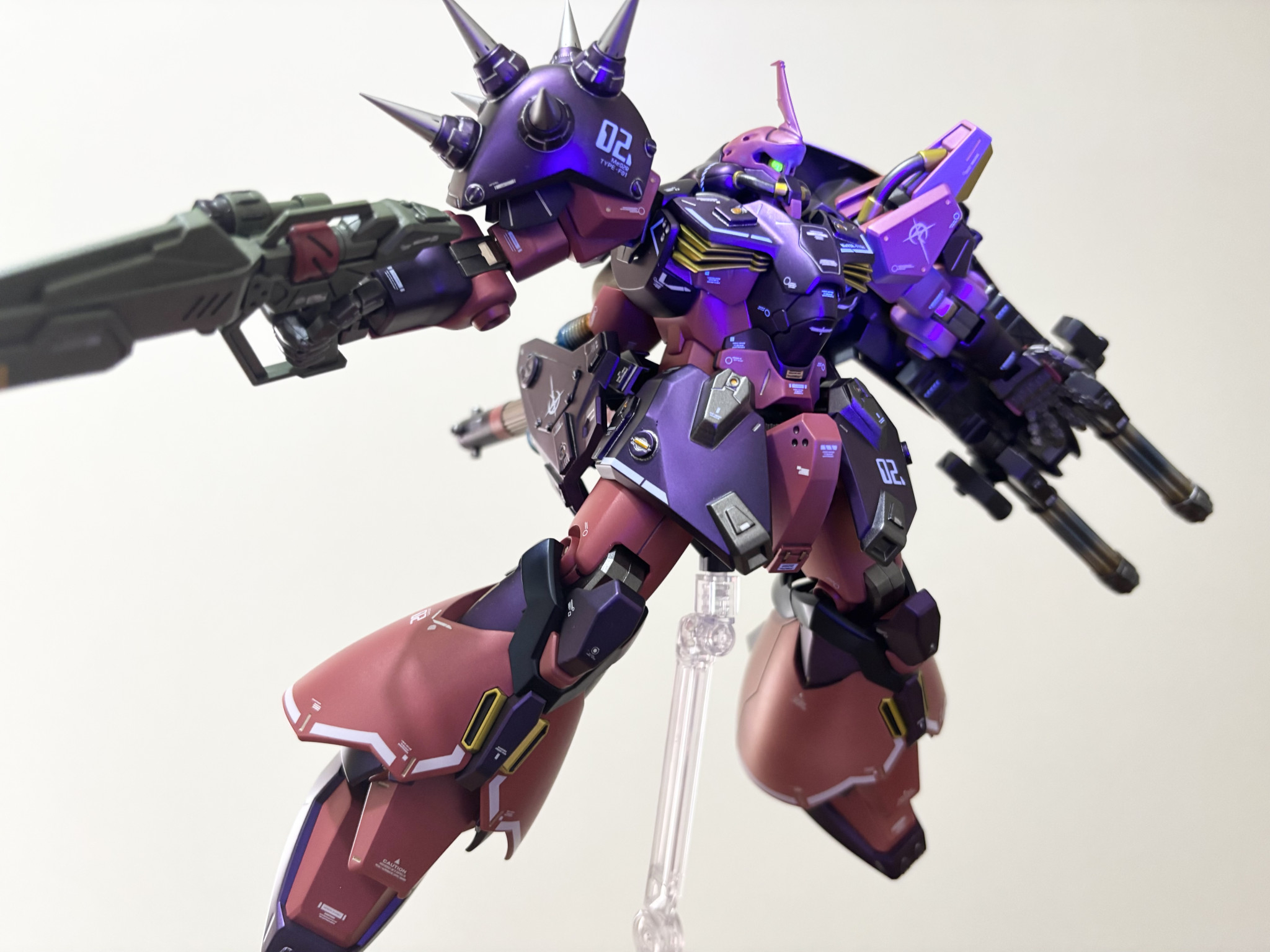 塗装。紫は黒下地にアメジストパープル。赤に近いピンクは自家製ピンクサフの上からルビーレッド。黒はプリズムブルーブラック。間接は全てスターブライトアイアン。バーニア、スパイクのシルバーはスーパージュラルミン。エンジン、タンクのゴールドはシャンパンゴールド。ライフルの緑はエアクラフトグレーグリーン。黄色はスターブライトブラスです。