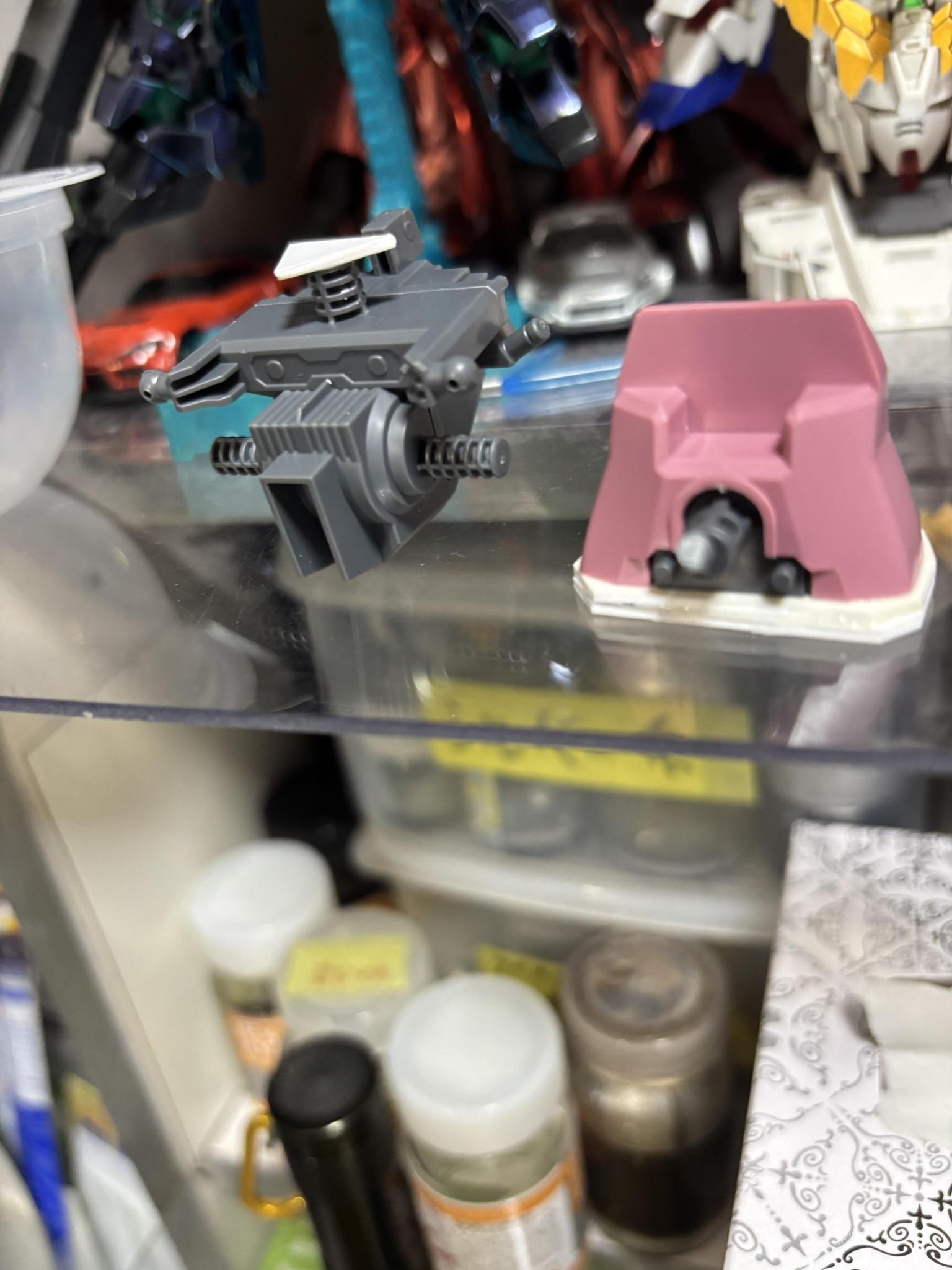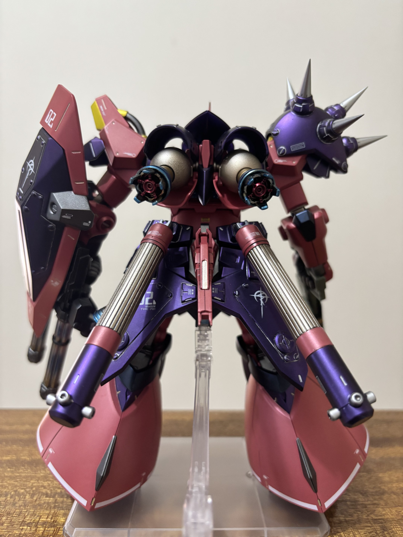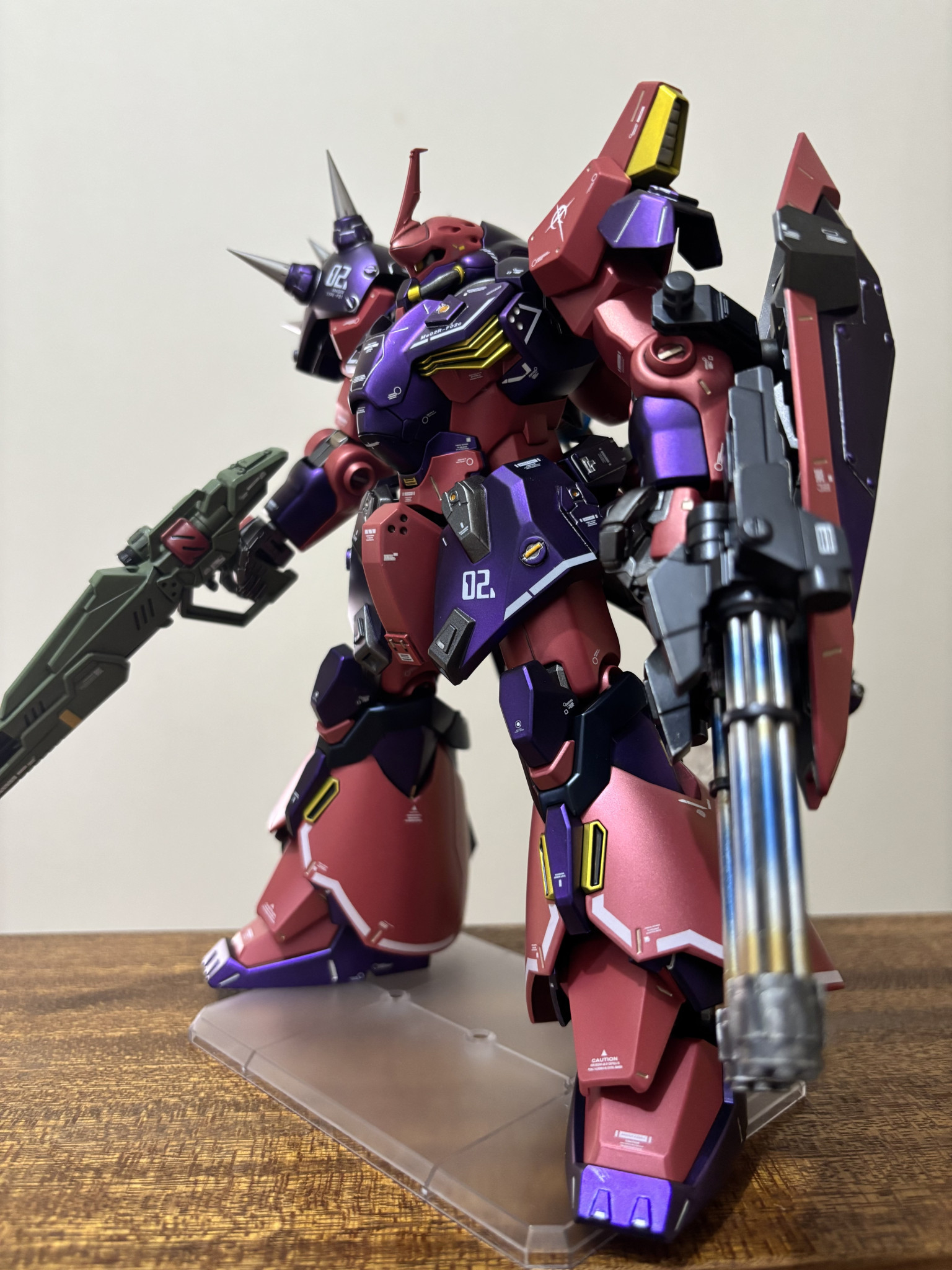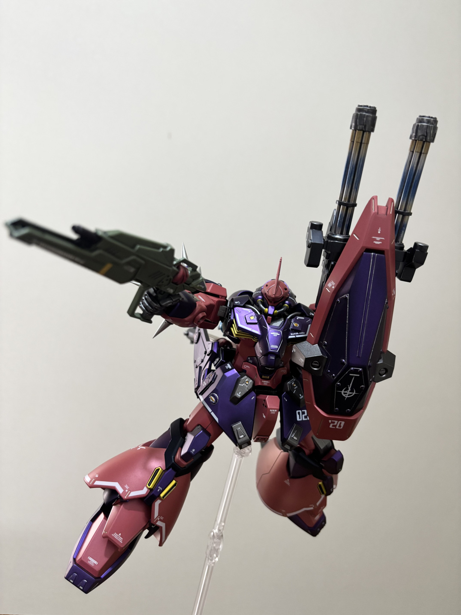 塗装。紫は黒下地にアメジストパープル。赤に近いピンクは自家製ピンクサフの上からルビーレッド。黒はプリズムブルーブラック。間接は全てスターブライトアイアン。バーニア、スパイクのシルバーはスーパージュラルミン。エンジン、タンクのゴールドはシャンパンゴールド。ライフルの緑はエアクラフトグレーグリーン。黄色はスターブライトブラスです。