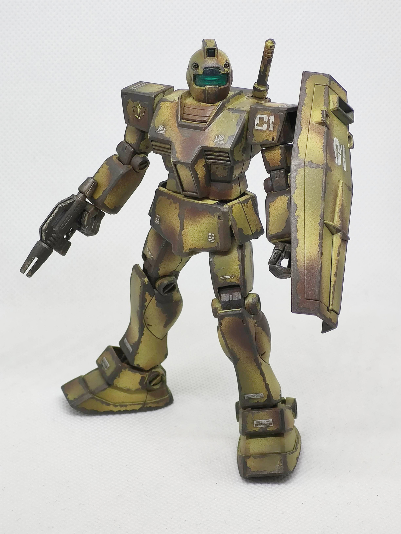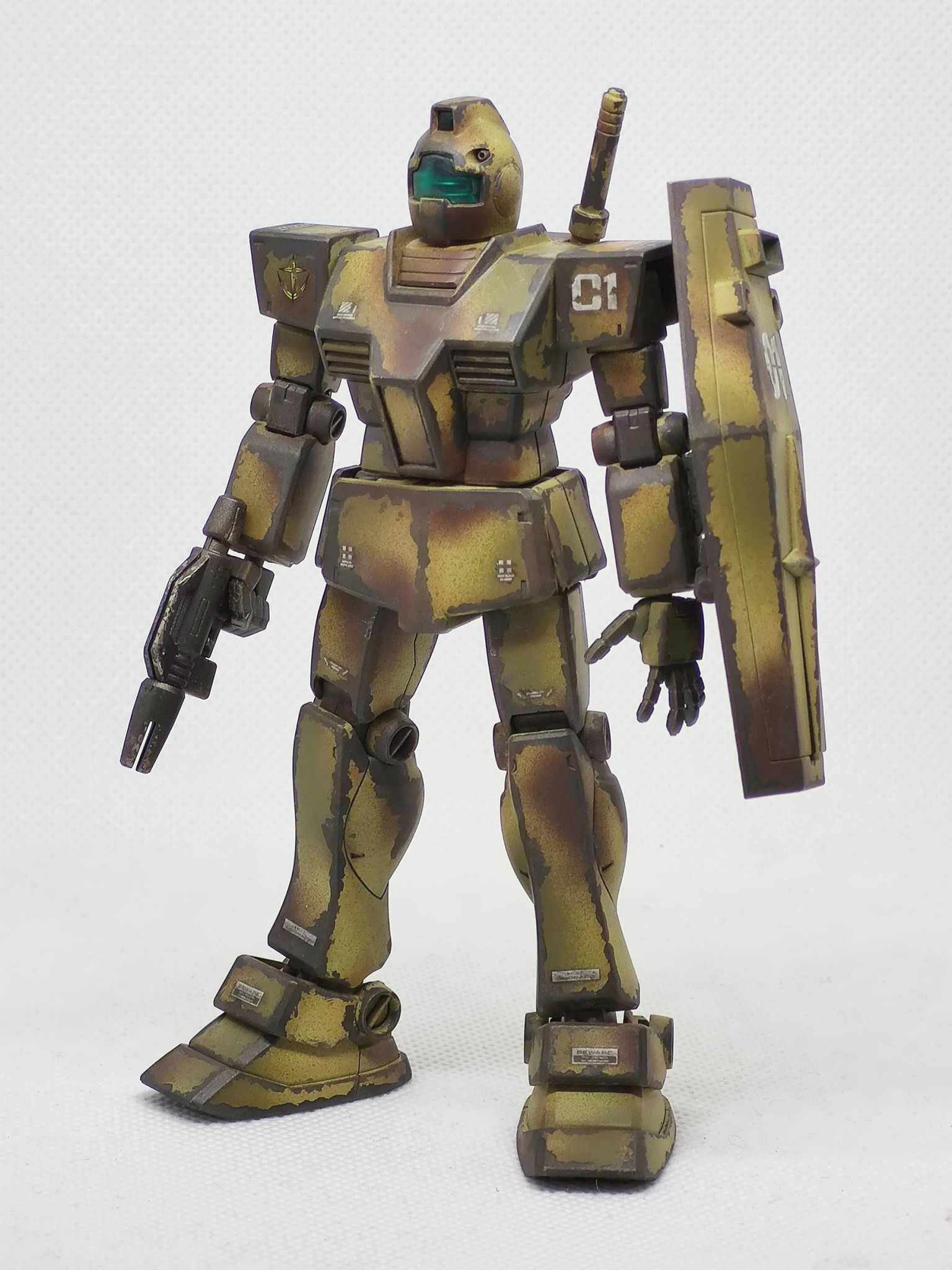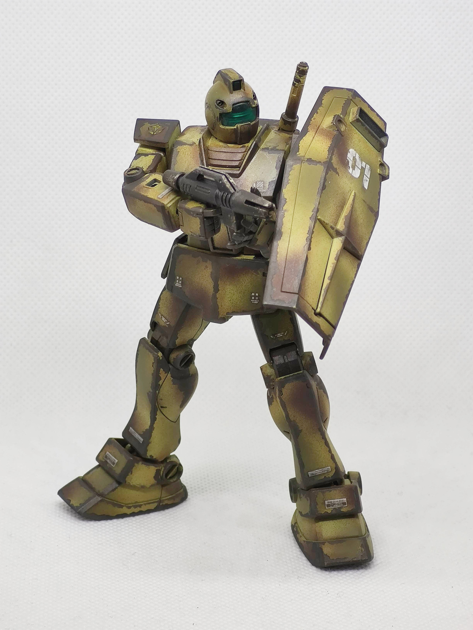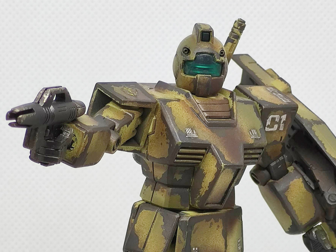 辺境の部隊で補給も整備も無しで使い倒された想定のジムです。陸戦用に迷彩色にしたものの、その塗装も剥げて錆でさらに迷彩化(?)が進んだ感じです。まだ戦えるのは優秀なのか運が良いのか?