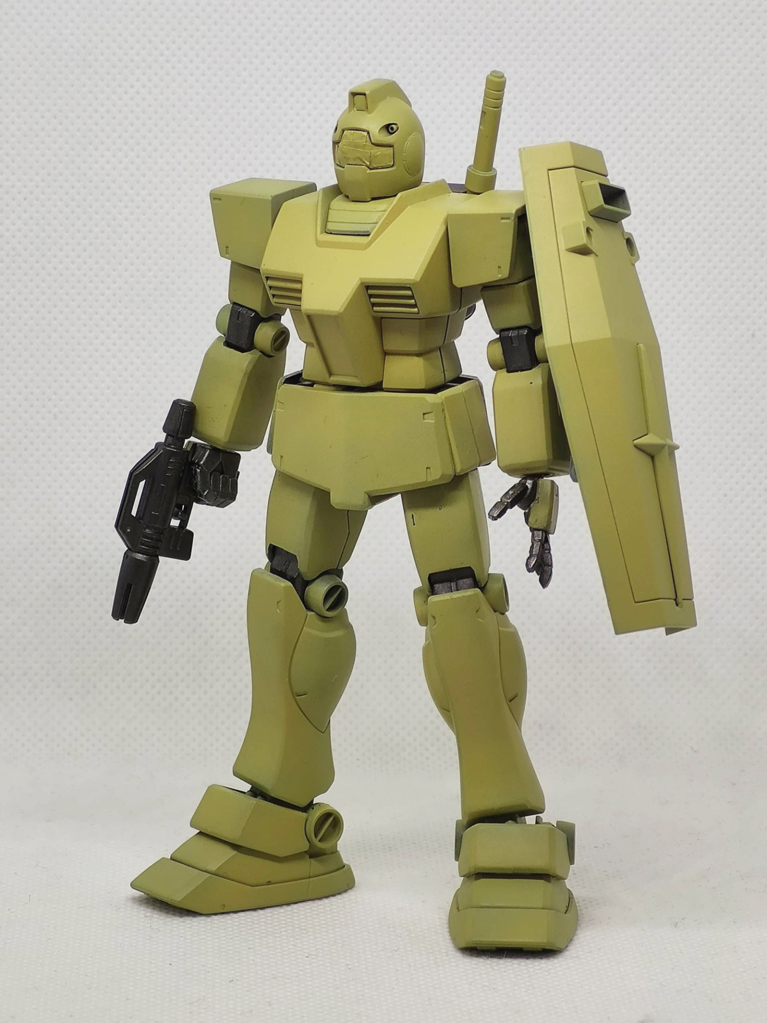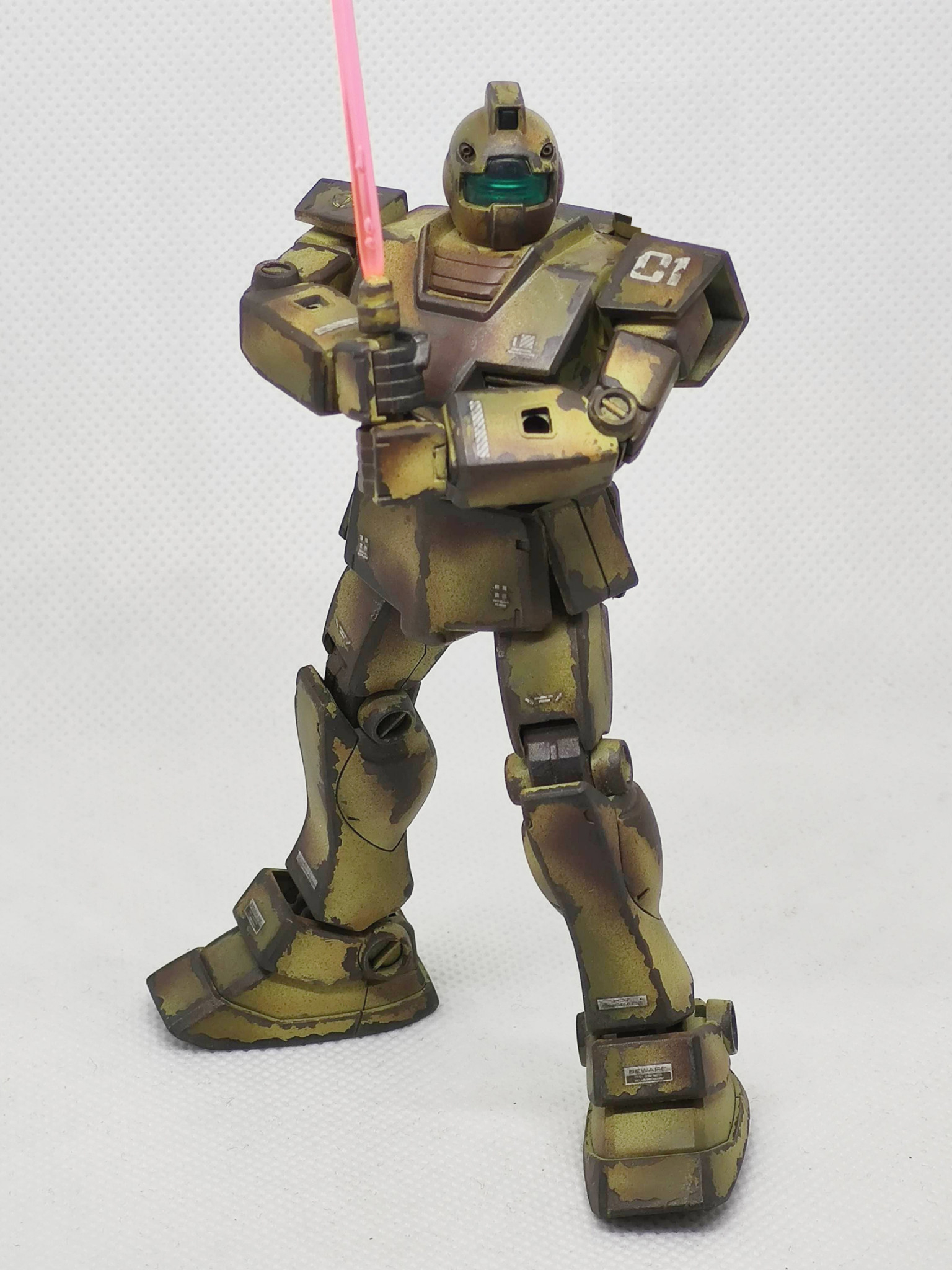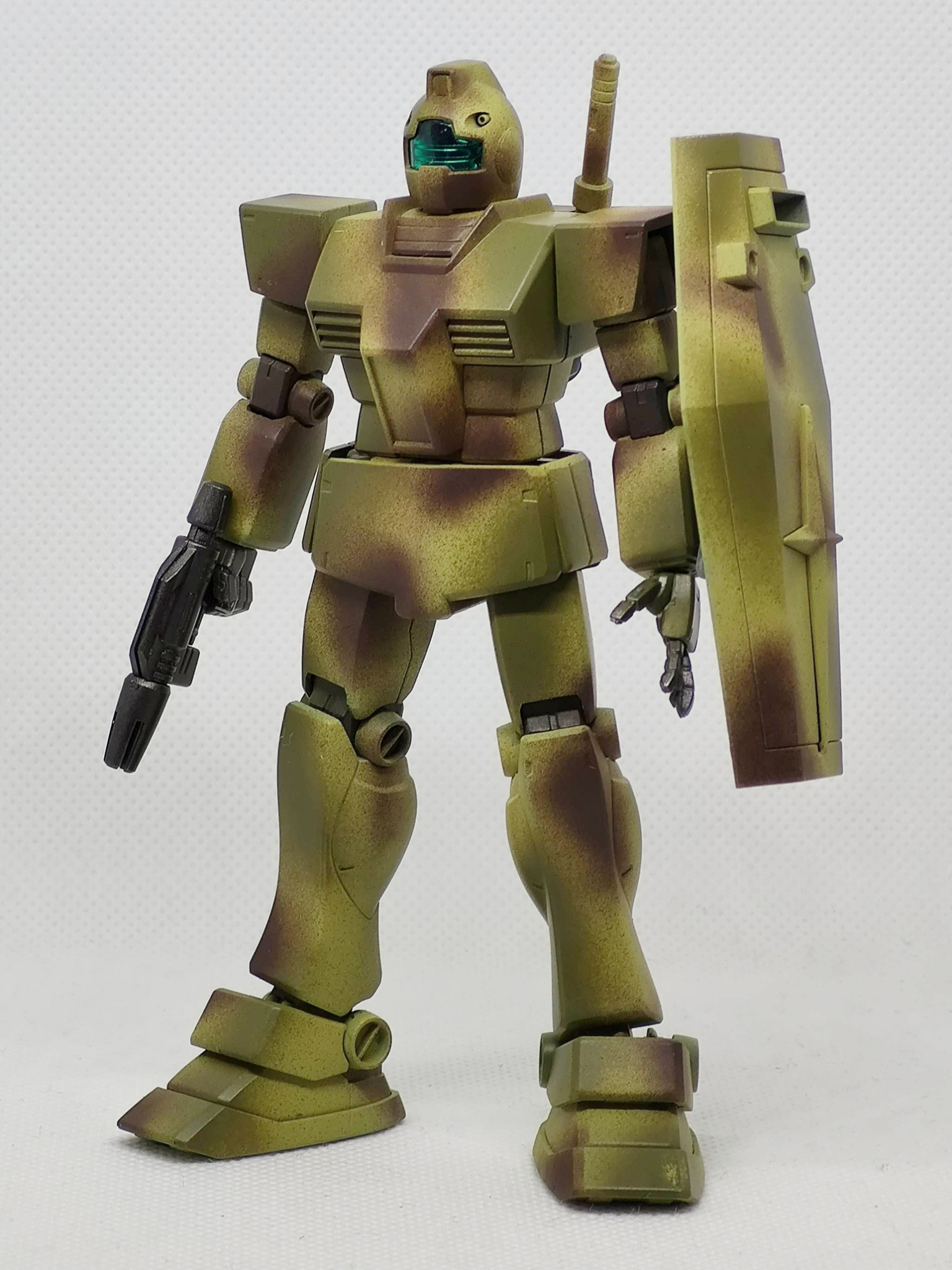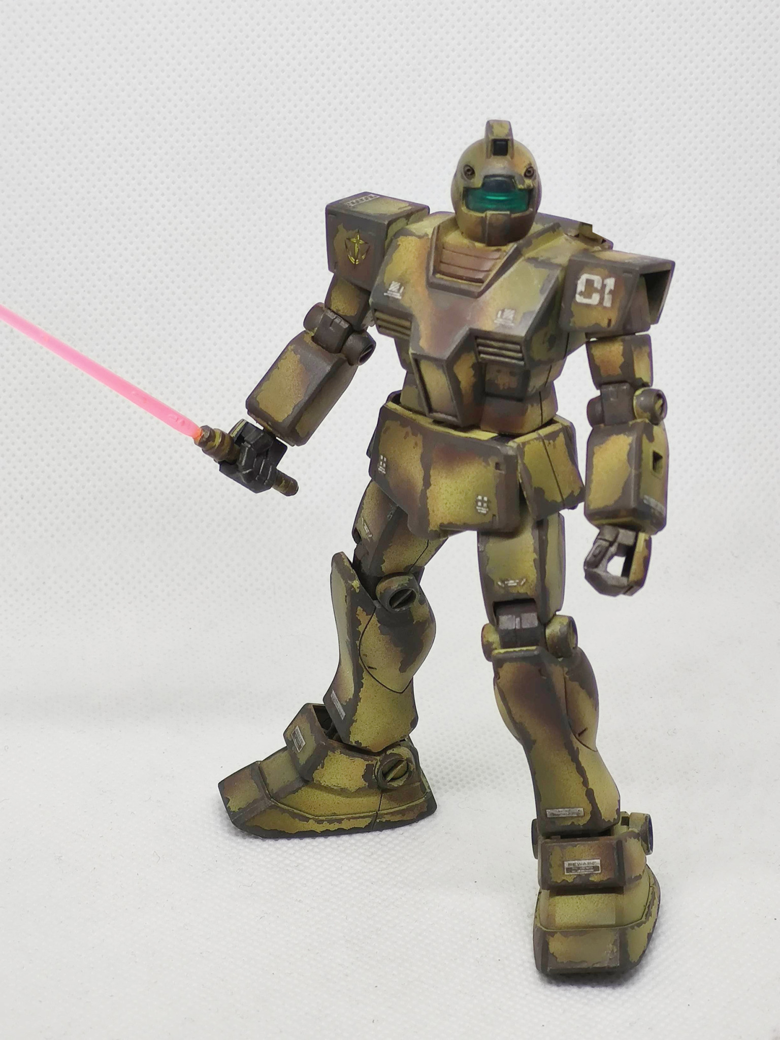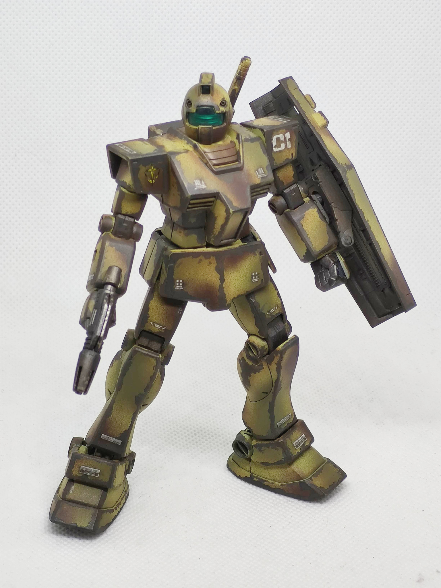 辺境の部隊で補給も整備も無しで使い倒された想定のジムです。陸戦用に迷彩色にしたものの、その塗装も剥げて錆でさらに迷彩化(?)が進んだ感じです。まだ戦えるのは優秀なのか運が良いのか?