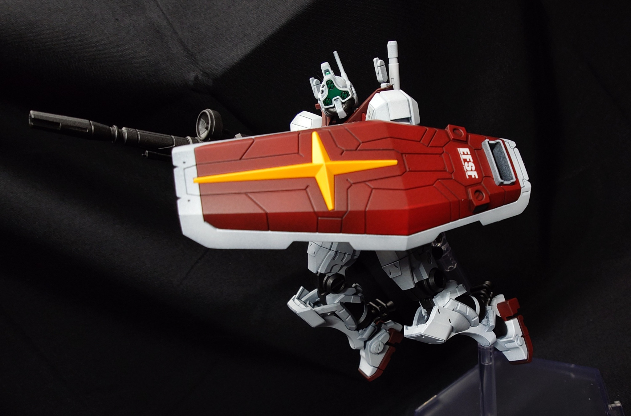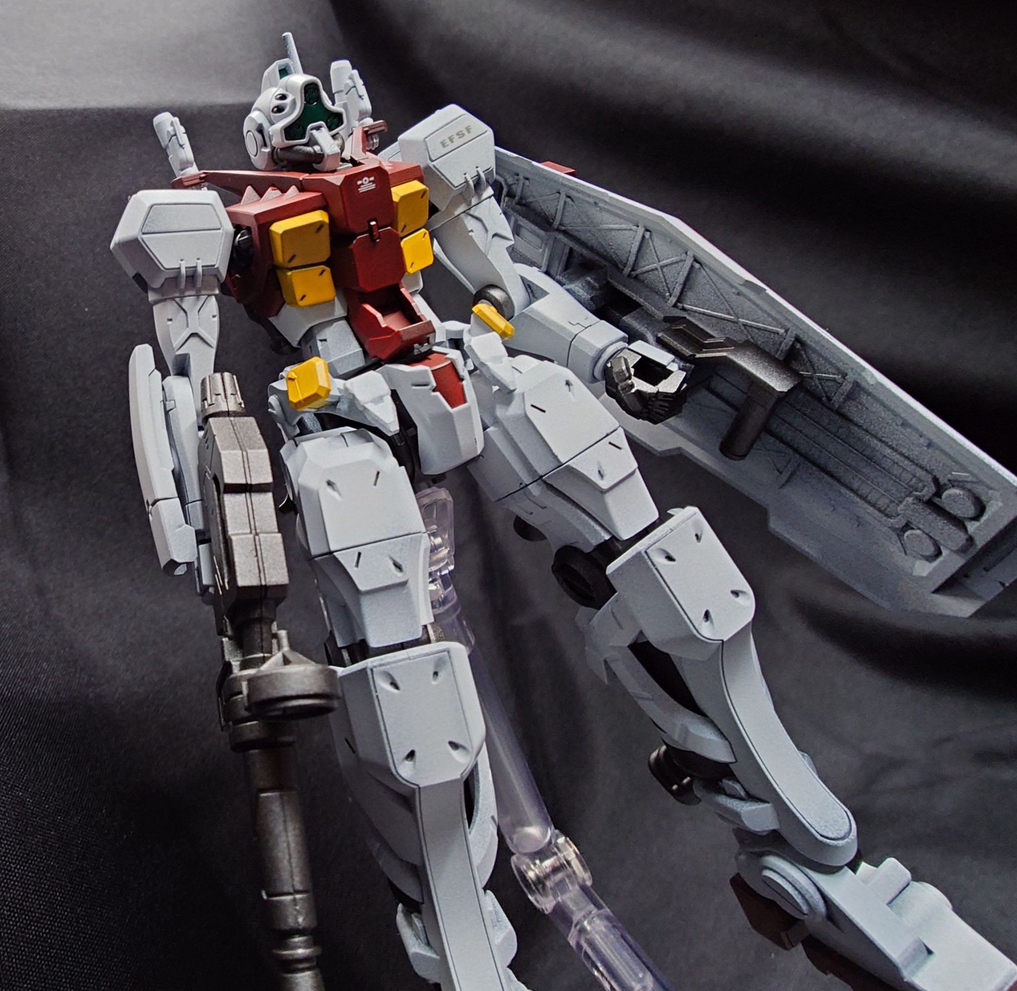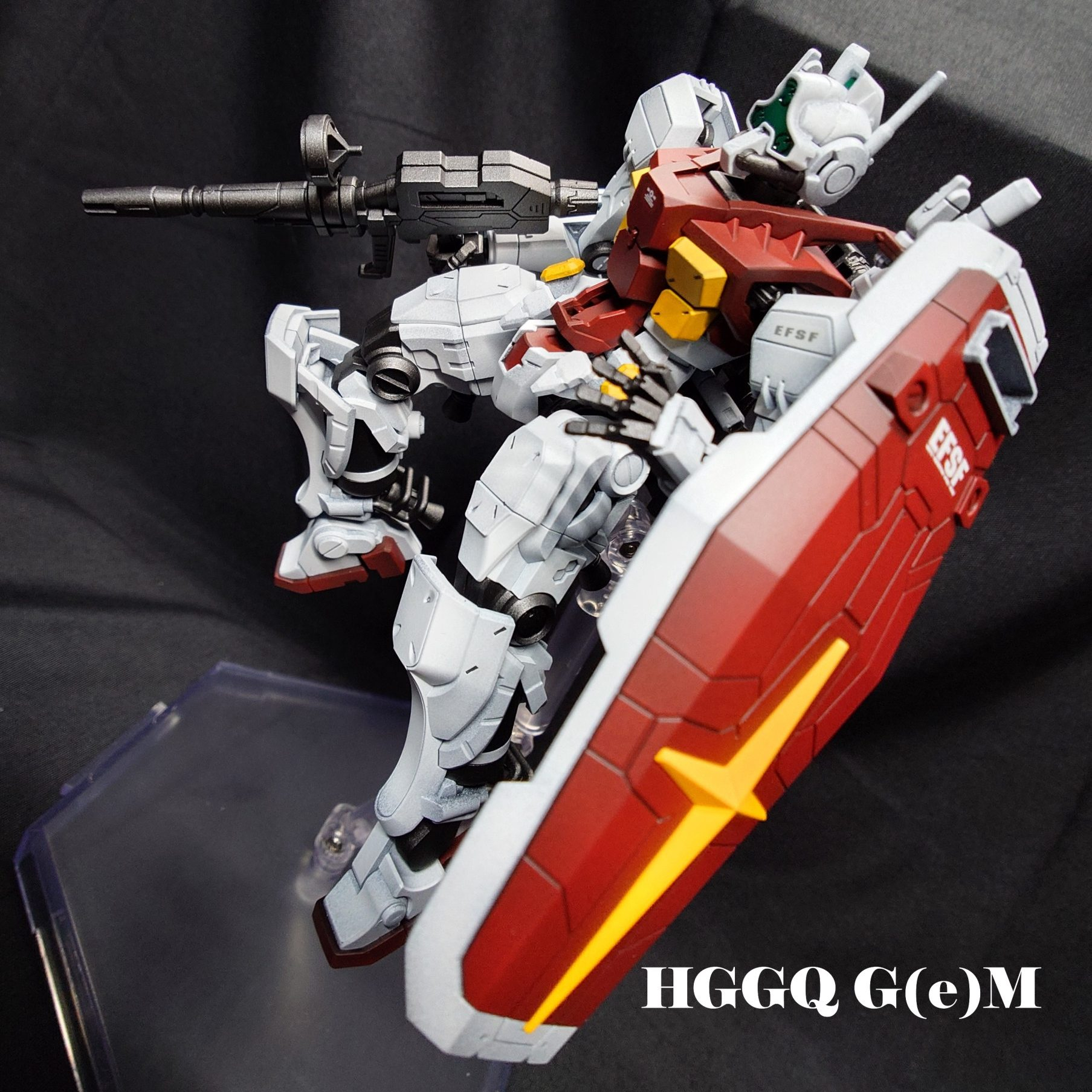 カラーリングはスガイ機に近いですが、よりジムらしい色合いで製作しました。ビームライフルとシールドはEG 万博ガンダムからの流用です。万博ガンダムはディテールが細かいので、GQキットとの親和性は高いです。