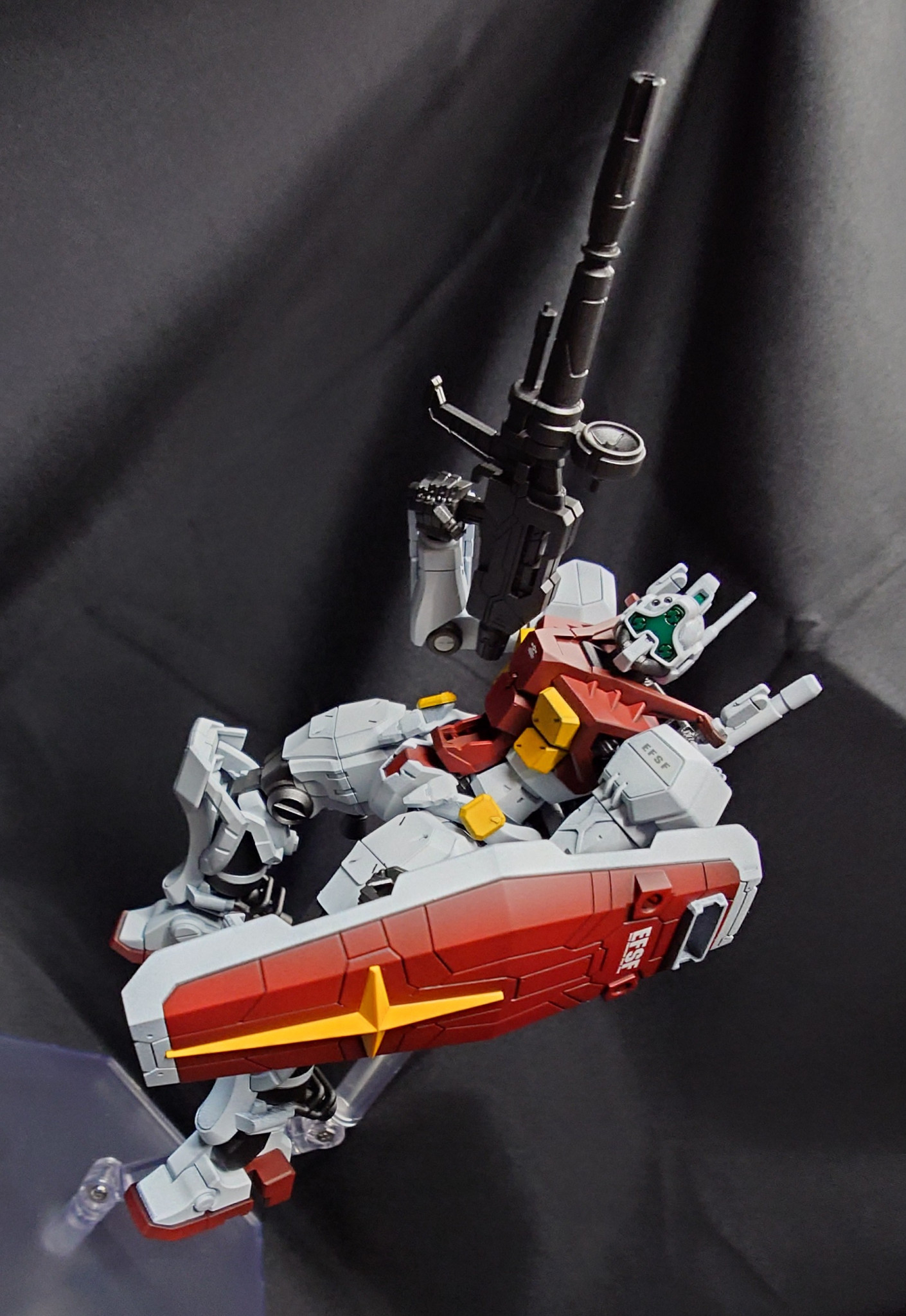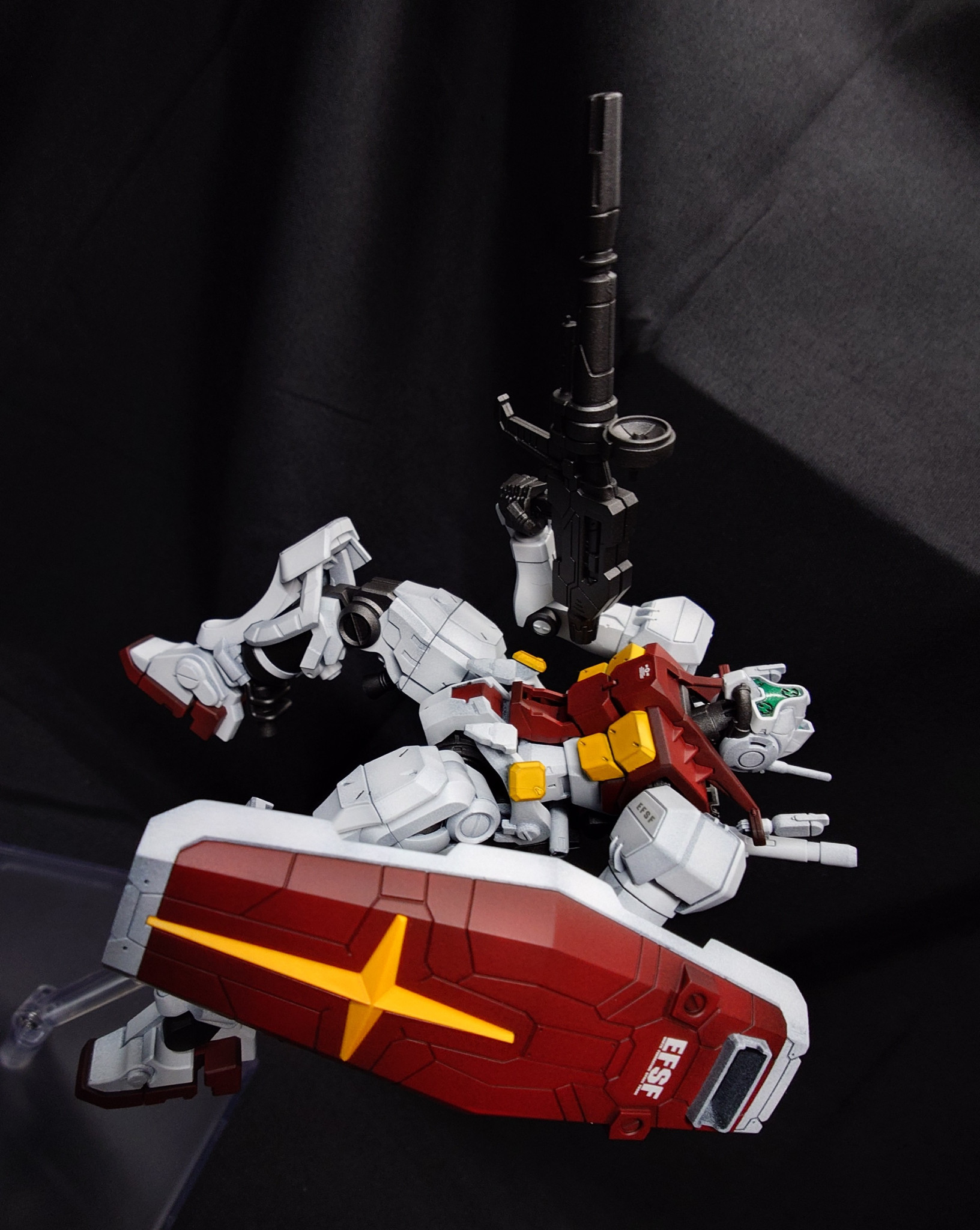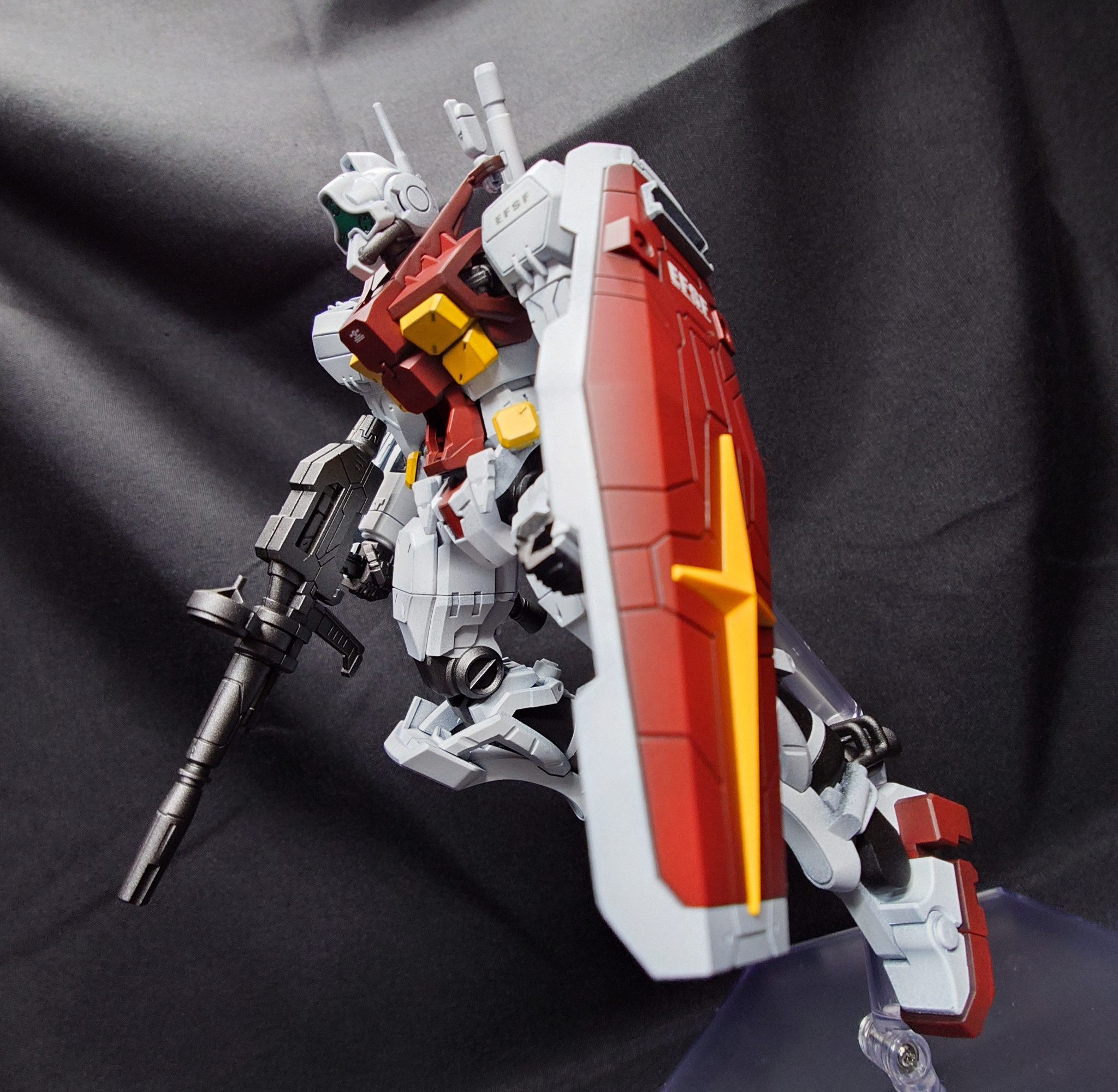 カラーリングはスガイ機に近いですが、よりジムらしい色合いで製作しました。ビームライフルとシールドはEG 万博ガンダムからの流用です。万博ガンダムはディテールが細かいので、GQキットとの親和性は高いです。