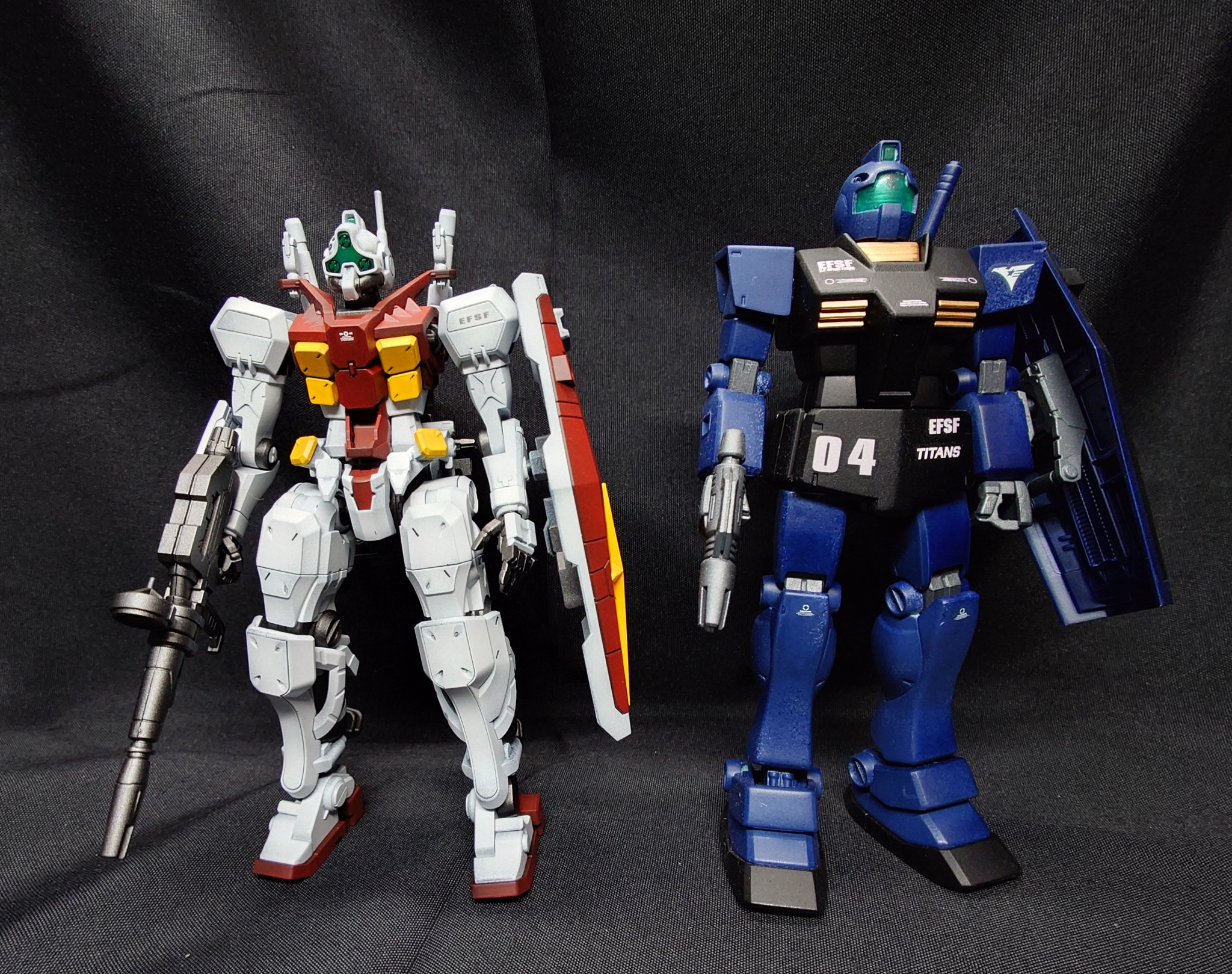 HGGQ ゲルググ ボカタ機を改造+全塗装でジムっぽいG(e)Mを製作しました。黄色部以外は黒立ち上げで塗装に重量感を持たせています。GQキットはディテール多めなので、デカールは最小限に留めています。バックパックの取り付けには少し悩みましたが、ジムの日に間に合ってよかったです。