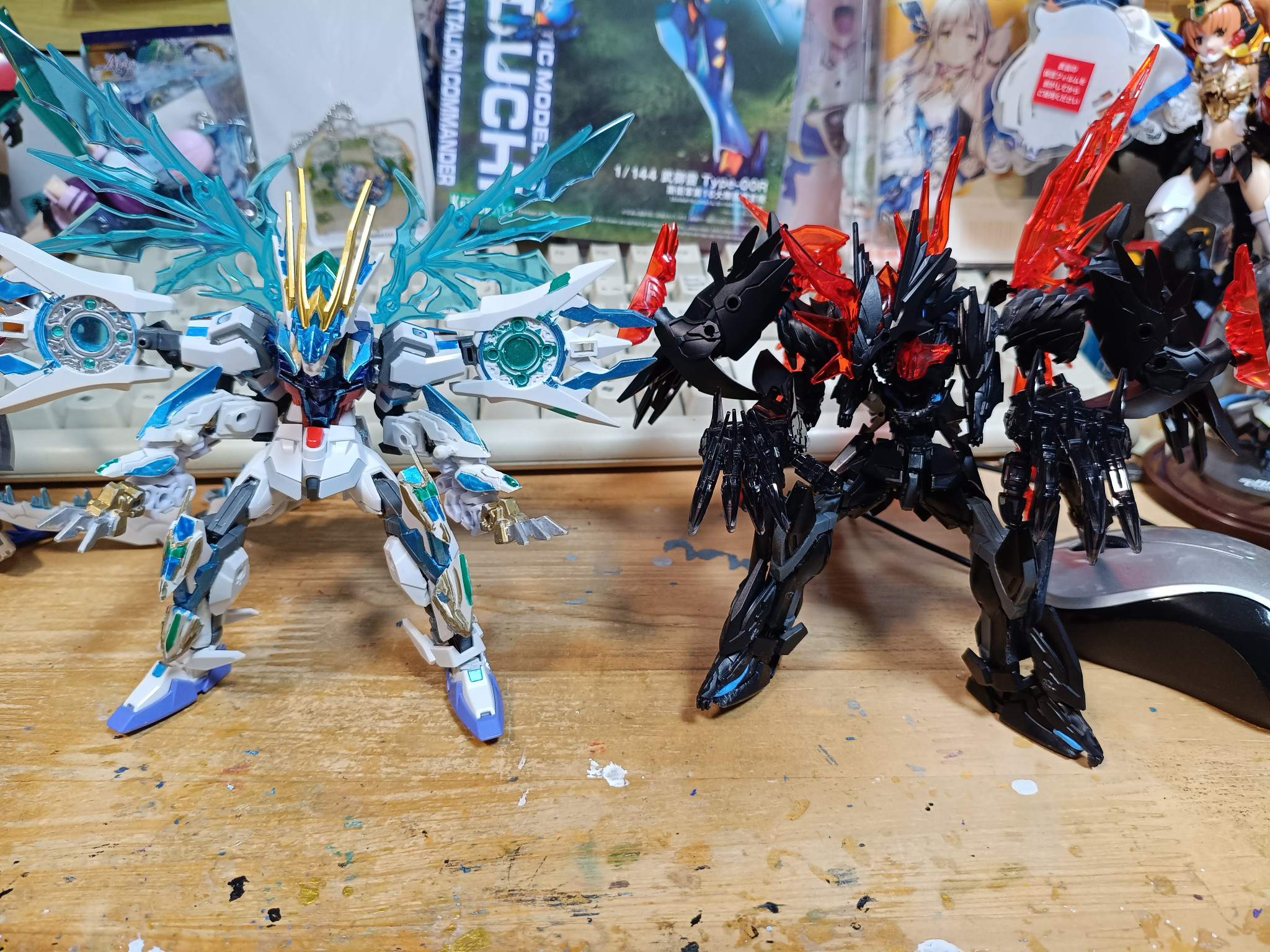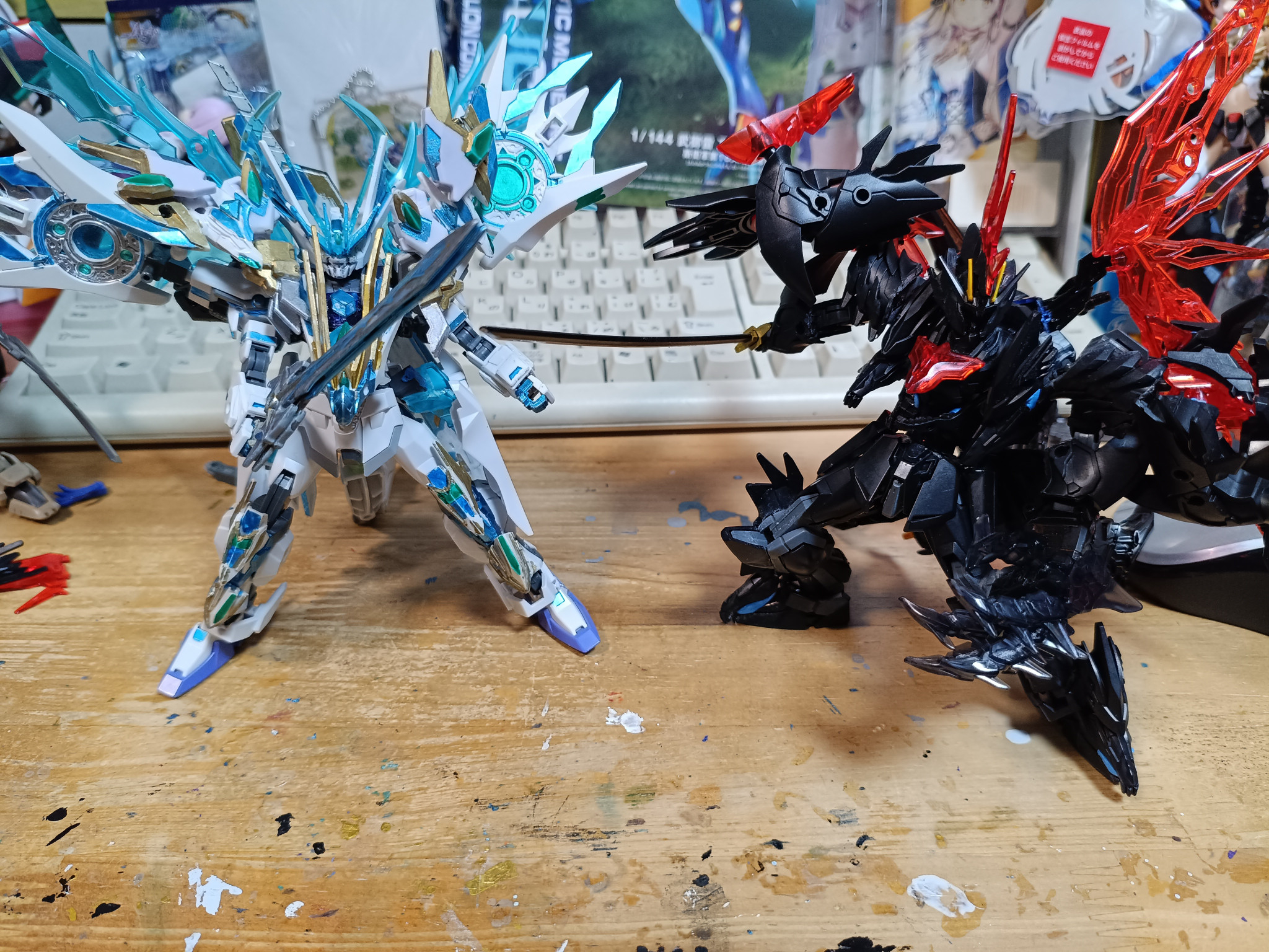 ブルーアイズストライクドラゴンとレッドアイズブラックドラゴンを並べて見たまあブルーアイズは少しドラゴンモードのパーツを別箱にしまったので完全なドラゴンモードではないです