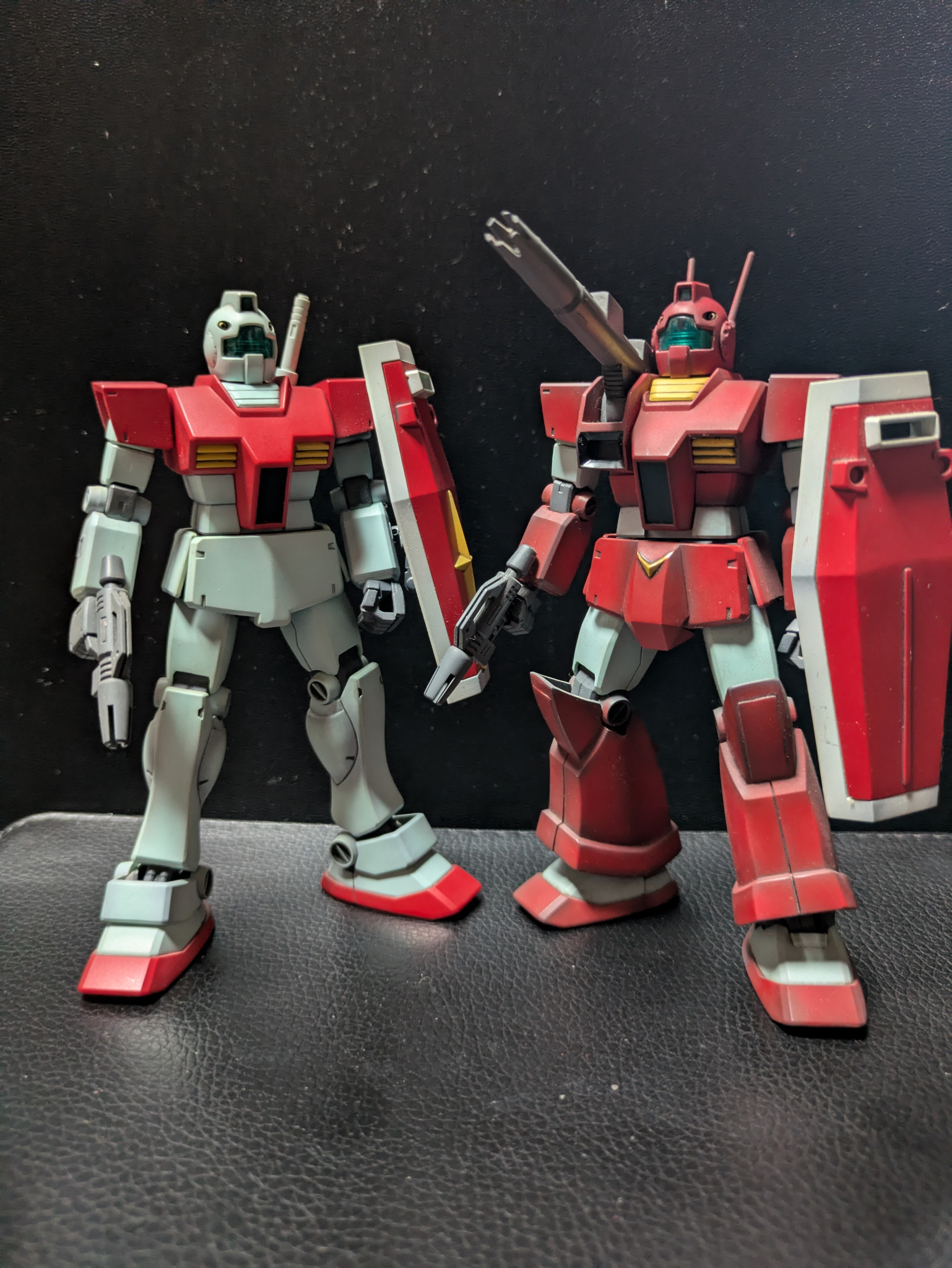 随分昔に製作したHGUCジムと旧キットのジムキャノンミキシングの2体です😊
