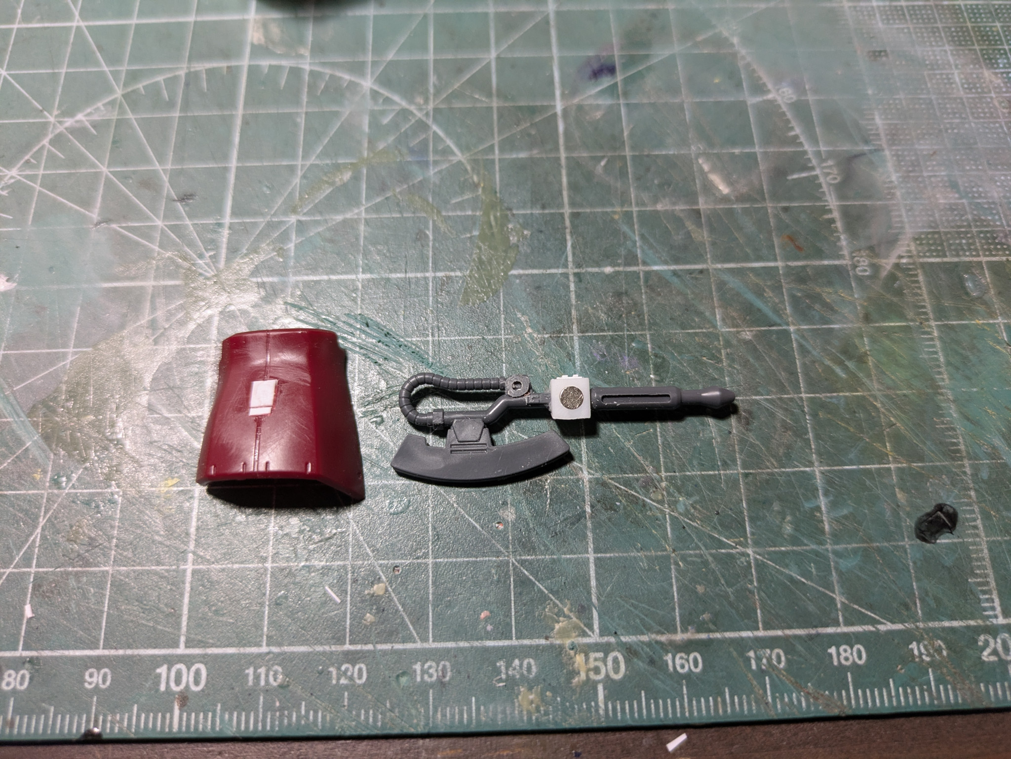 格納状態のヒートホークと腰アーマーにはネオジムを仕込みました