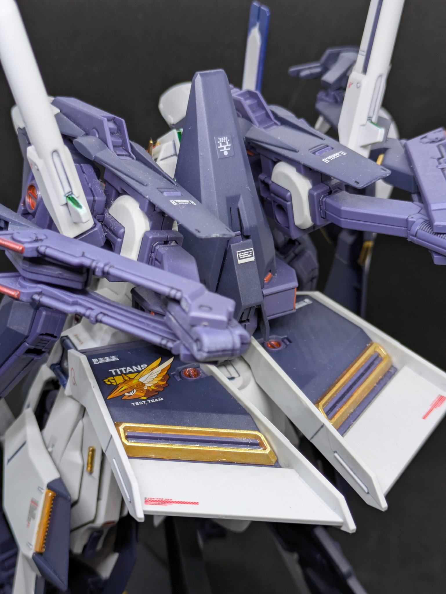 各部にあるロールバーのような部分はメタリックレッドで塗装しています。他はツインアイ、センサー部分のメタリックイエローグリーン、マルイチモールドのガンメタルとメタリックレッド、紺色の足りない箇所をティターンズブルーで塗りました。