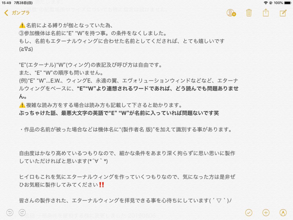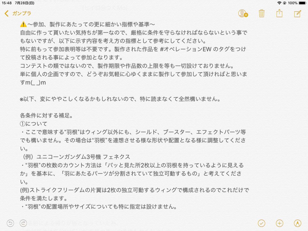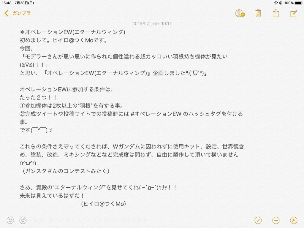 以下の写真にオペレーションEWについて詳細を載せたので、よければチェックして皆さん思い思いの羽根モノ機体を作ってみてください( ´ ▽ ` )ノ