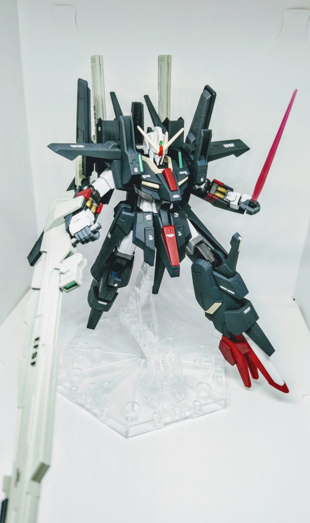 特徴的な武装のロングビームライフルは、撮影ボックスに入りきらないくらい長いです。