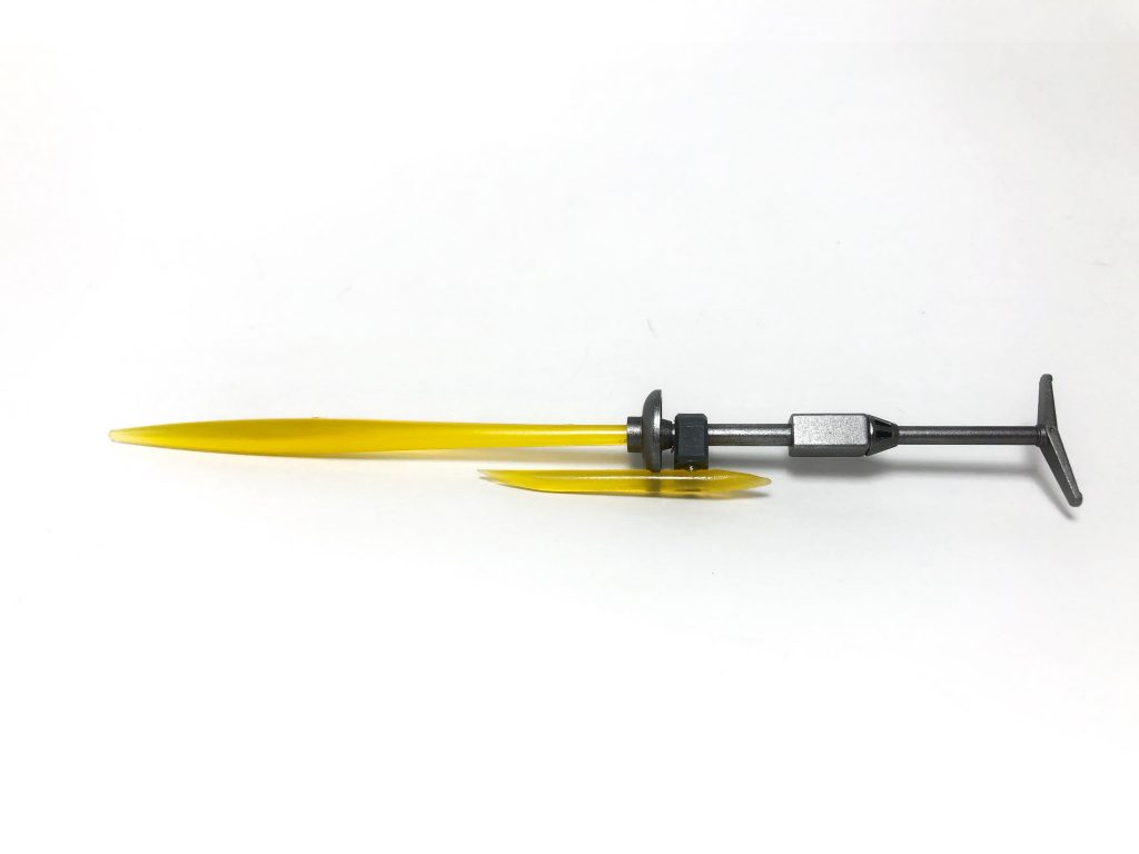 実はギャンのビームサーベル持ち手を別のミキシングに使用した為、ランナーで別途作成。ついでにカスタマイズキャンペーン品ビームランチャーで余ったパーツとギャンのビームサーベルが付いてたランナーを加工してビームジュッテを作りました。