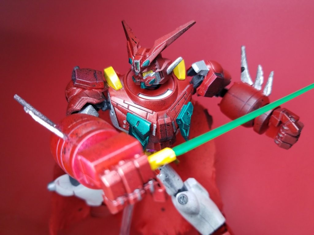 機体の汚れは機体完成後に試運転をせずにぶっつけで野良インベーダーと交戦、インベーダーの返り血がかかったままドモンとガンダムファイトをしたため血が取れなくなったというロマン設定です😻