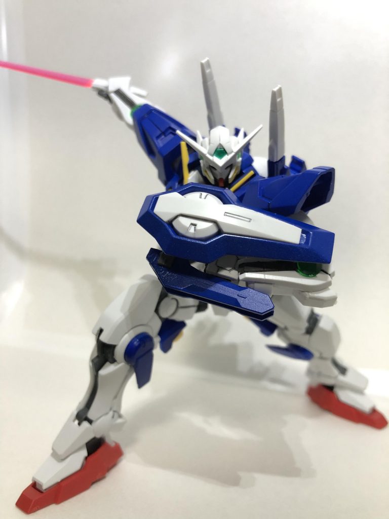 可動範囲の拡大が目的なので塗装や武器にはそこまで力を入れていません。GNソードのソードを取っ払い、シールド+ライフルとして左腕に接続。